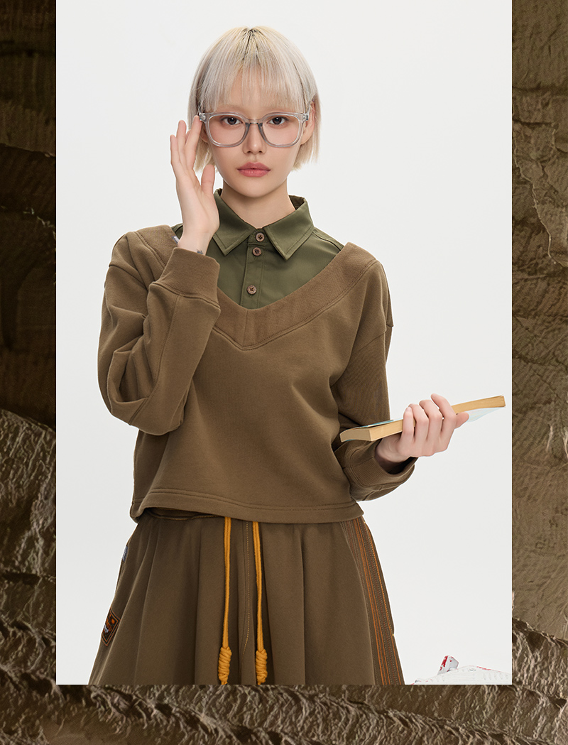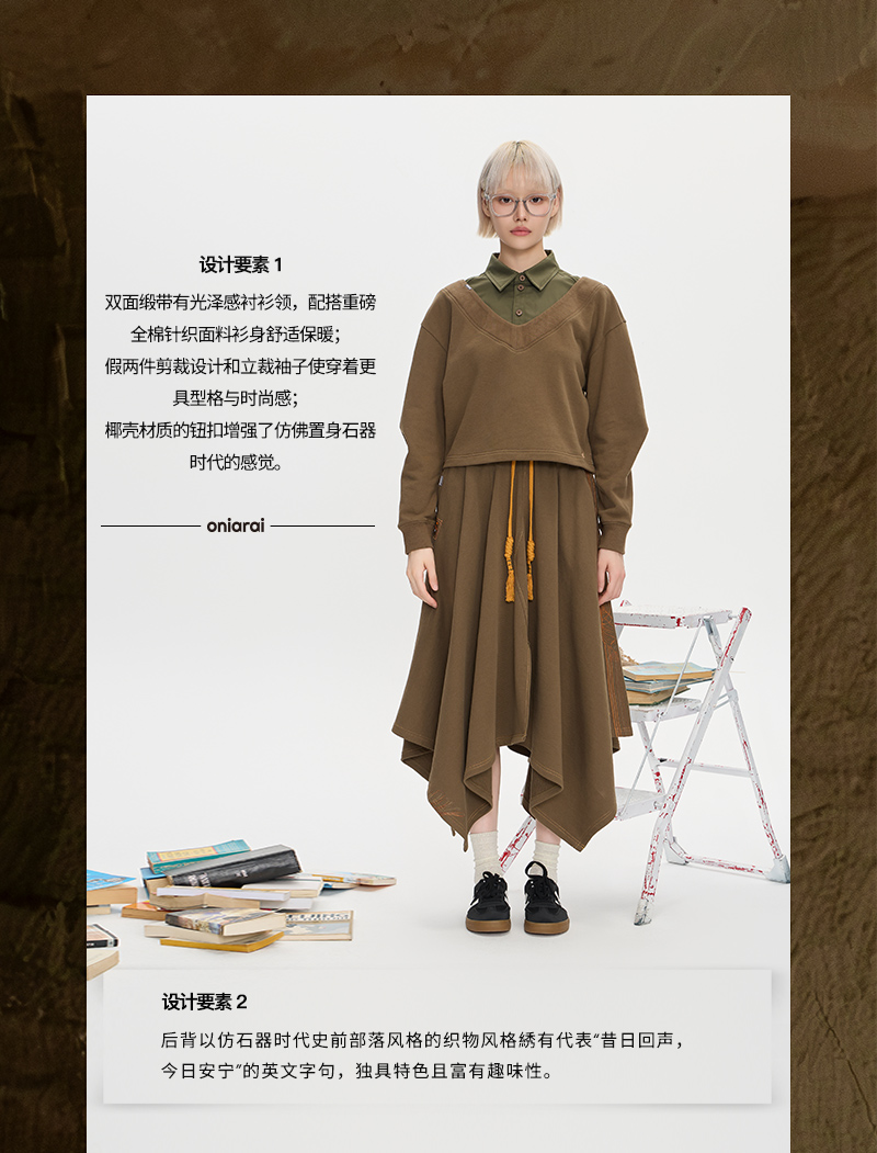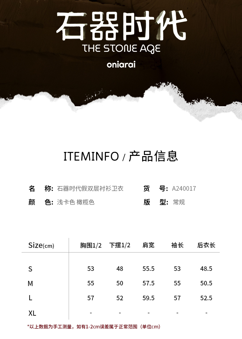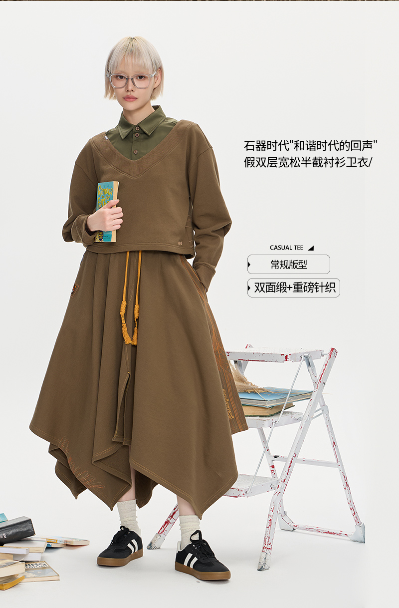 ONIARAI/鬼洗25秋冬黑标石器时代假双层宽松半截衬衫卫衣 A240017