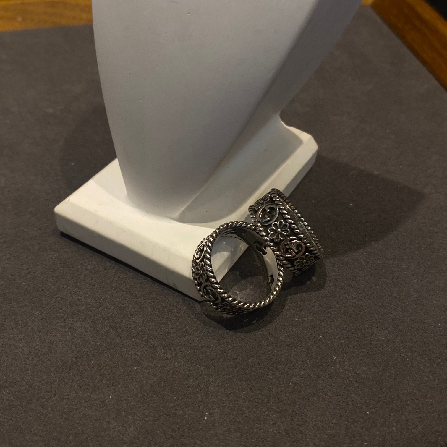 纯银做旧效果 边缘饰刻花饰带滚边 戒环饰雕刻花朵和互扣式双G 镂空图案 花朵图案与互扣式双G镂空图案交替呈现,边缘匠心添加饰带织纹滚边,令这款刻花纯银戒指倍显精致气息 size:10-24