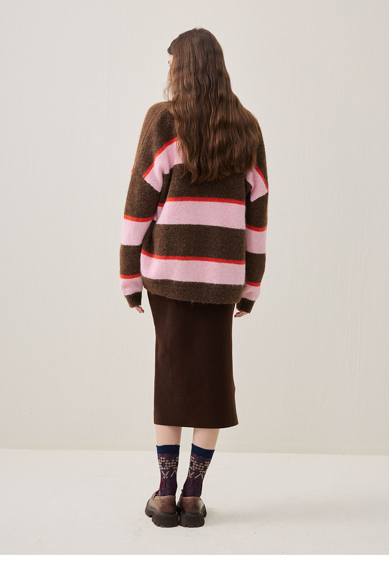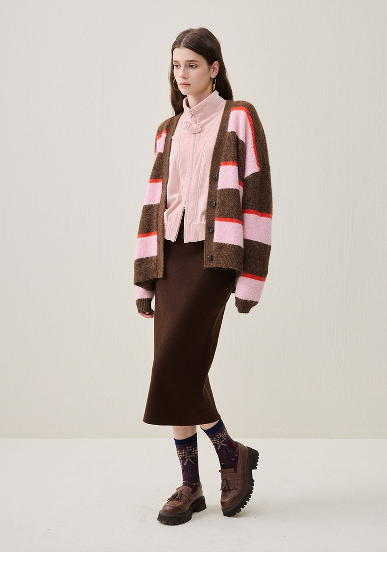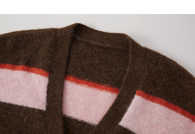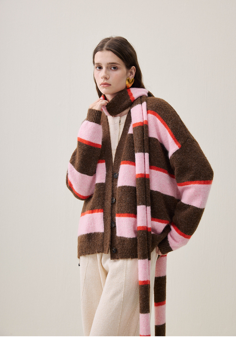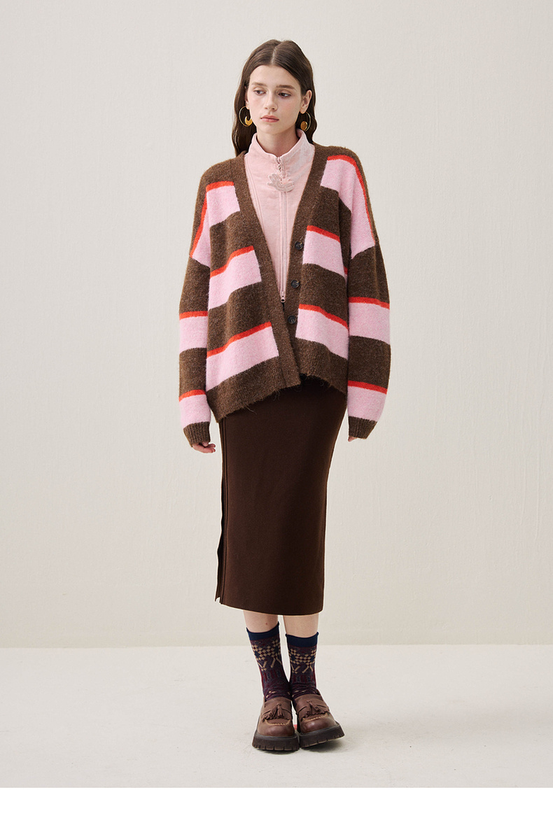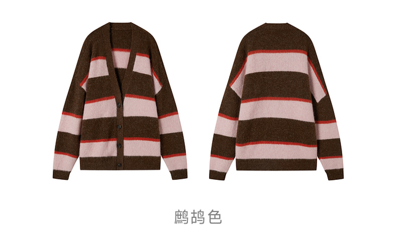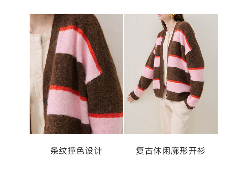 谜底V领针织开衫长袖2025年冬季新品亲肤柔滑条纹毛衣女254MZ1905