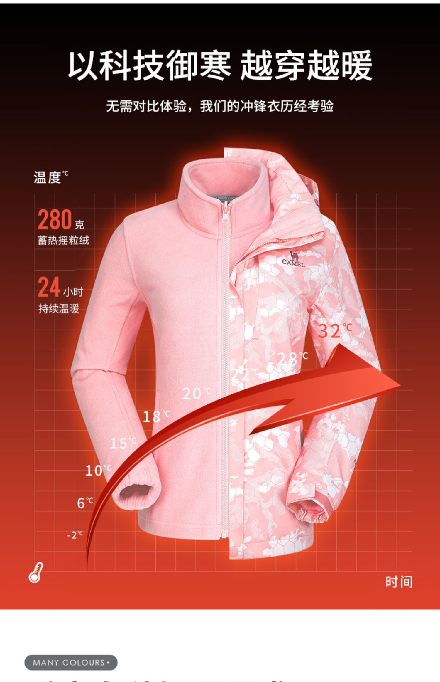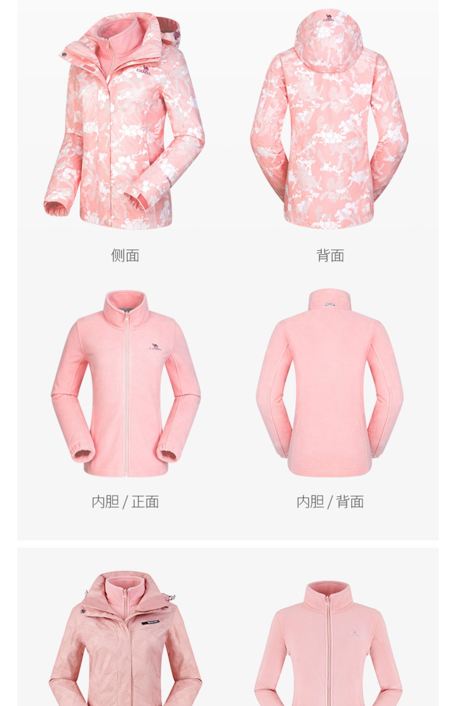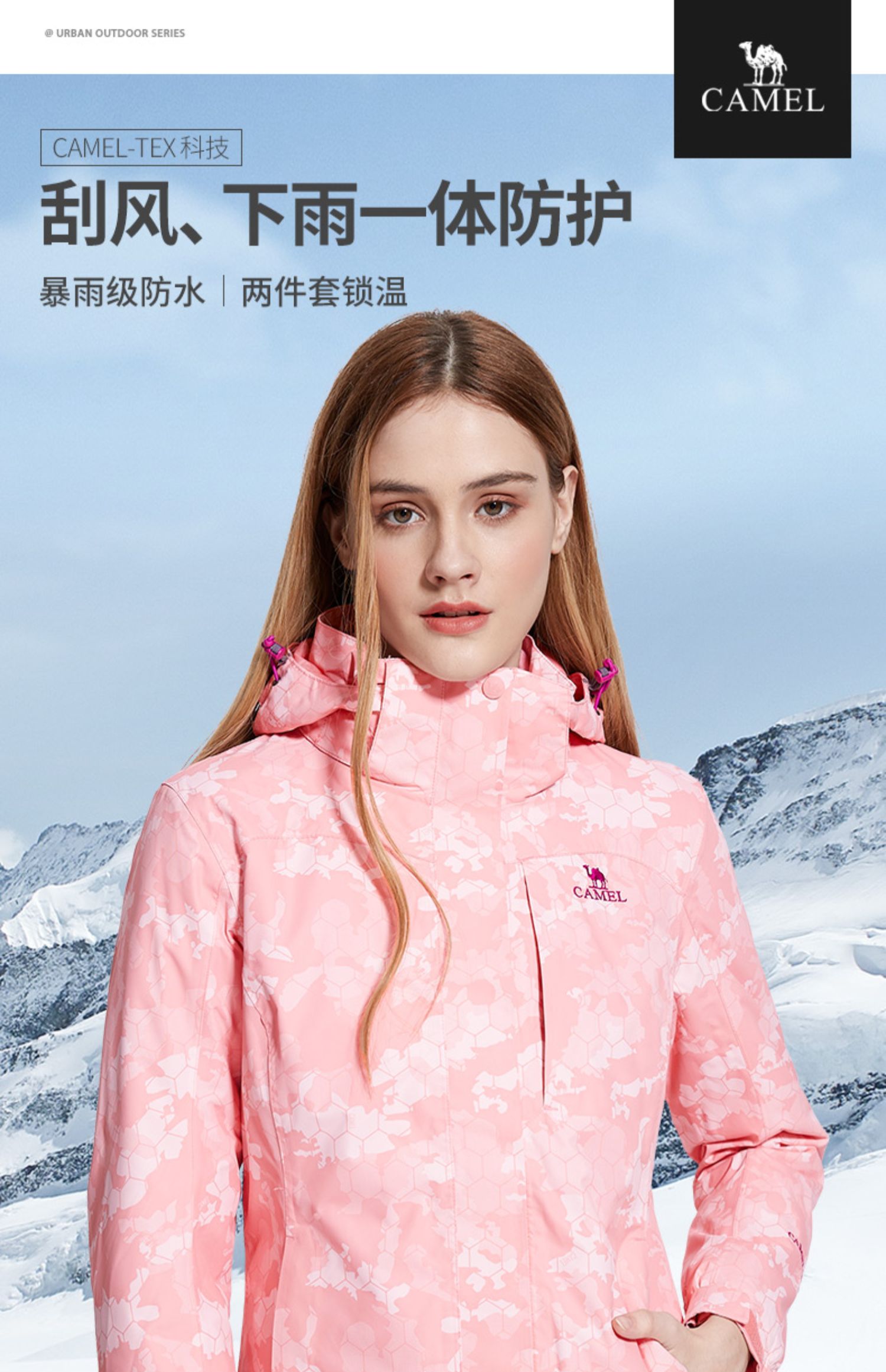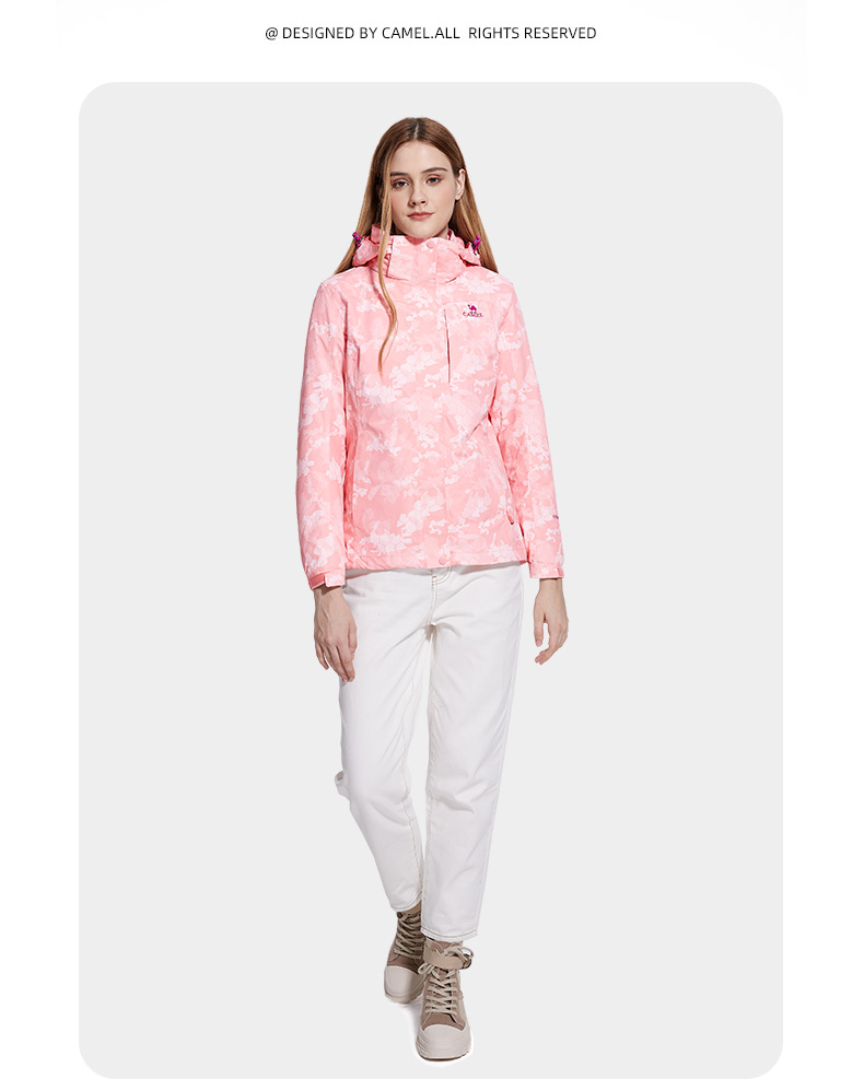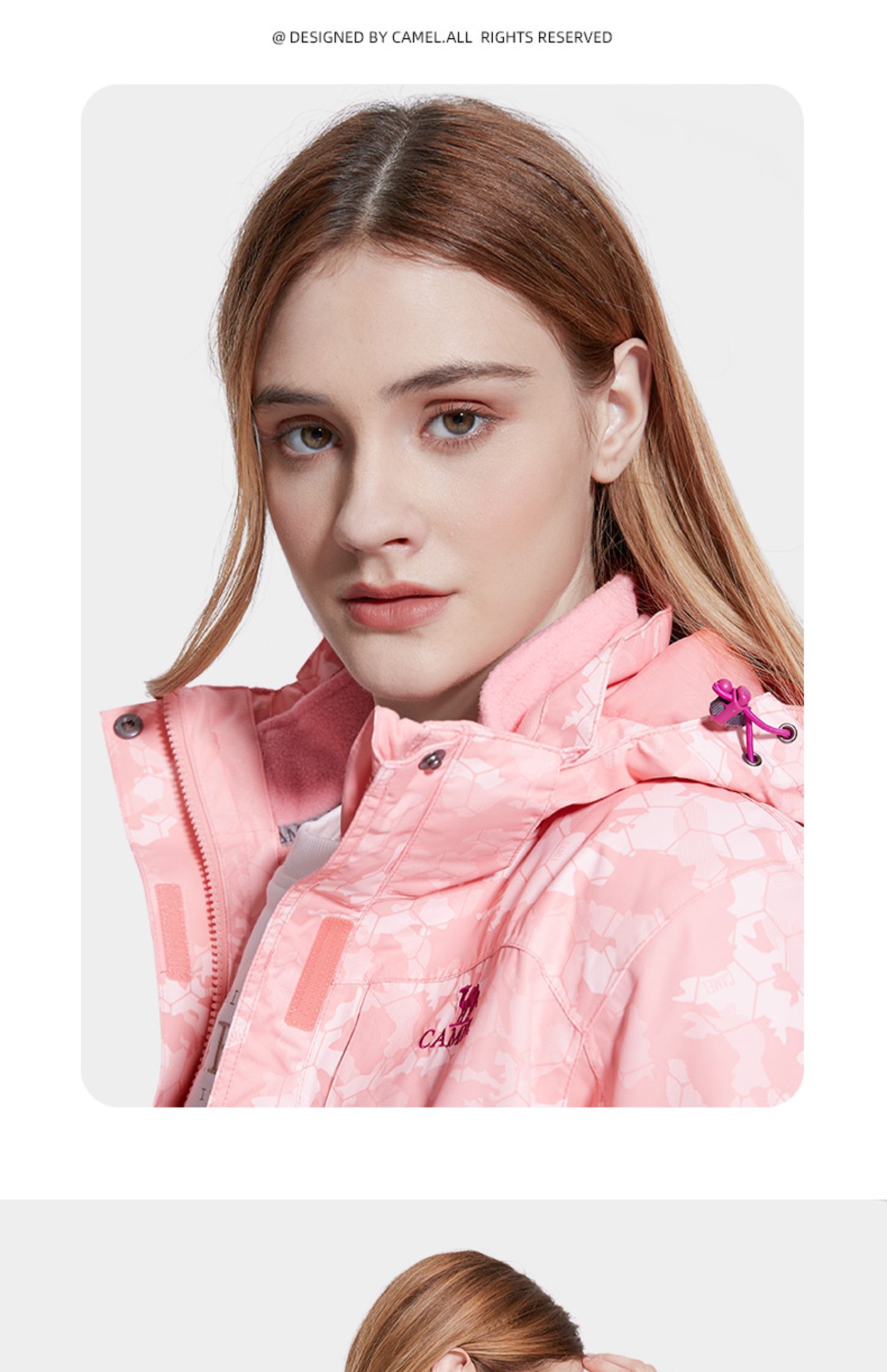 骆驼户外冲锋衣女三合一可拆卸冬季防风防水粉色迷彩抓绒保暖外套T1W146143