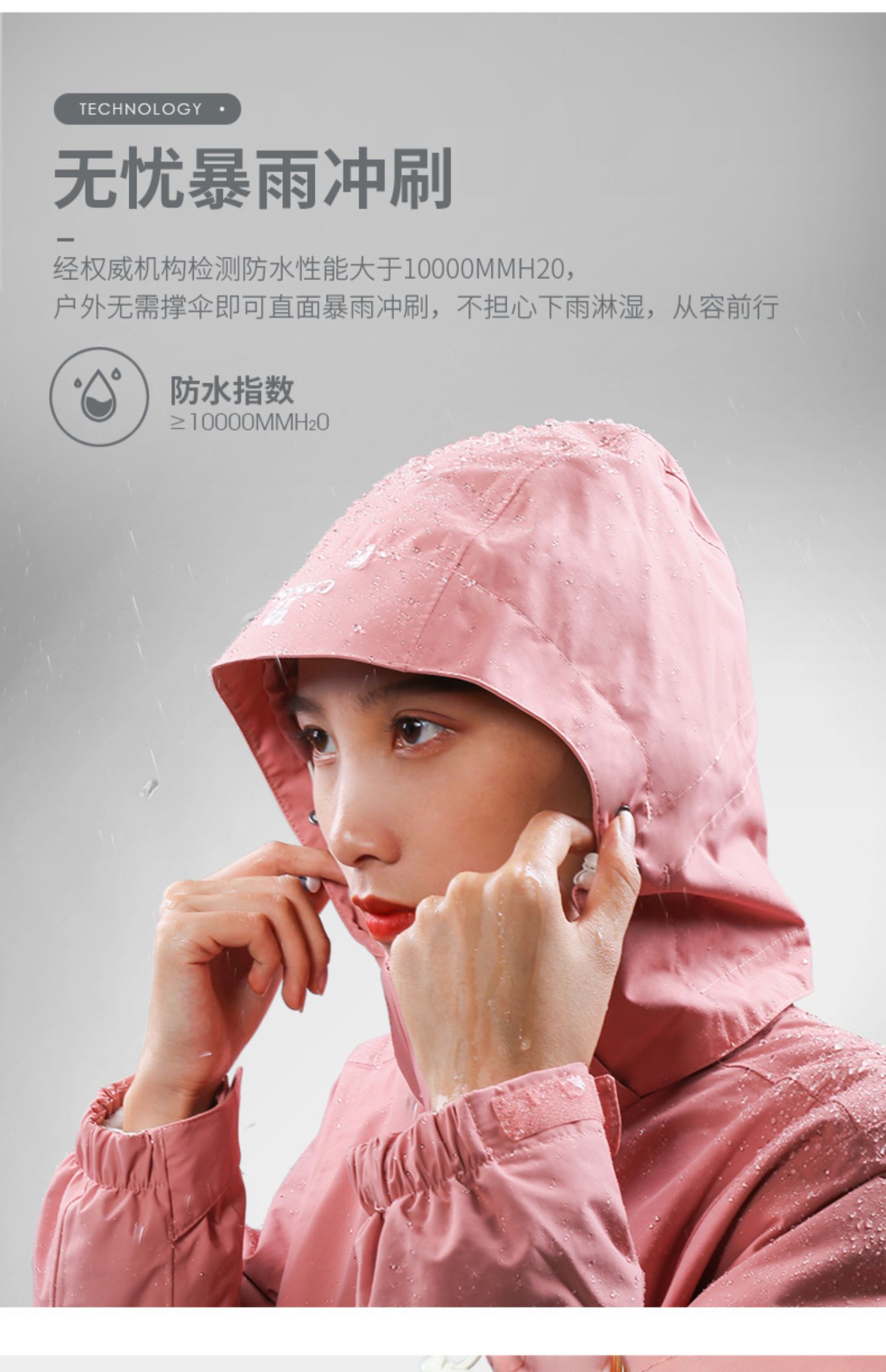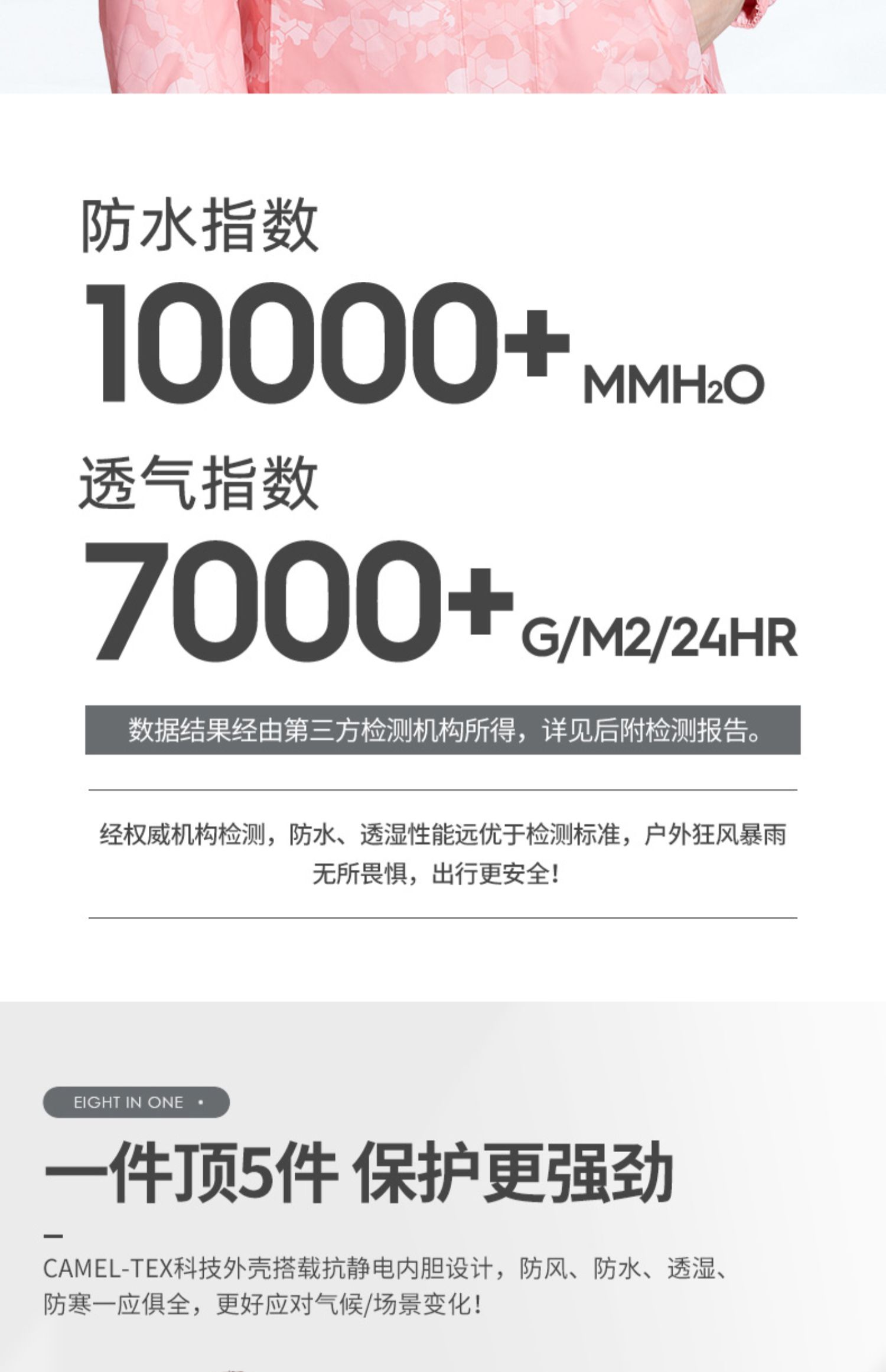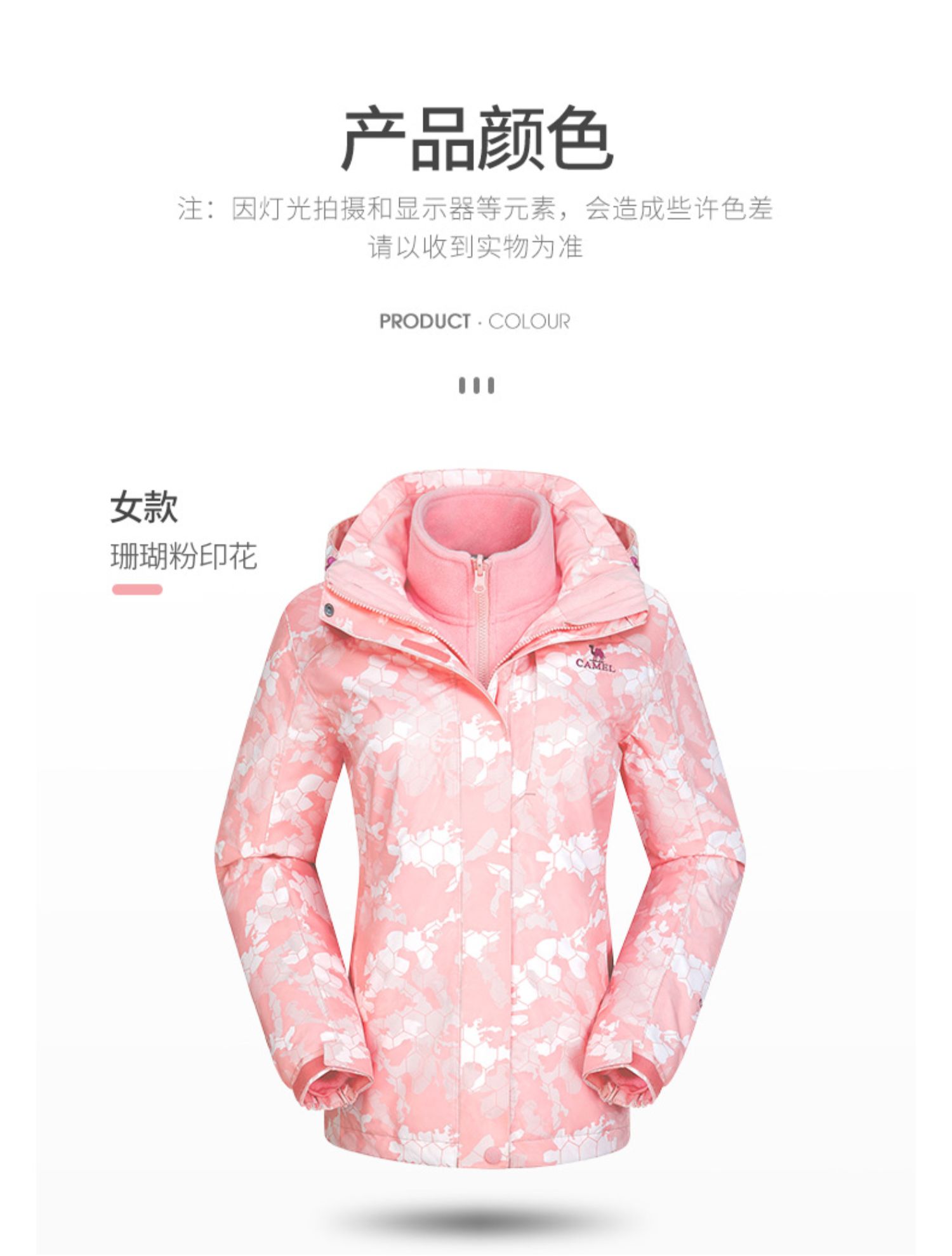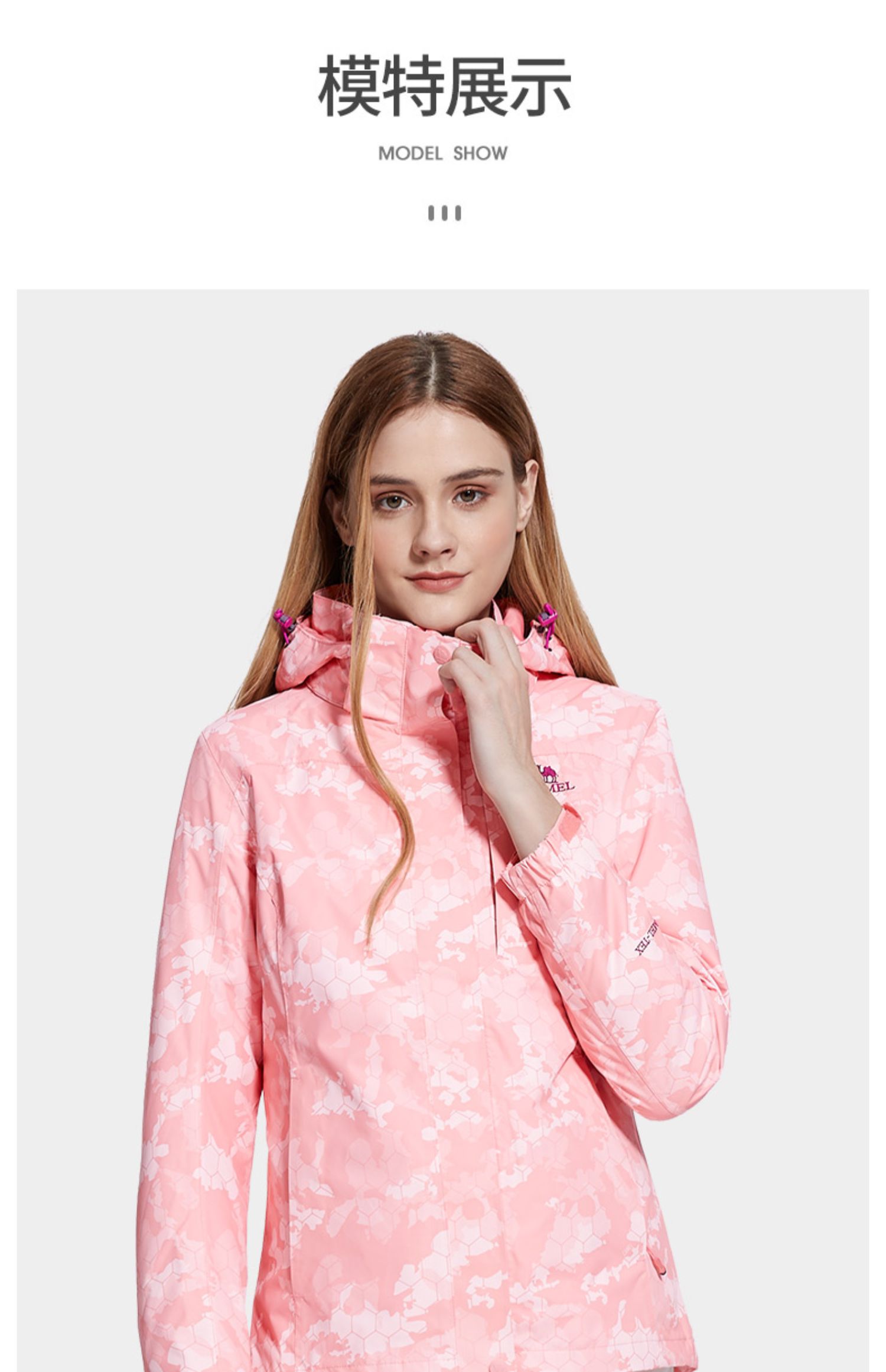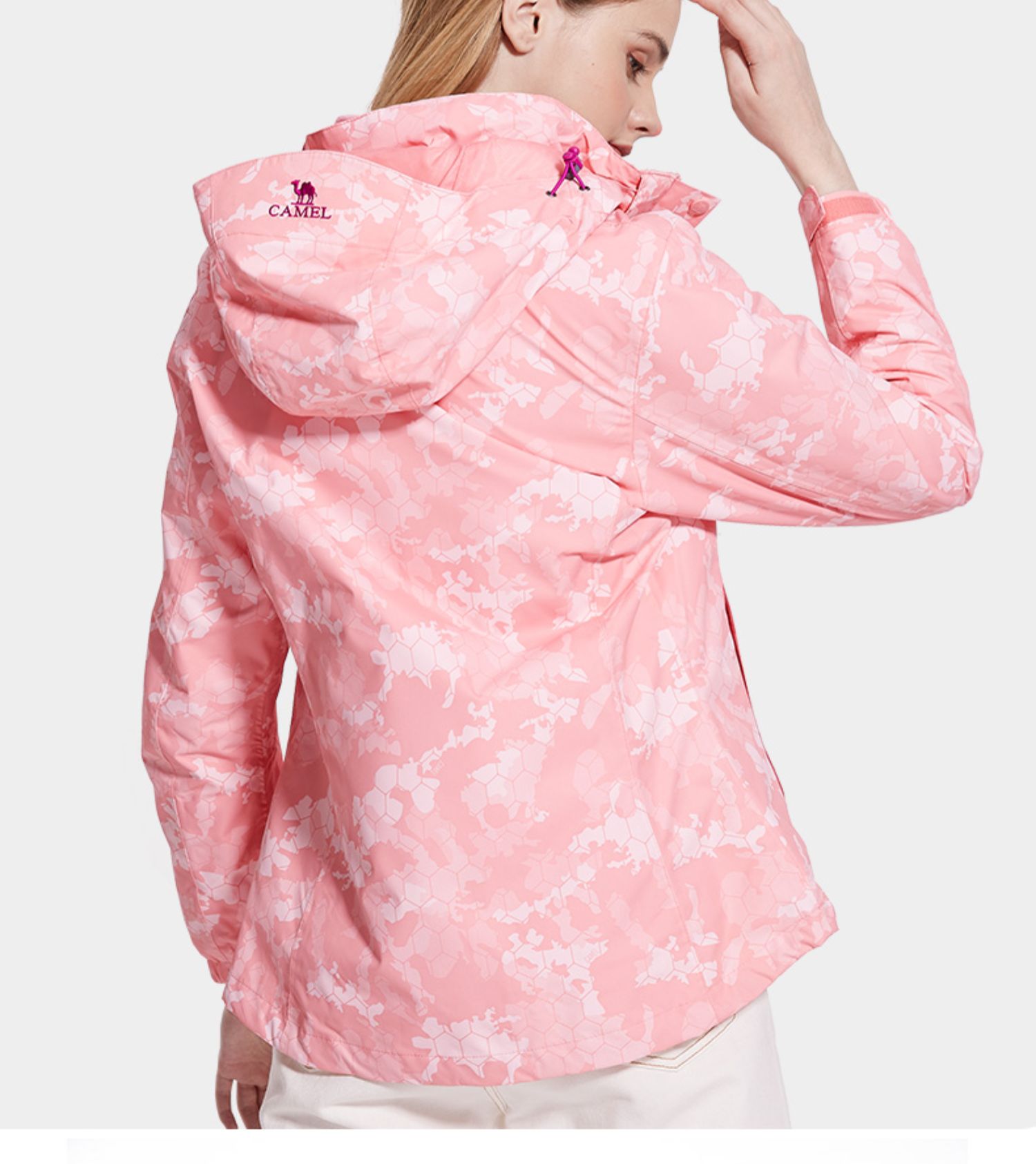 骆驼户外冲锋衣女三合一可拆卸冬季防风防水粉色迷彩抓绒保暖外套T1W146143