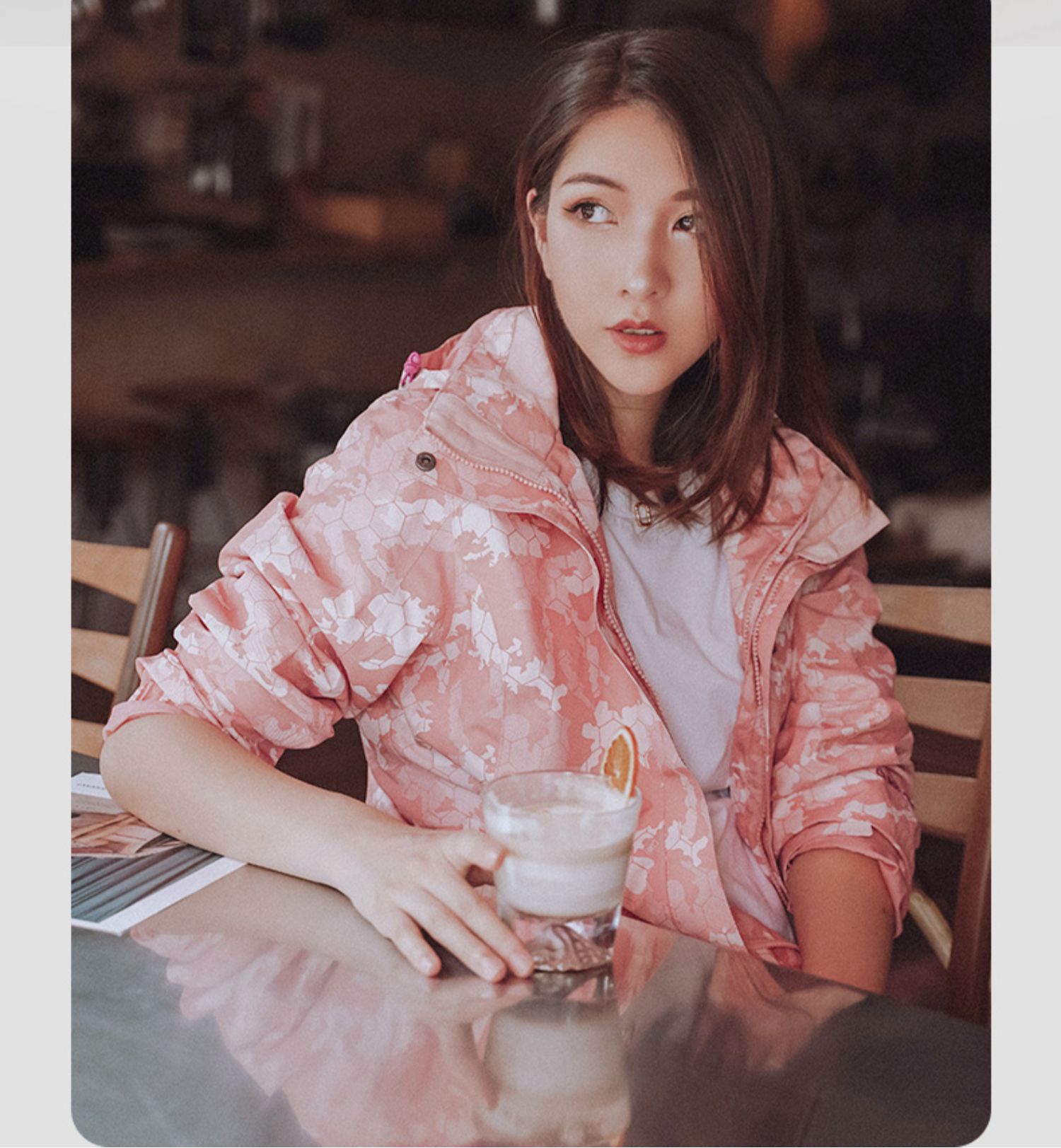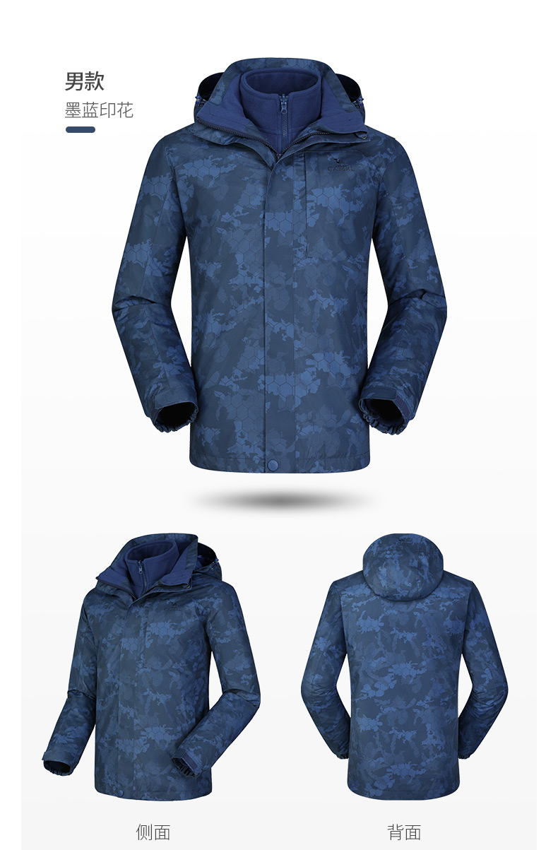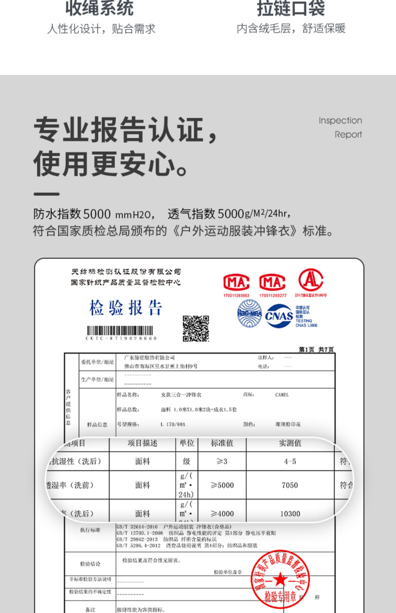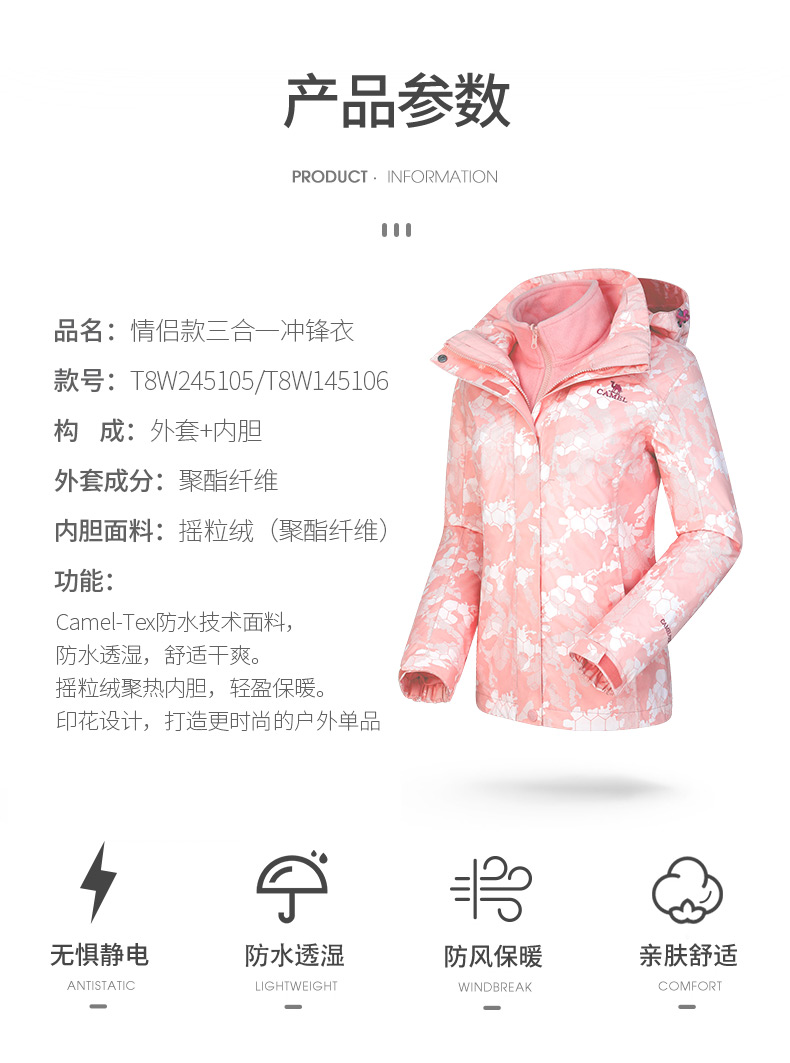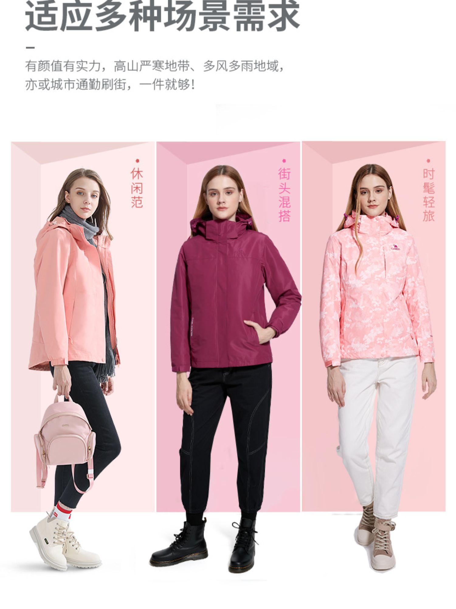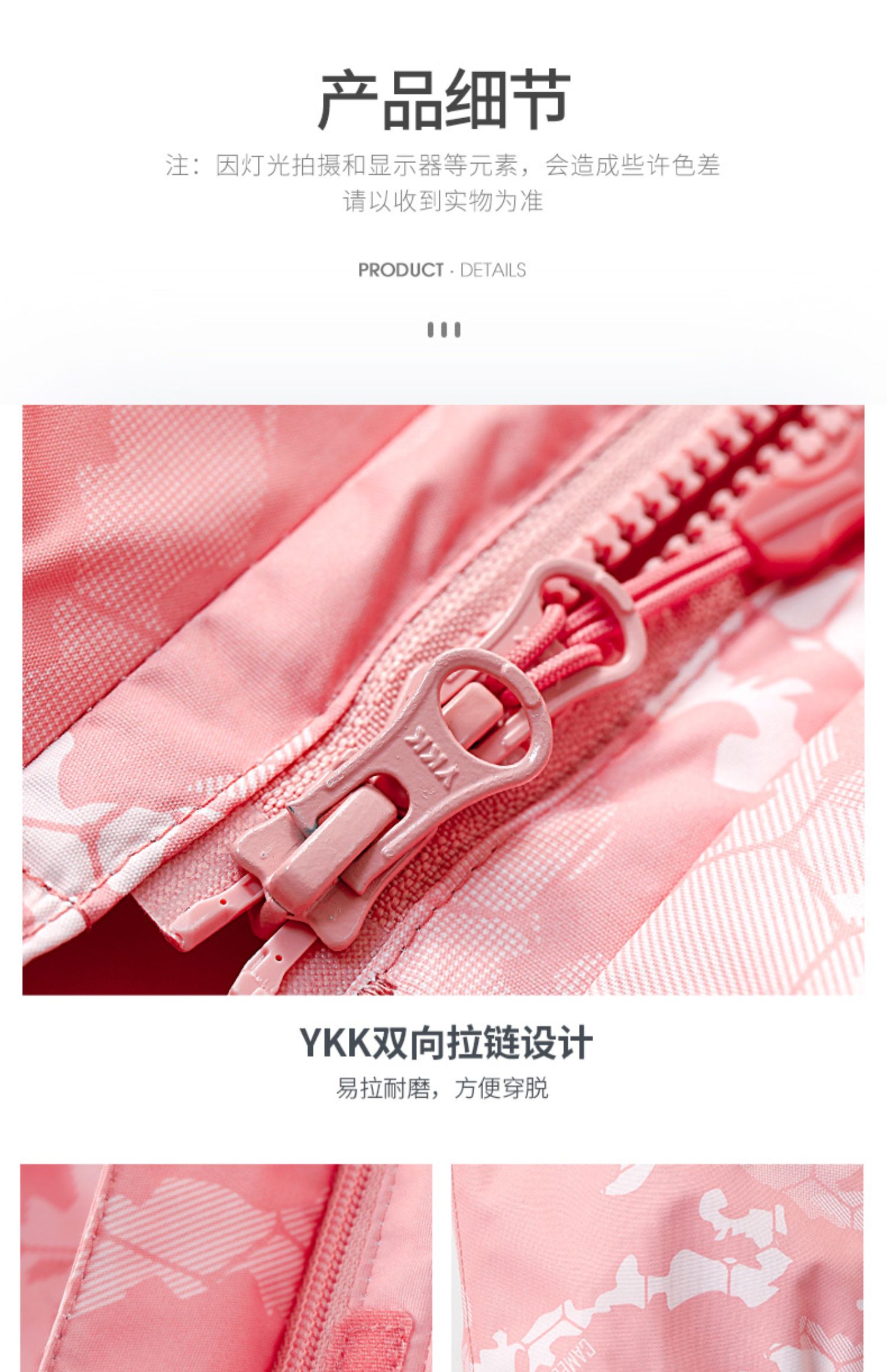 骆驼户外冲锋衣女三合一可拆卸冬季防风防水粉色迷彩抓绒保暖外套T1W146143