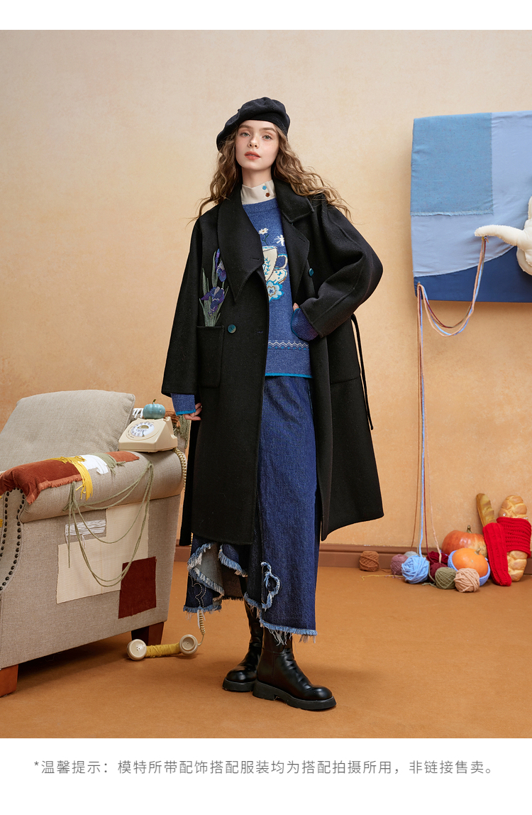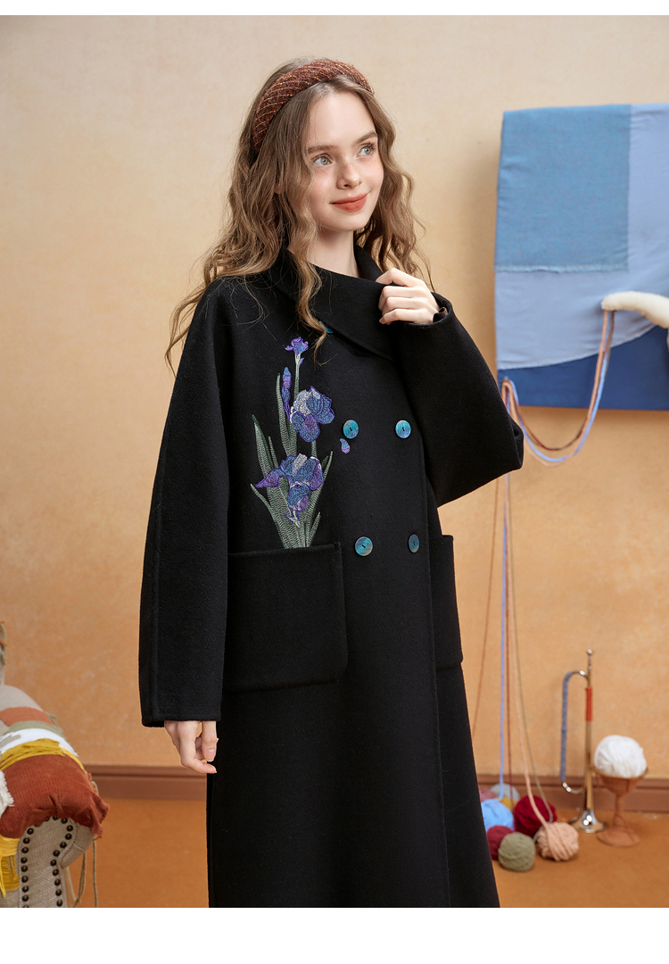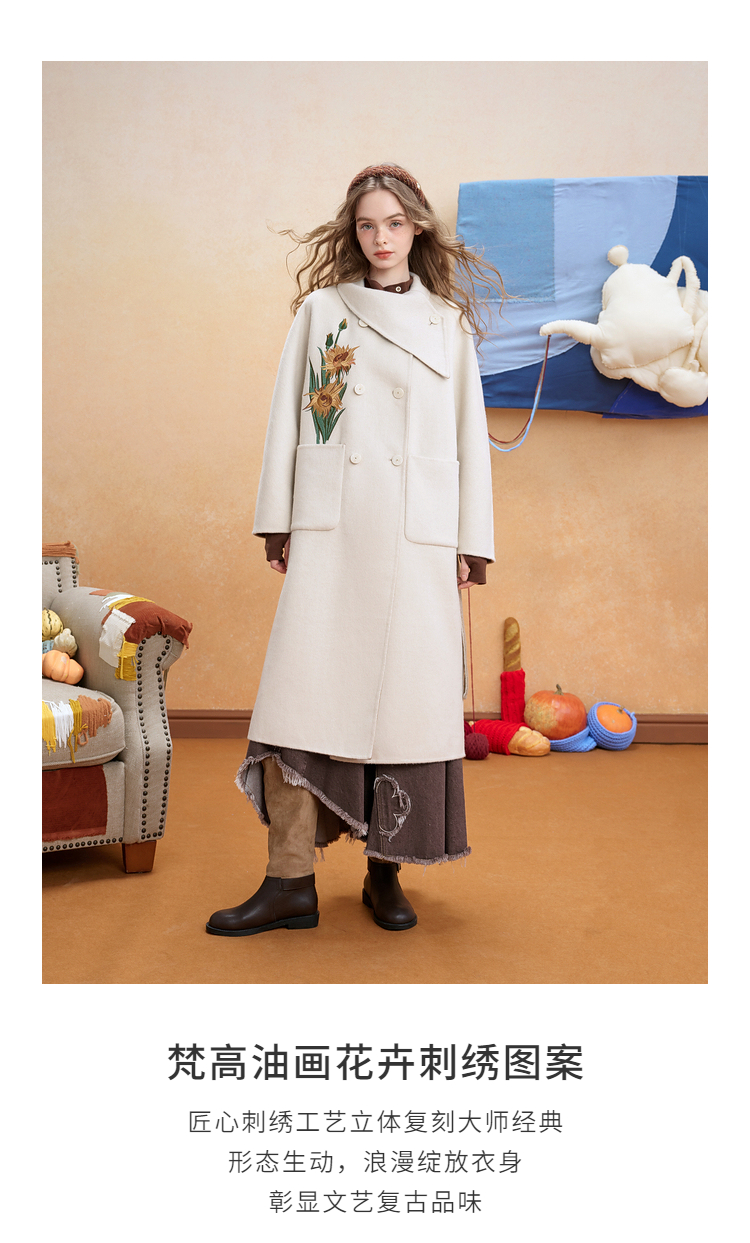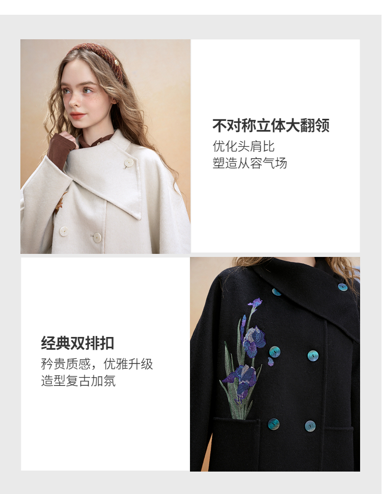 【暖冬内购】两三事梵高文艺花间月眠2025冬新款绣花围脖翻领双面羊毛呢外套女
