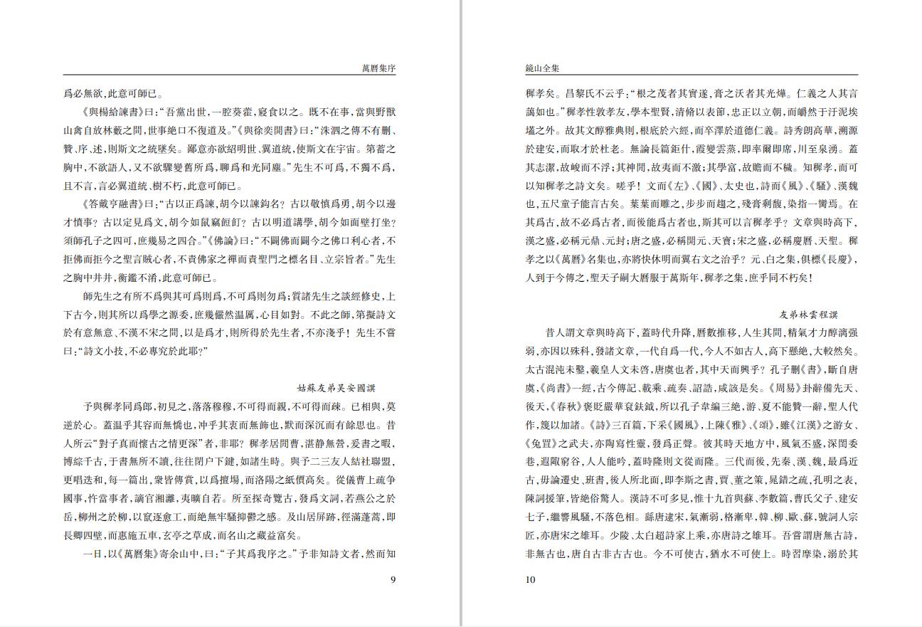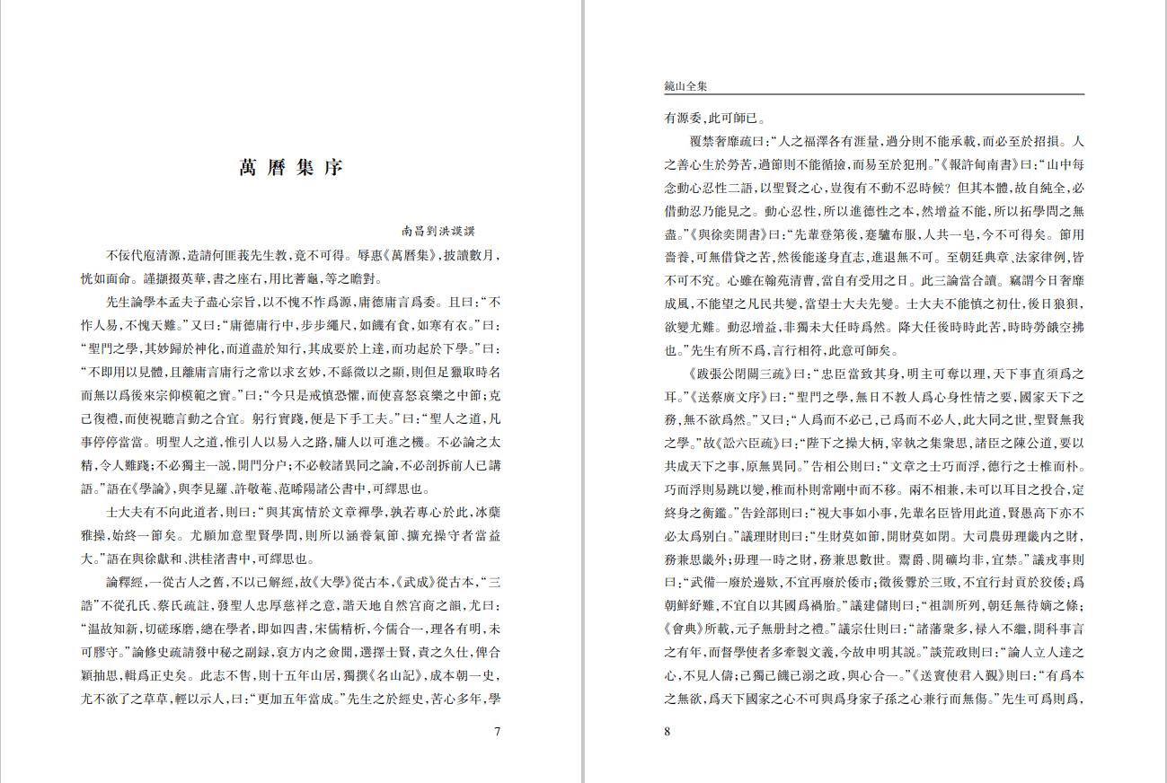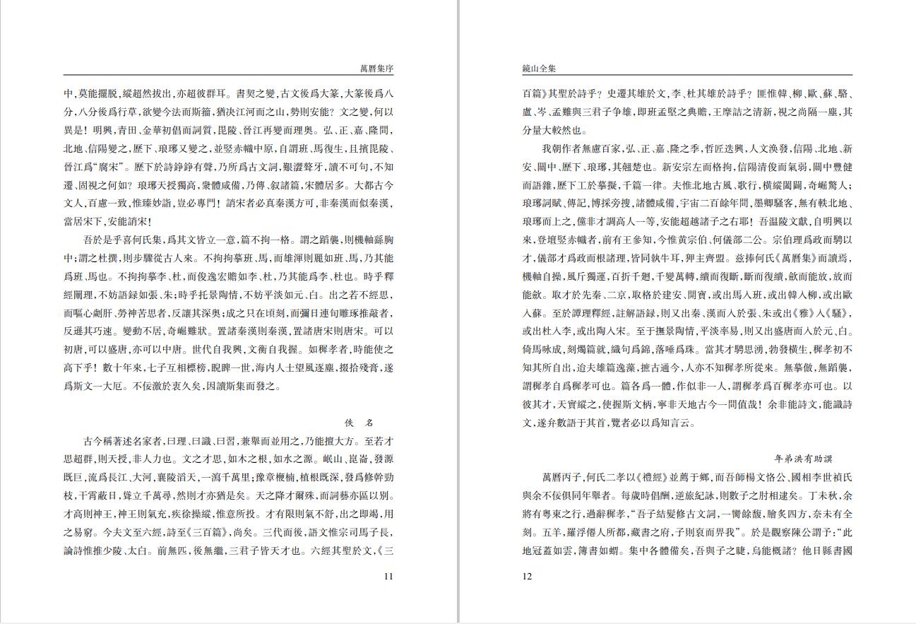 《镜山全集》为何乔远的诗文合集,凡七十二卷,包括了赋、各体诗、释经、释骚、序、跋、墓志铭、祭文、行状、书札等诸多体裁。其同代人及后学对其诗文评价甚高,称“先生之诗,融铸六朝,驾王、岑而跻陶、韦,七言歌行悲壮浑雄,则昔之青莲,今之崆峒也。大都文阐经指,关世教,绰有菁华。若志传、纪录,则断断迁、固、范、刘、荀、袁间,又非唐以下诸所能及也”云云。
