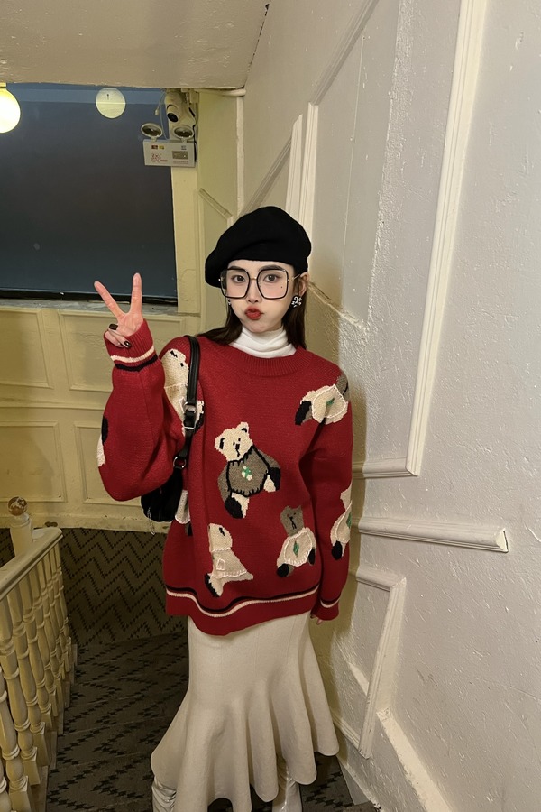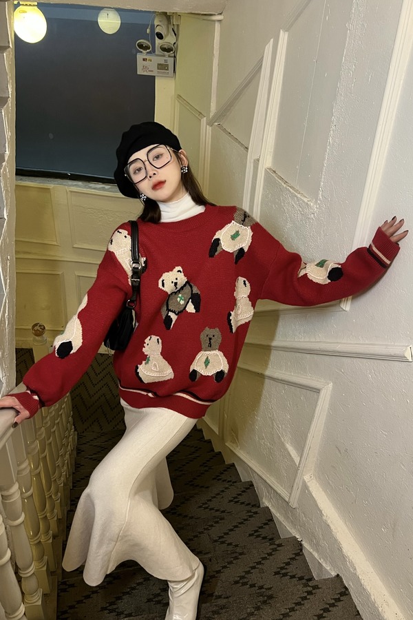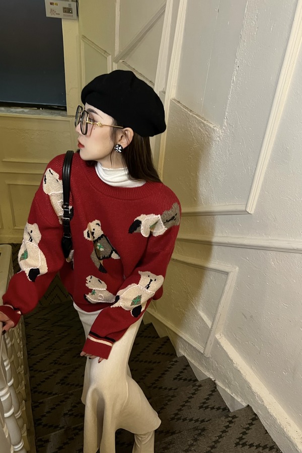 Stay2Weeks 酒红小熊图案针织上衣 17763