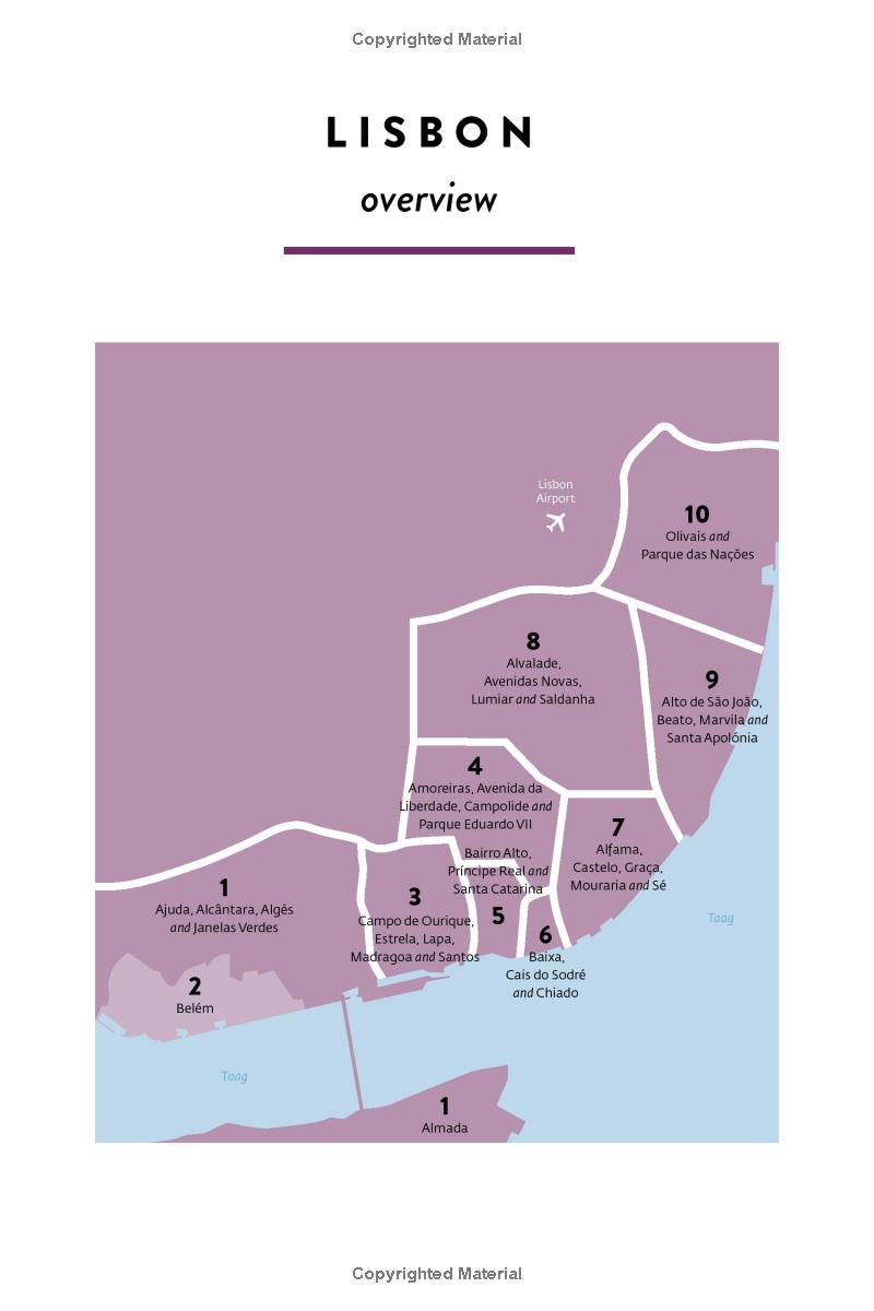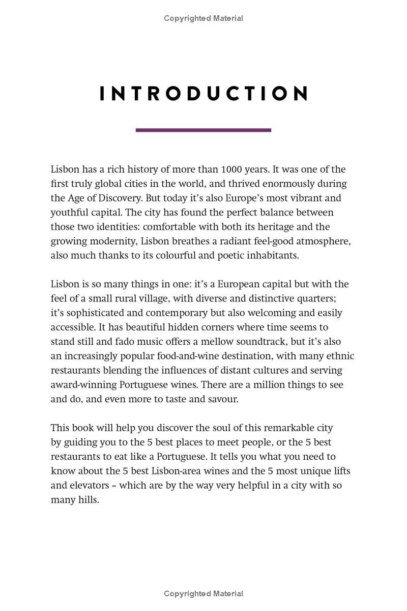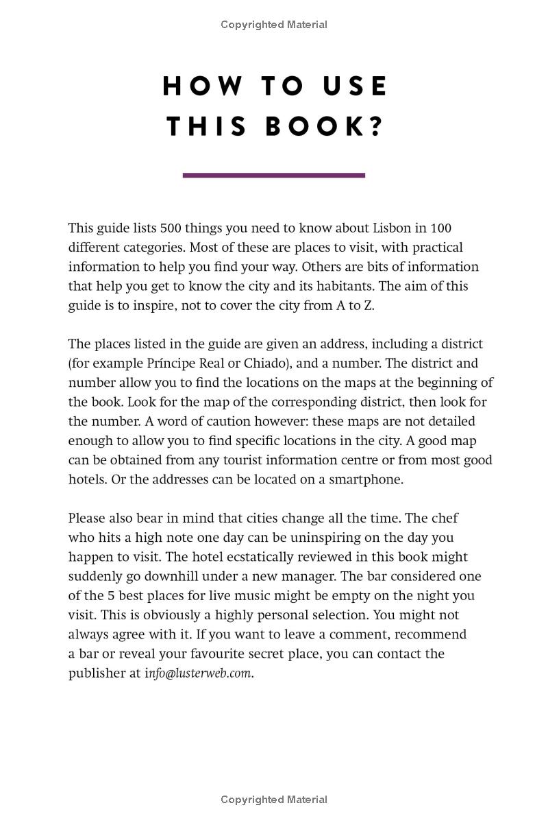 Contents: 105 Places to Eat Good Food; 65 Places for a Drink; 70 Places for Shopping; 25 Buildings to Admire; 45 Places to Discover the Real Lisbon; 80 Places to Enjoy Culture; 20 Things to Do with Children; 25 Places to Sleep; 45 Activities for the Weekend; 20 Random Facts & Helpful Hints."