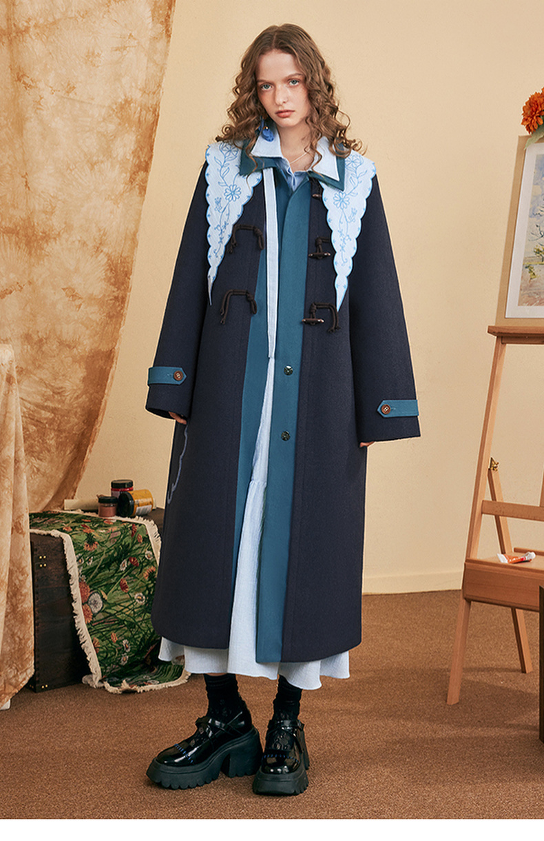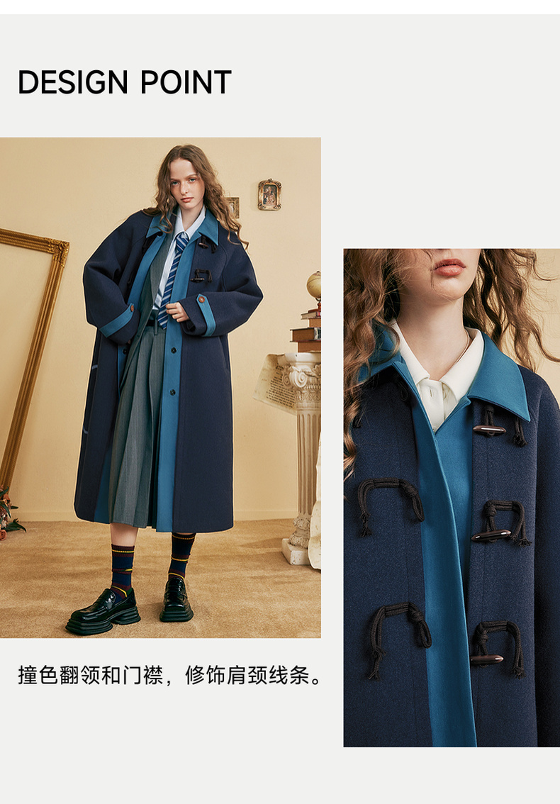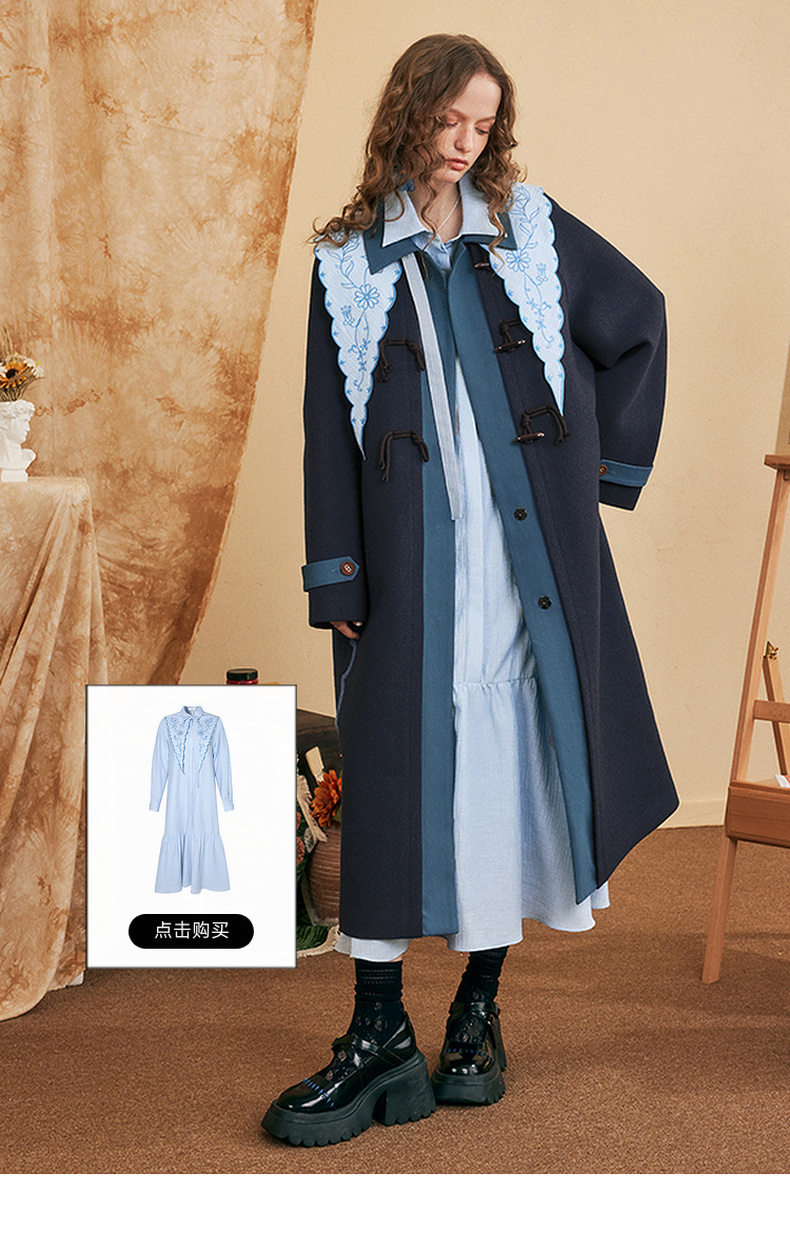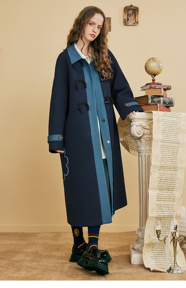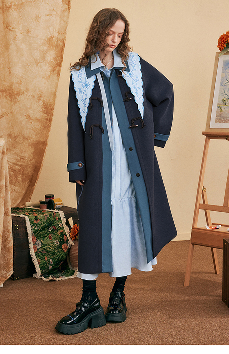 【暖冬内购】两三事 海上神探长 2024秋冬新款花朵毛巾绣拼色牛角扣毛呢外套女
