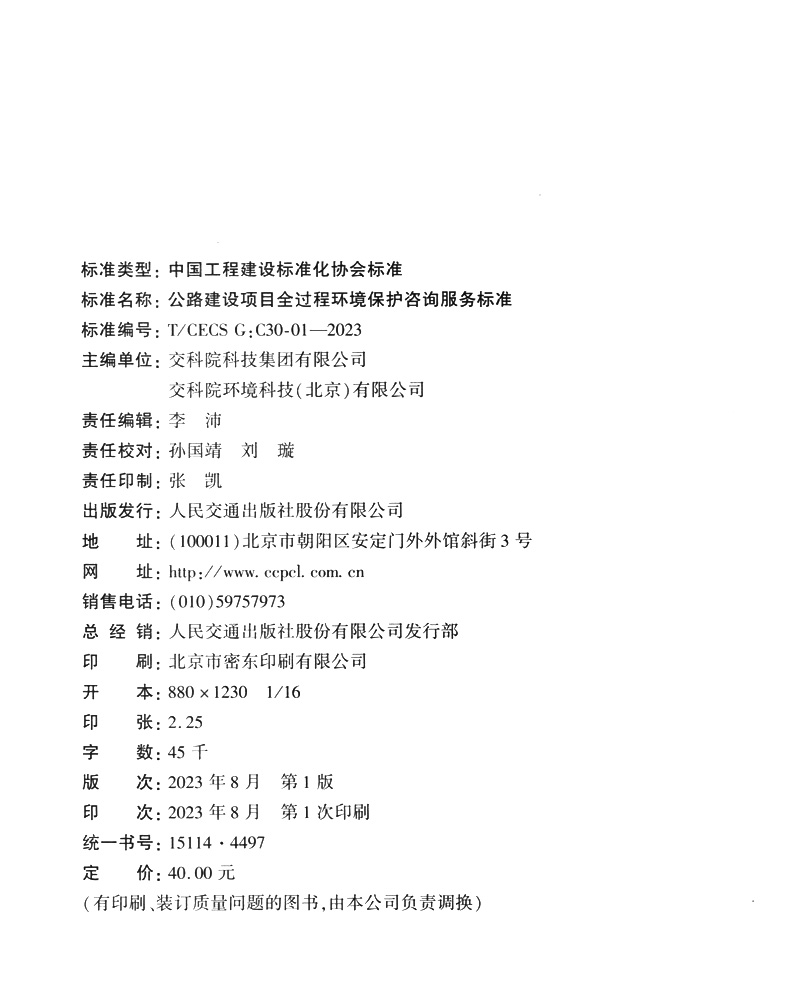 书名:公路建设项目全过程环境保护咨询服务标准(T/CECS G:C30-01—2023)