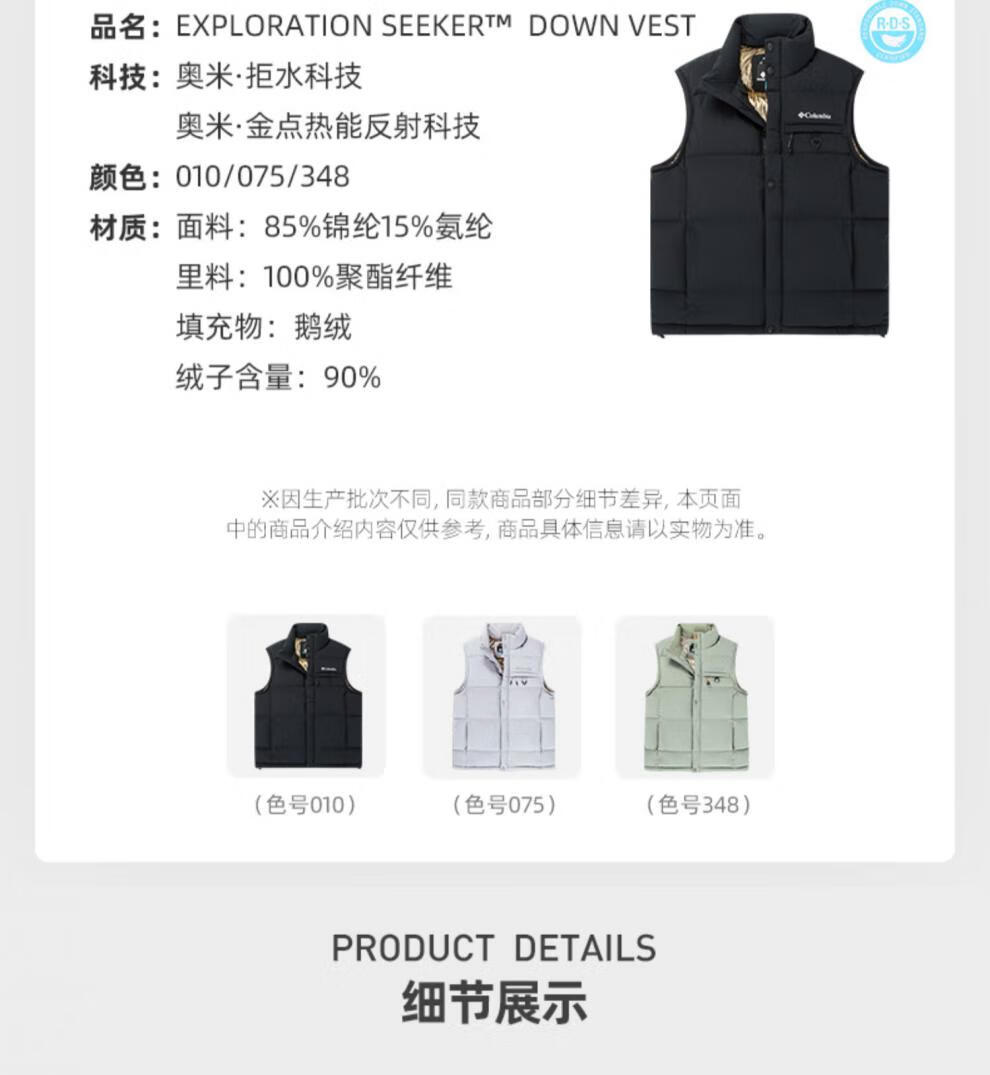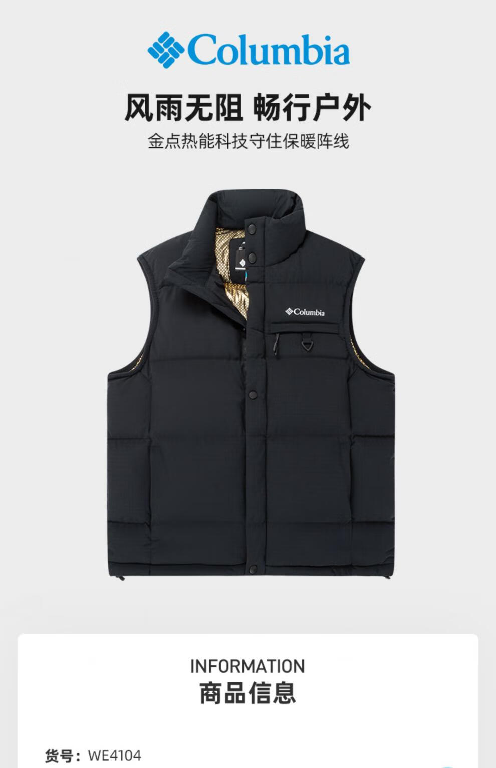 哥伦比亚穿行系列-男式净色拒水羽绒马甲WE4104