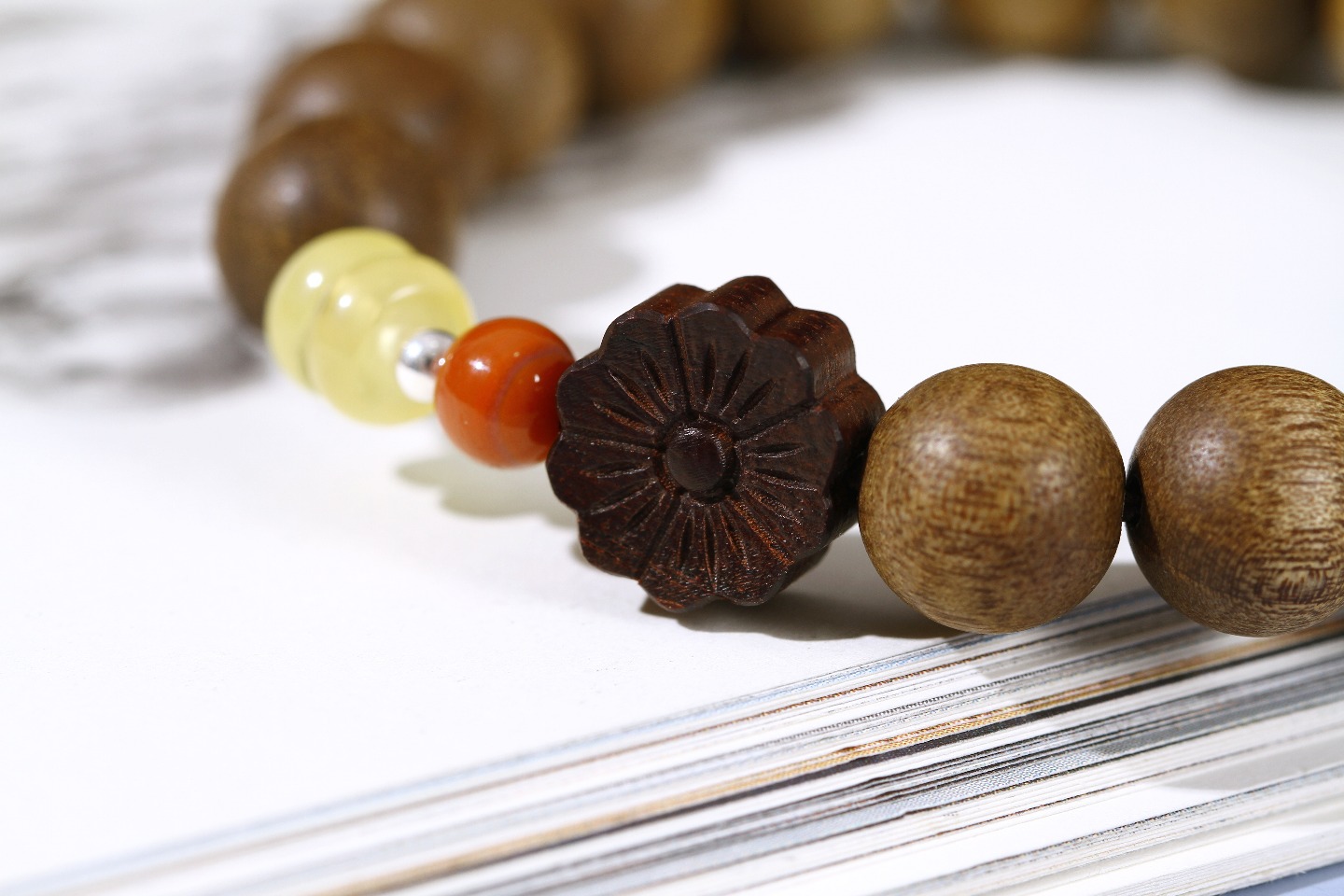 搭配:拆房老料金丝楠木为主,搭配紫檀花,南红,银珠,蜜蜡隔片。
