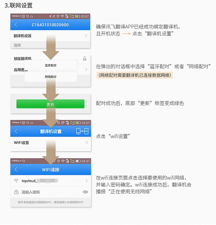 讯飞翻译机采用的是可以实时更新的云端引擎,需要网络连接云端服务,这样您可以