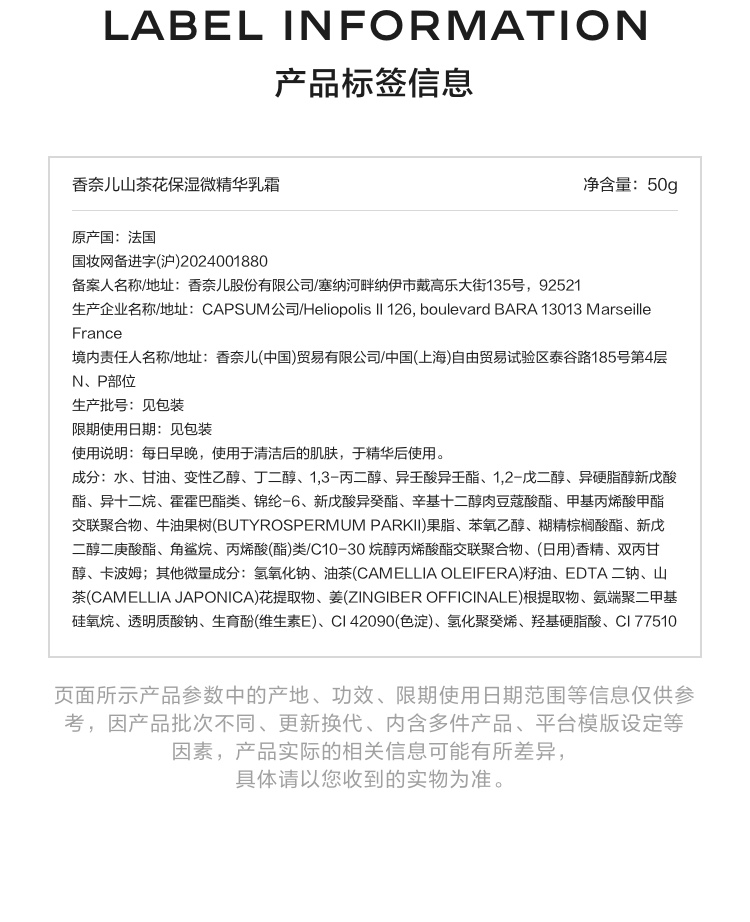 香奈儿 山茶花保湿气泡微精华乳霜/保温乳霜 润泽补水清爽