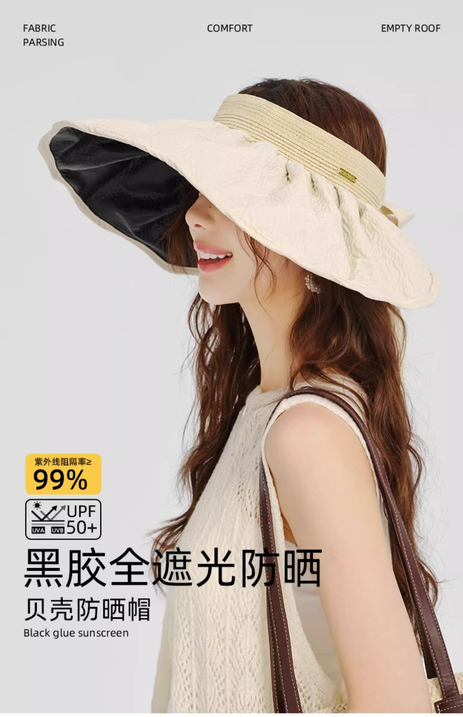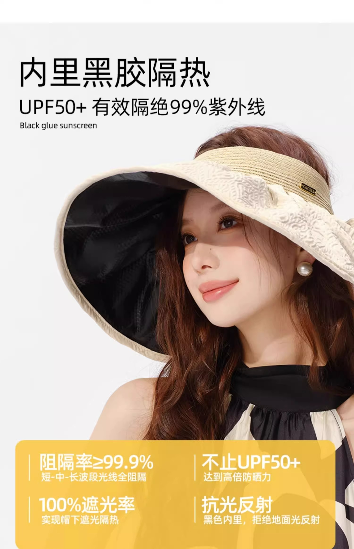 【CACUSS防晒】黑胶全遮光空顶防晒帽 大帽檐UPF50+大头围遮阳帽 可卷易收纳