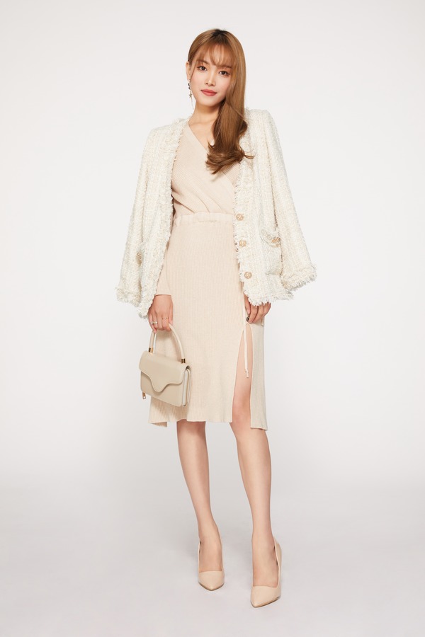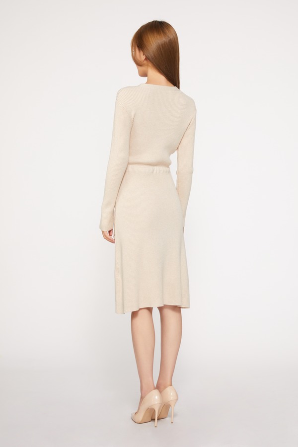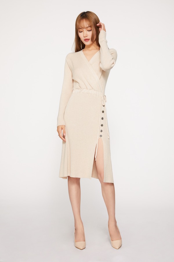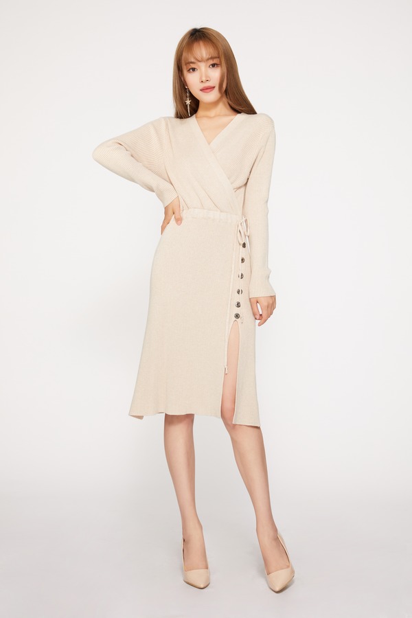 ESTELLICA 米杏色抽绳针织开衩连衣裙 9677