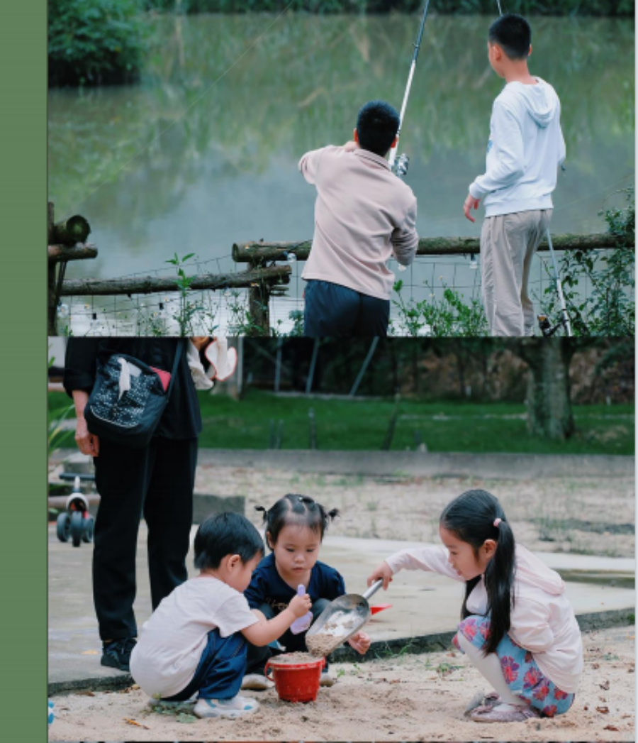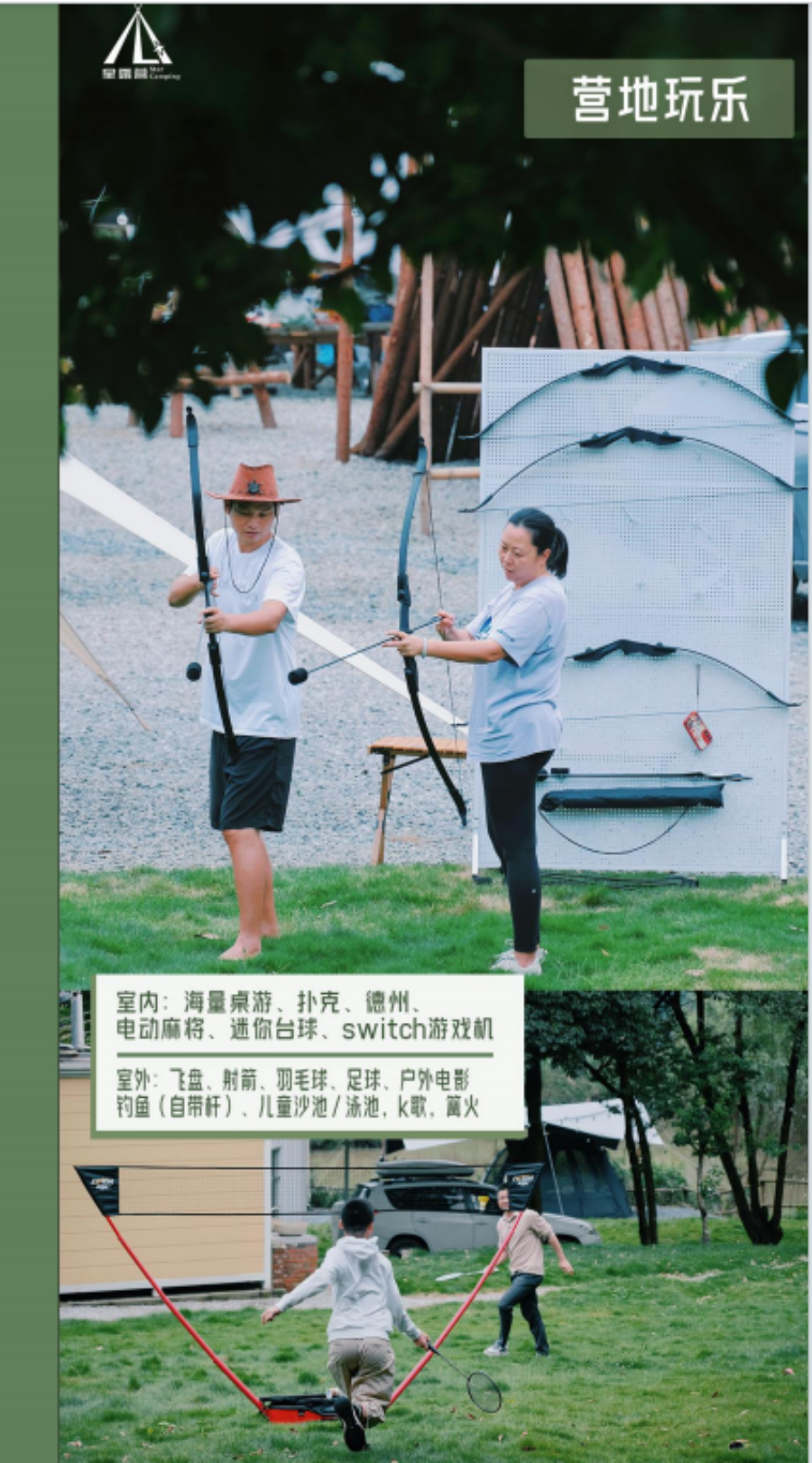 室外:飞盘、射箭、羽毛球、足球、环线徒步、钓鱼(自带杆)、儿童沙池、儿童泳池、喂兔子等。