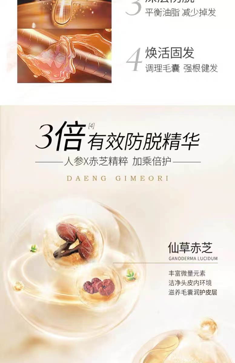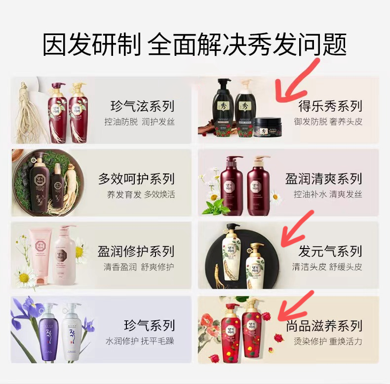 1、元气系列:核心配方红参精华,针对油性发质,清洁发丝、舒缓头皮