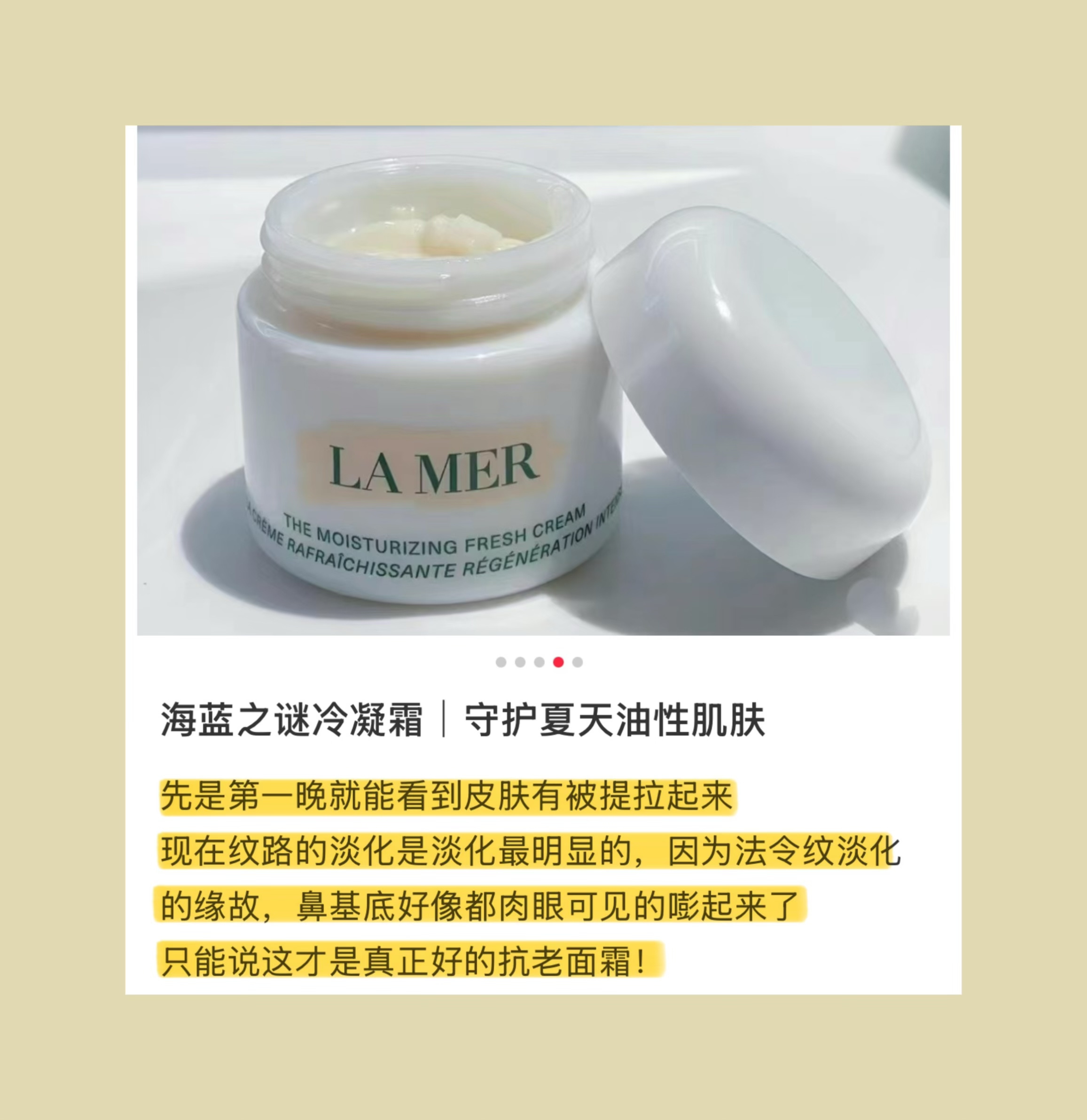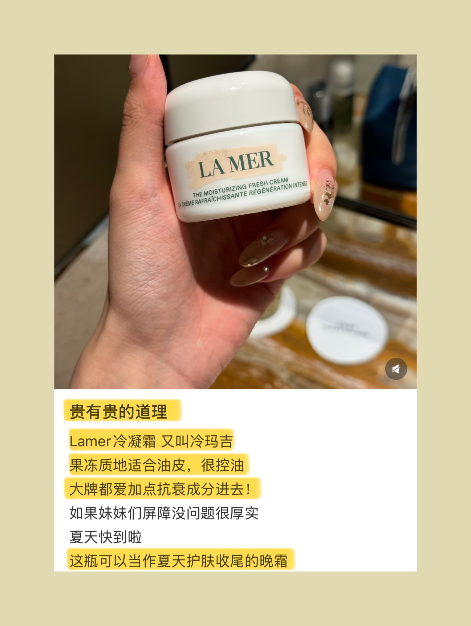 “贵有贵的道理,Lamer冷凝霜,又叫冷玛吉,果冻质地适合油皮,很控油!”