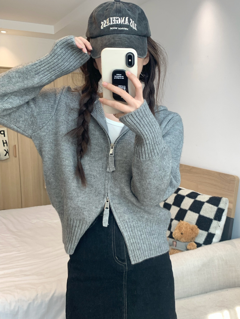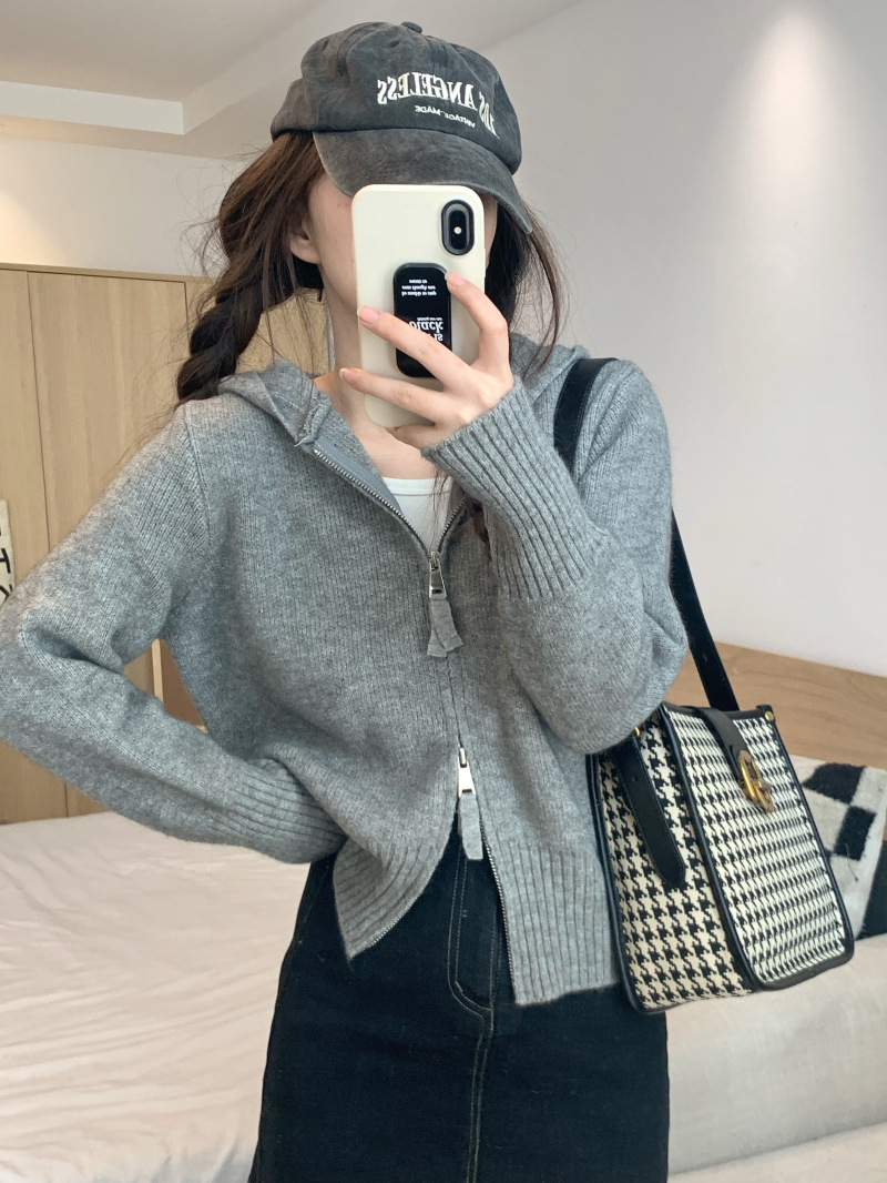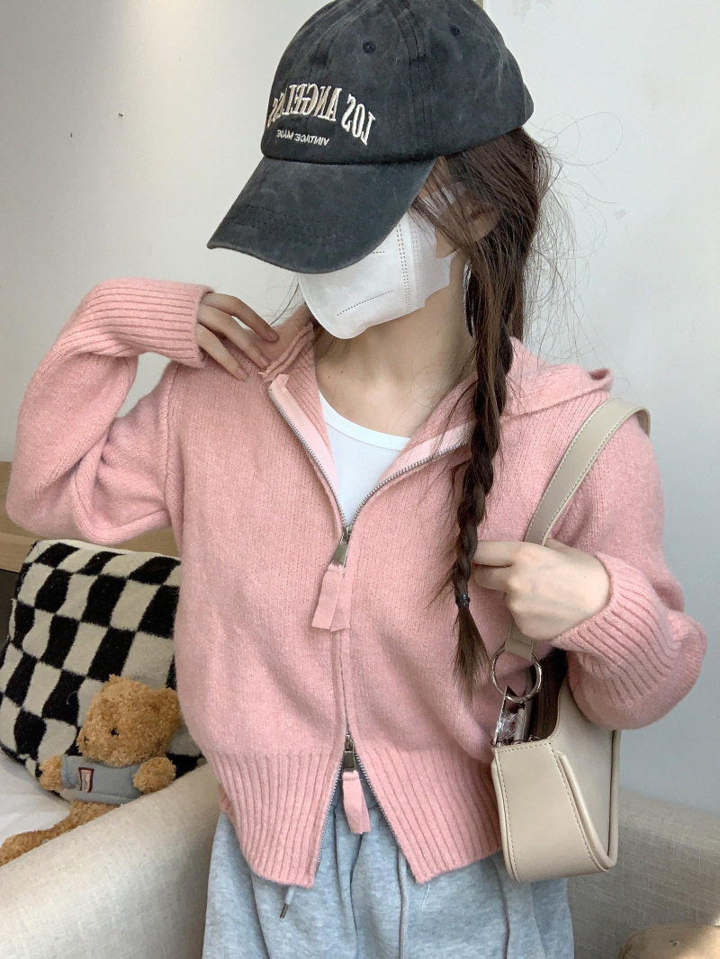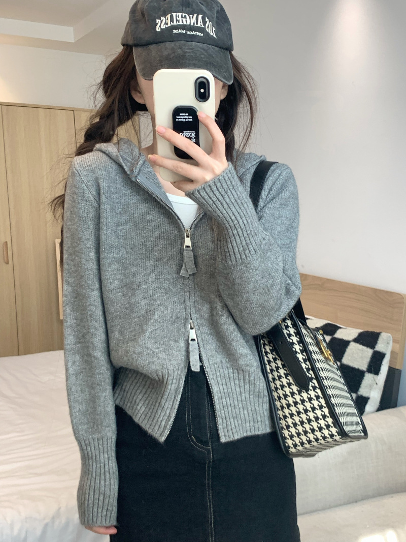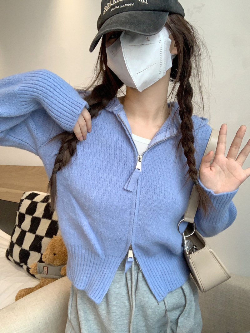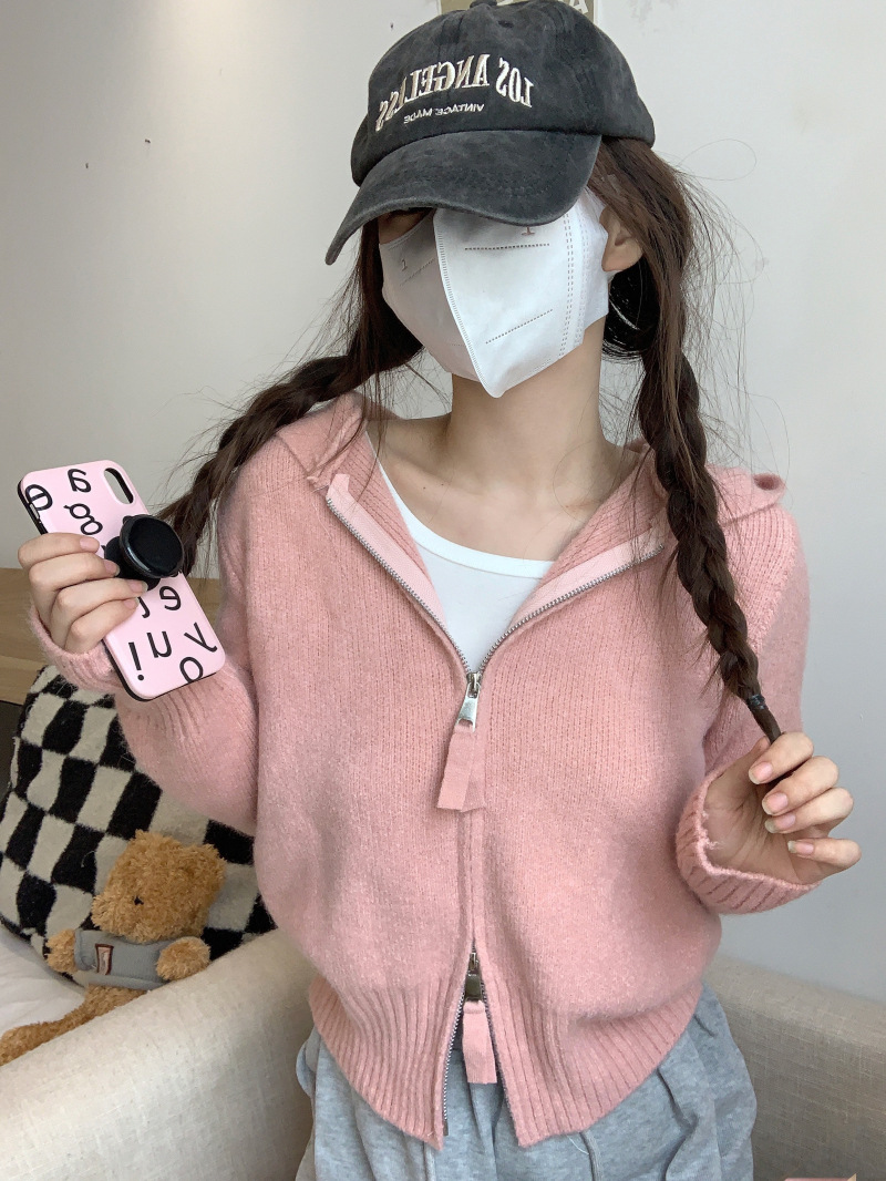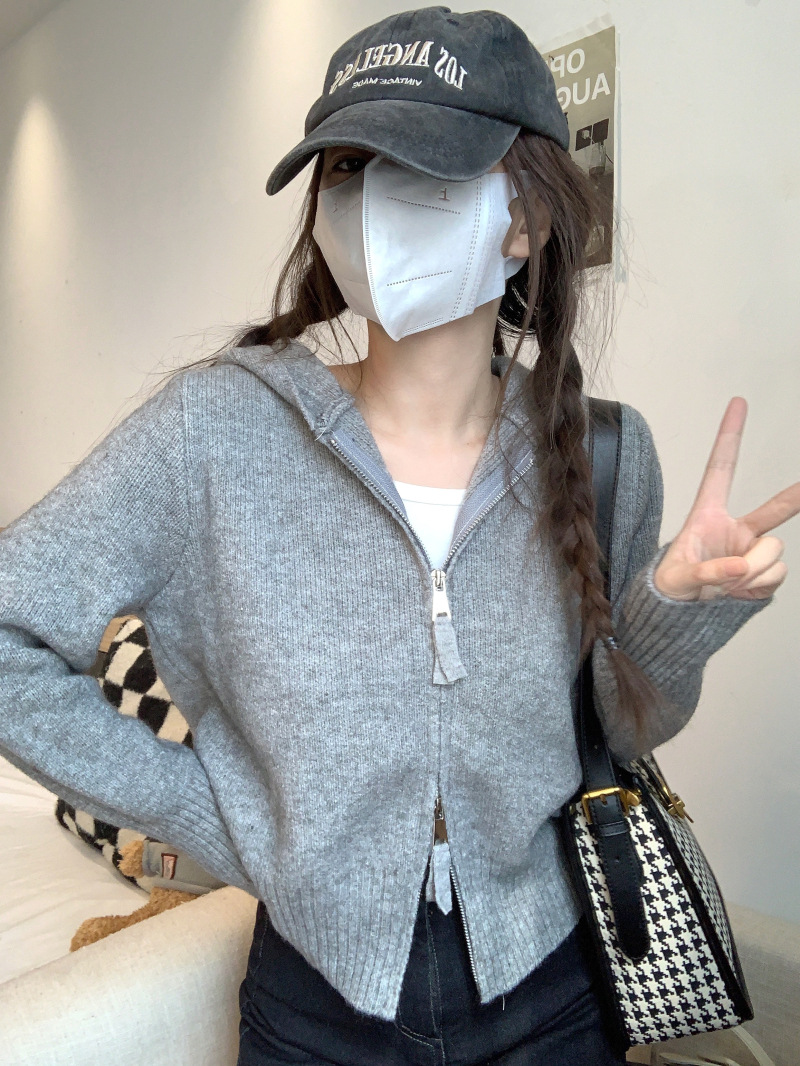 早春秋【纯欲风针织开衫】新款双头拉链长袖 修身显瘦短款上衣 连帽开衫