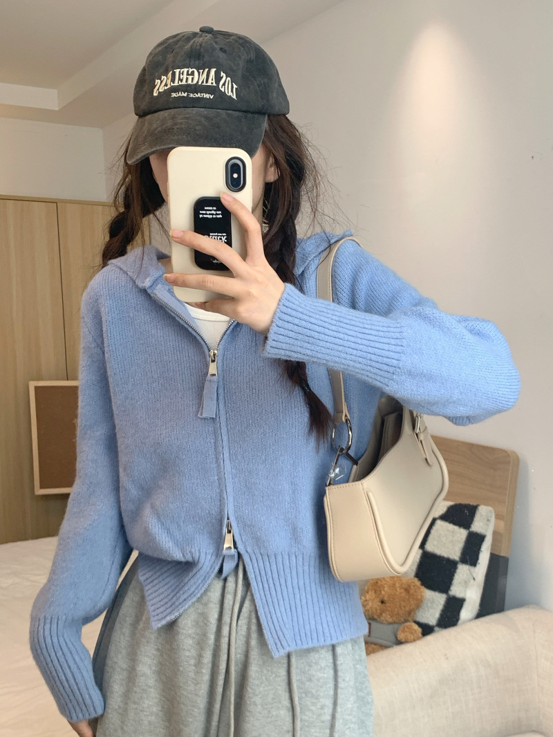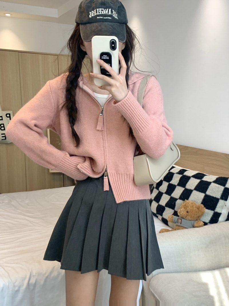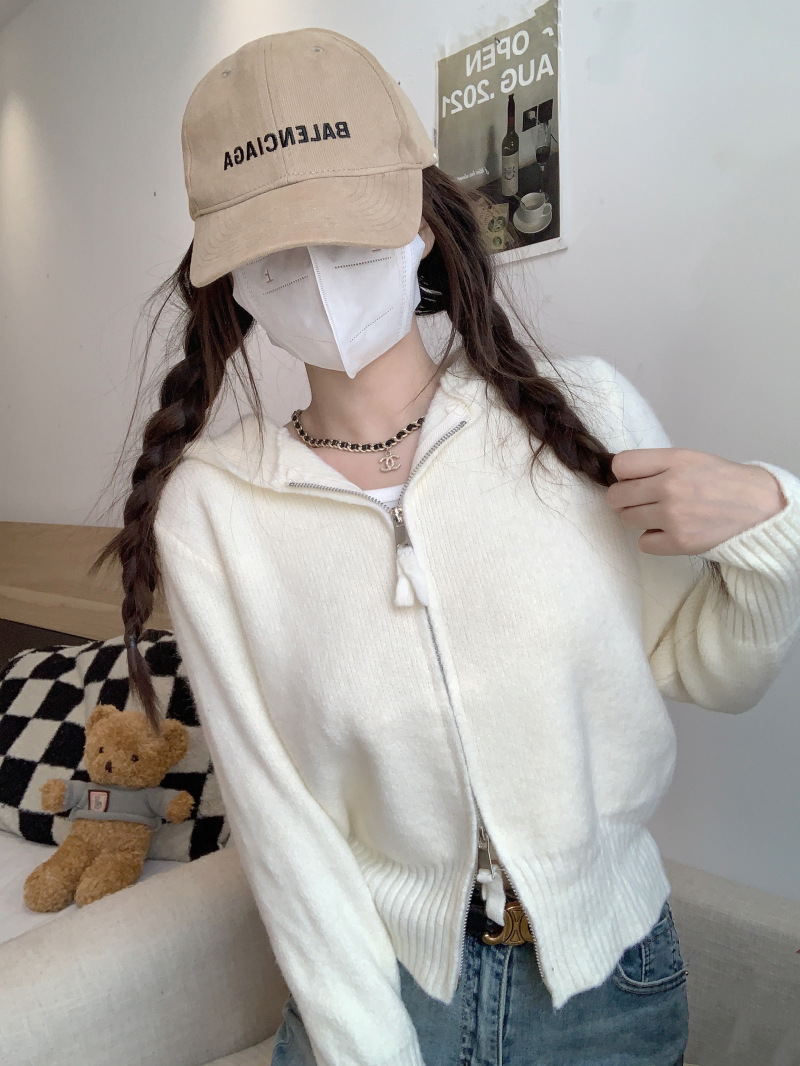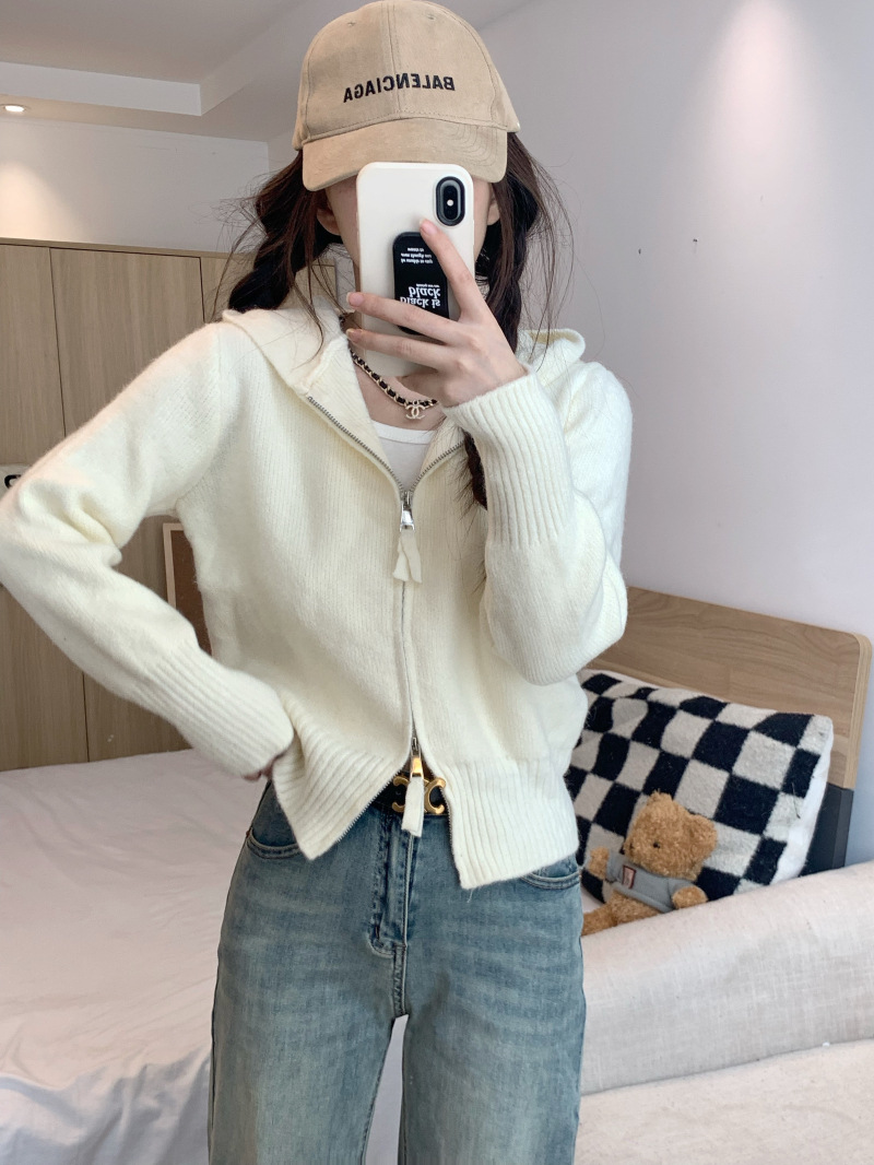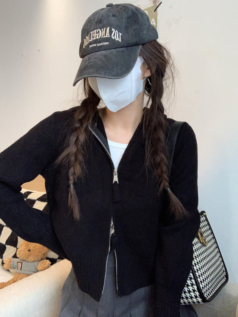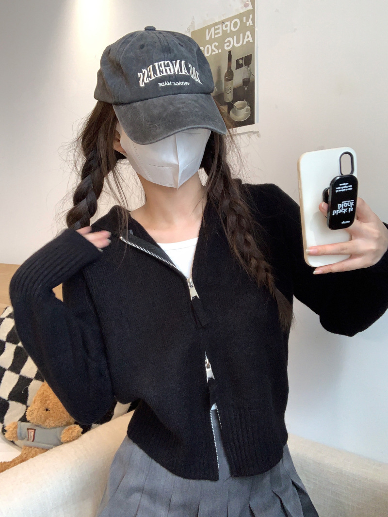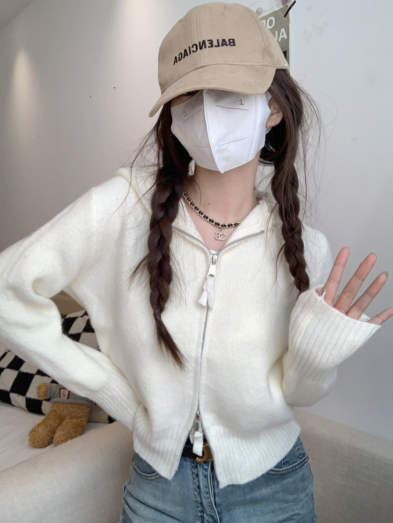 早春秋【纯欲风针织开衫】新款双头拉链长袖 修身显瘦短款上衣 连帽开衫