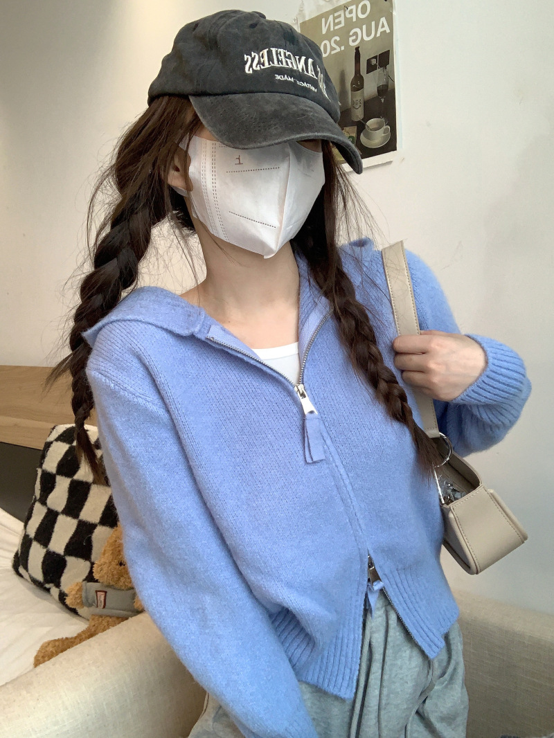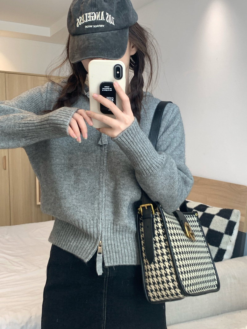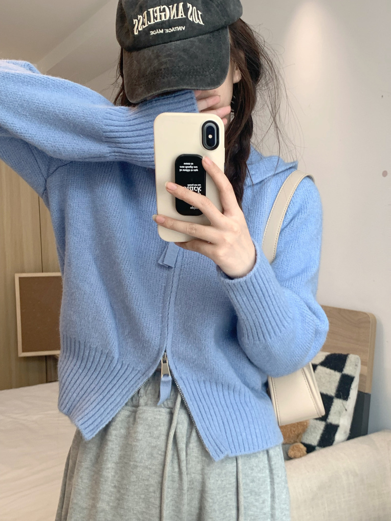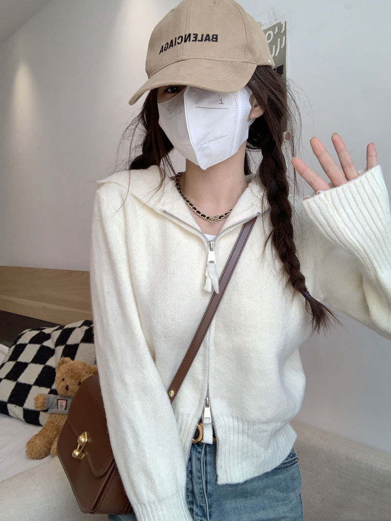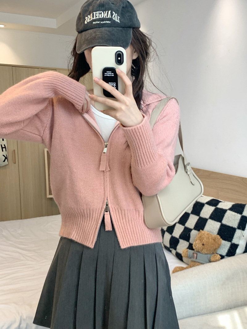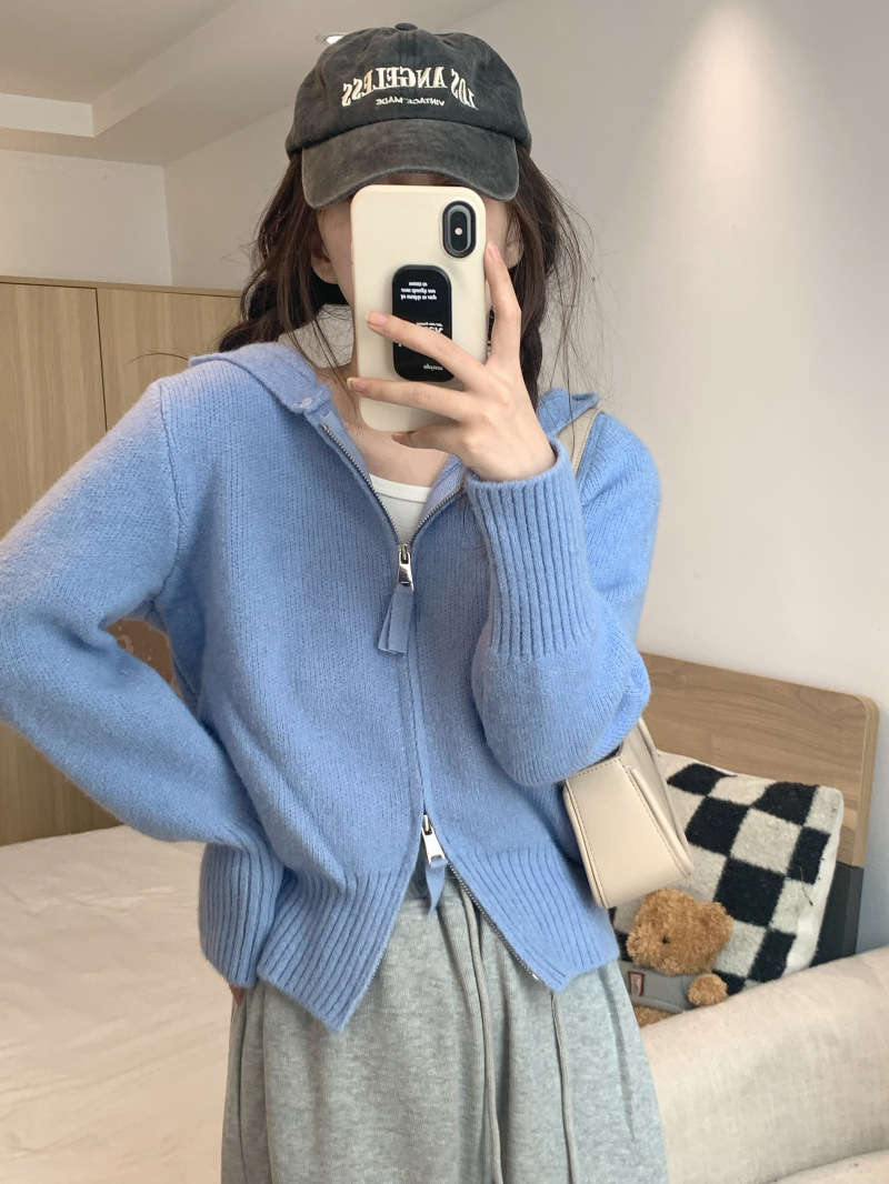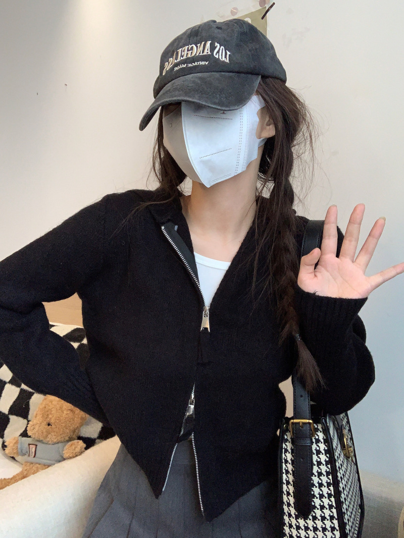 早春秋【纯欲风针织开衫】新款双头拉链长袖 修身显瘦短款上衣 连帽开衫
