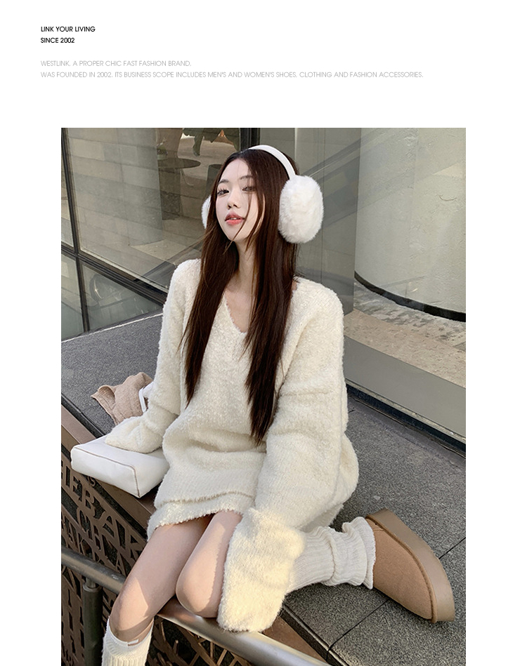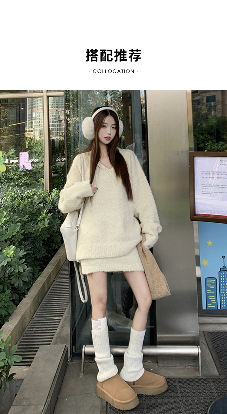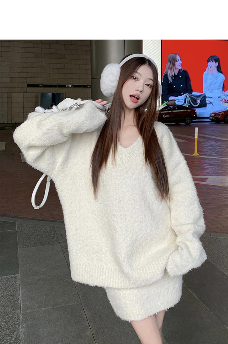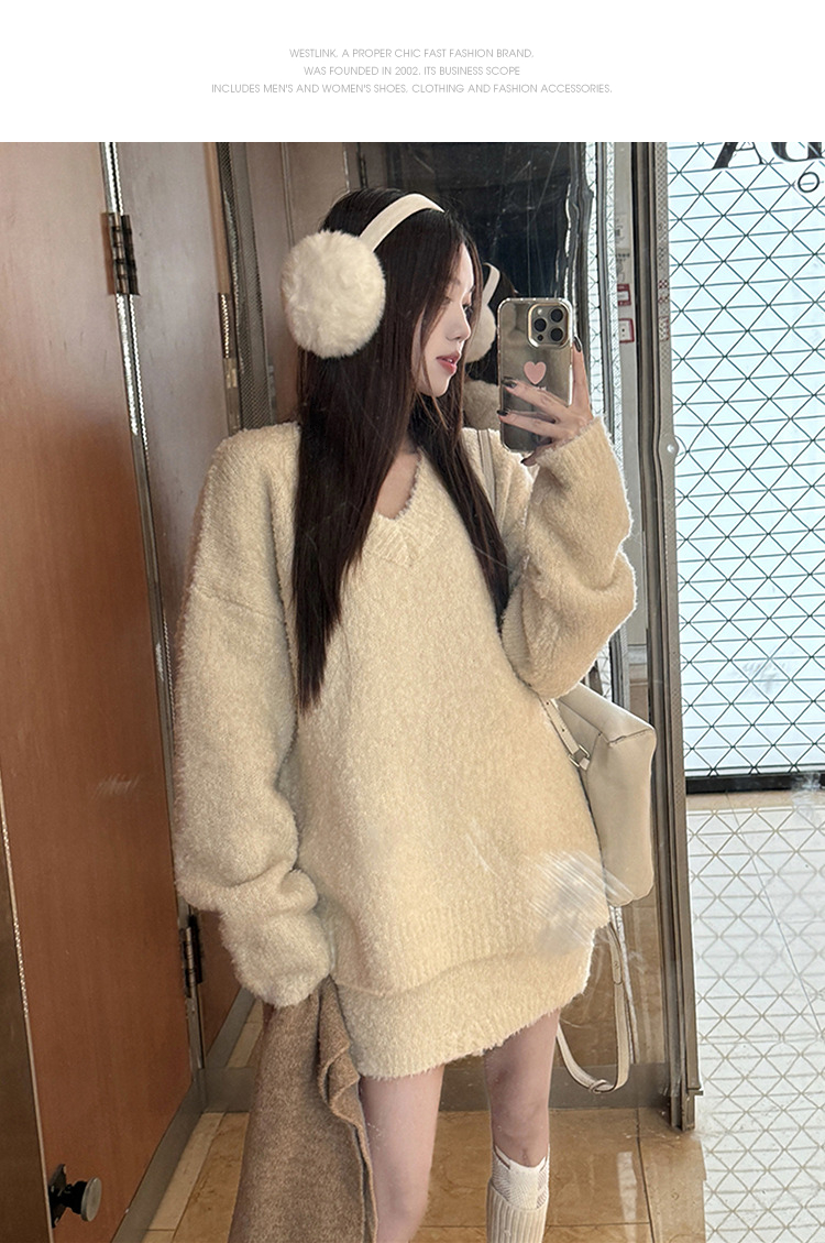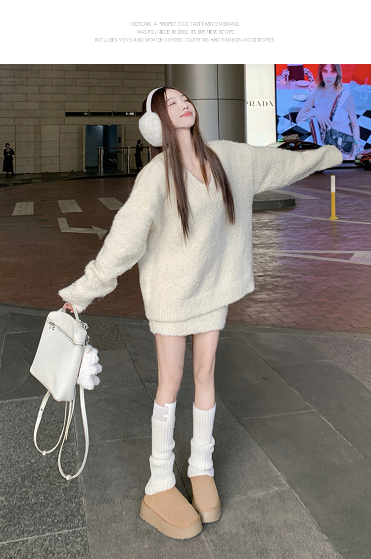 西遇100%纯羊毛套装女冬季新款V领针织上衣短裙两件套SS141444