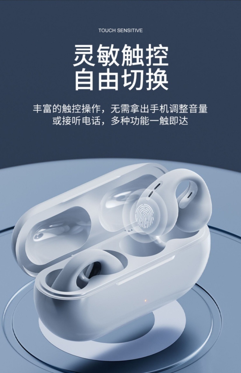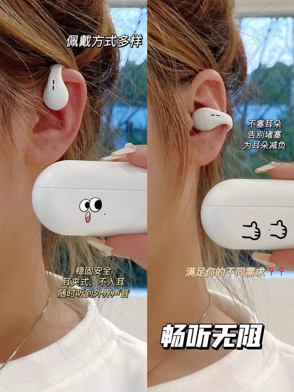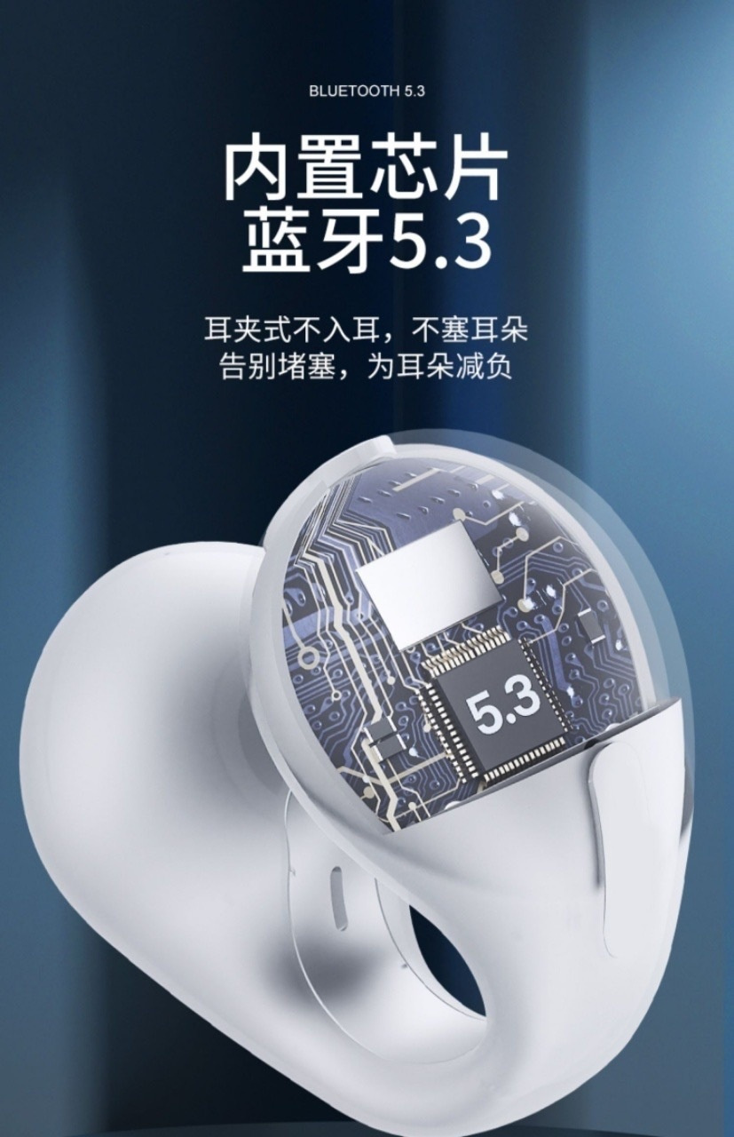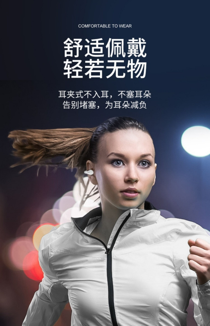 我们的耳机采用耳夹设计、便携、佩戴不脱落,久戴不痛