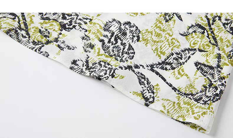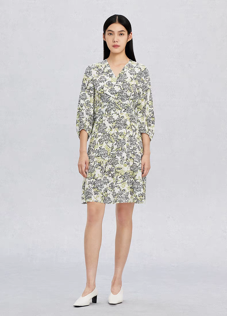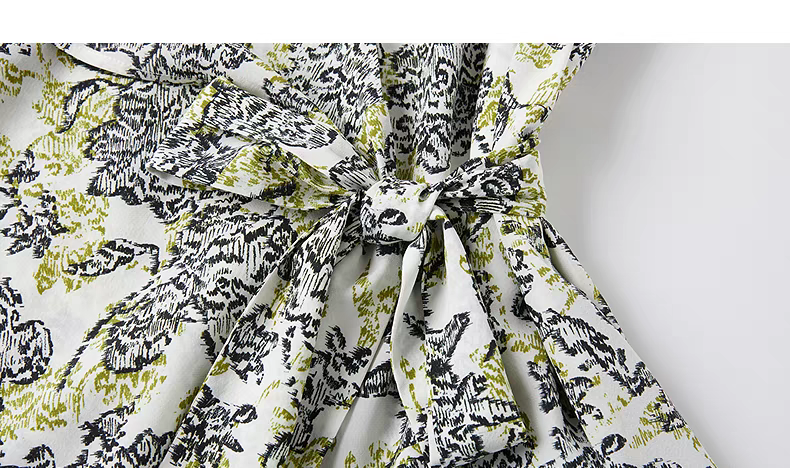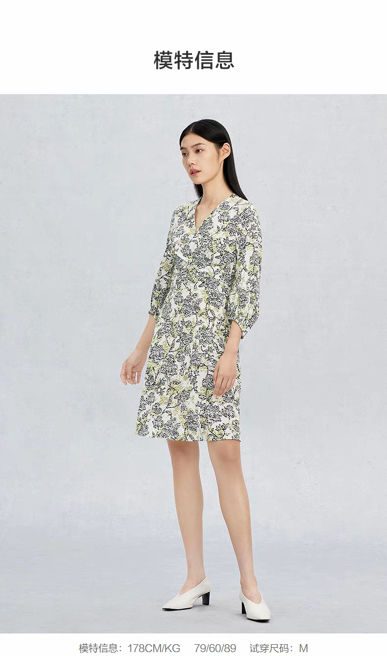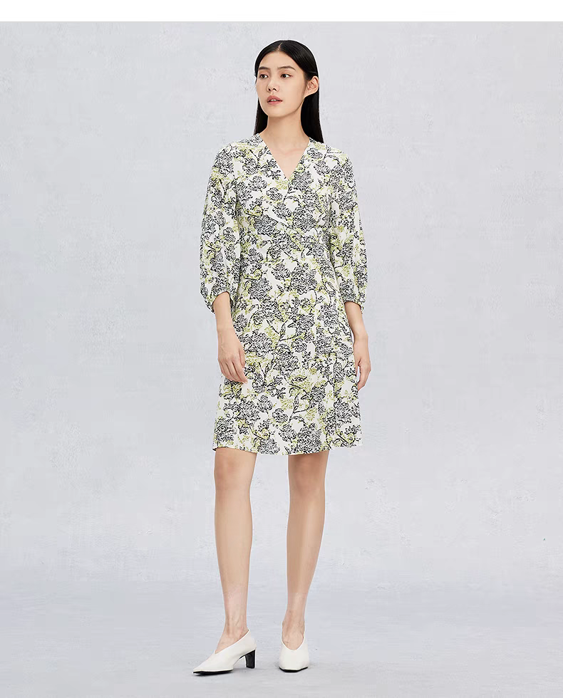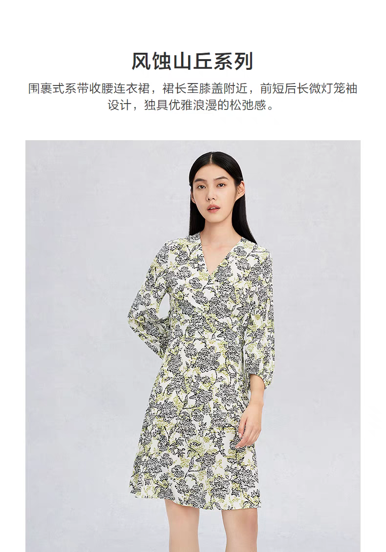 鄂尔多斯1980新品桑蚕丝V领围裹式连衣裙女印花系带连衣裙25春夏款