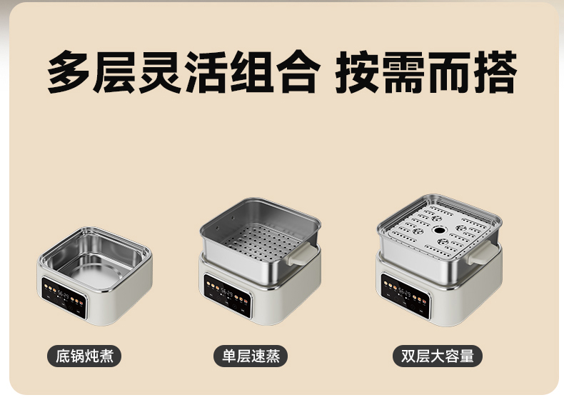 - 蒸煮两用,4L+4L双层蒸格,3.5L火锅容量,上蒸下煮,