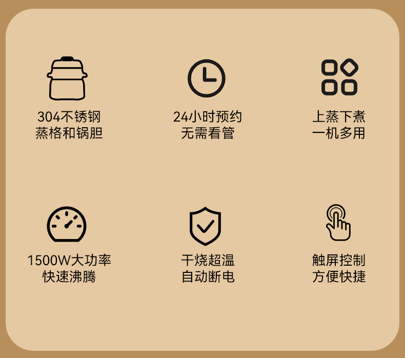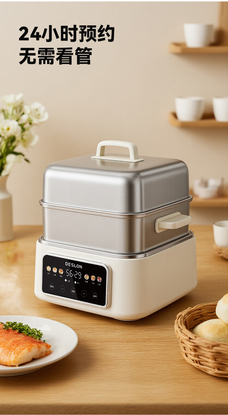 24小时智能预约,晚上睡觉前设置好时间,早上醒来食材已经蒸好了,美味无需久等