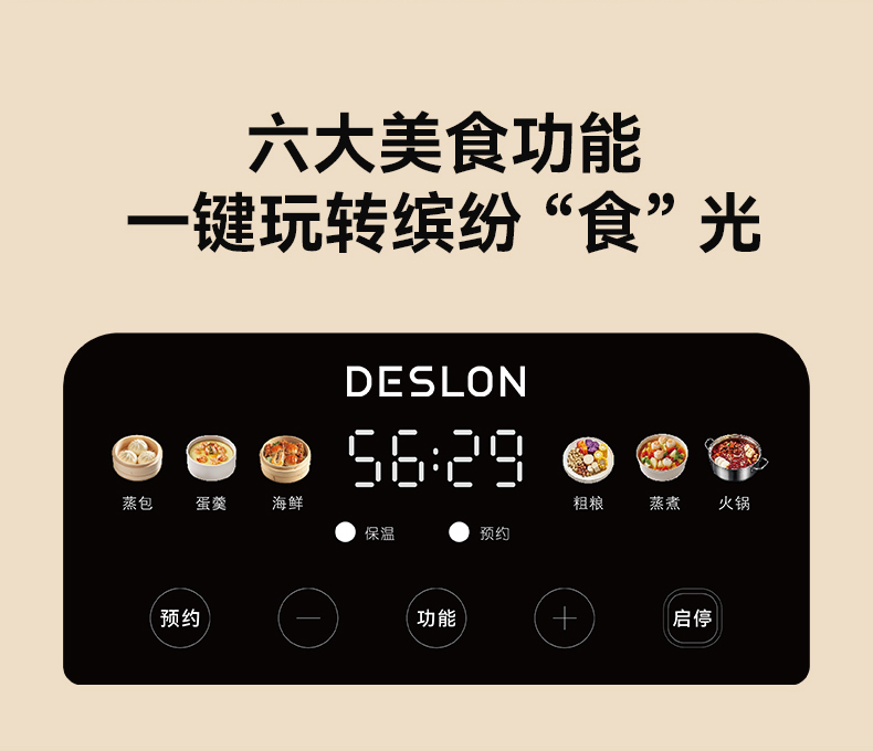 - 6大功能选择,蒸海鲜、面食、粗粮、炖汤、火锅,一机多用