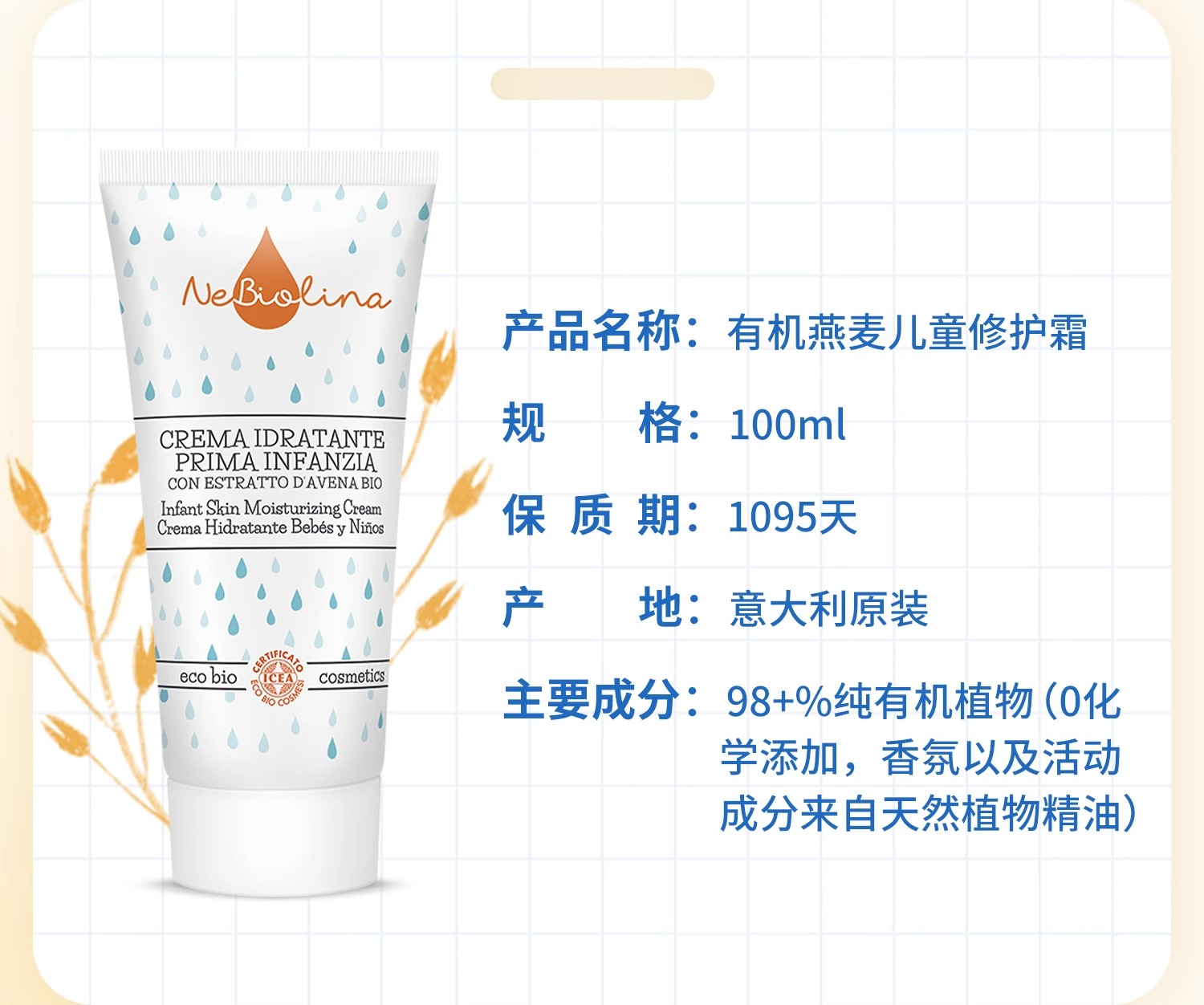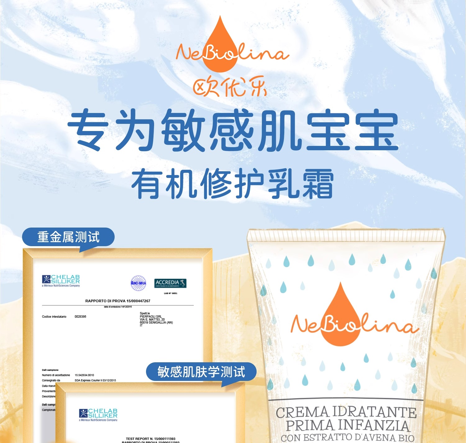 欧优乐Nebiolina有机燕麦保湿补水宝宝面霜100ml舒缓干燥红痒