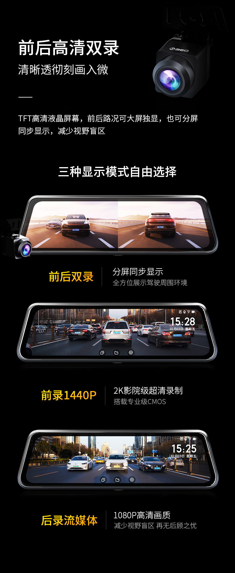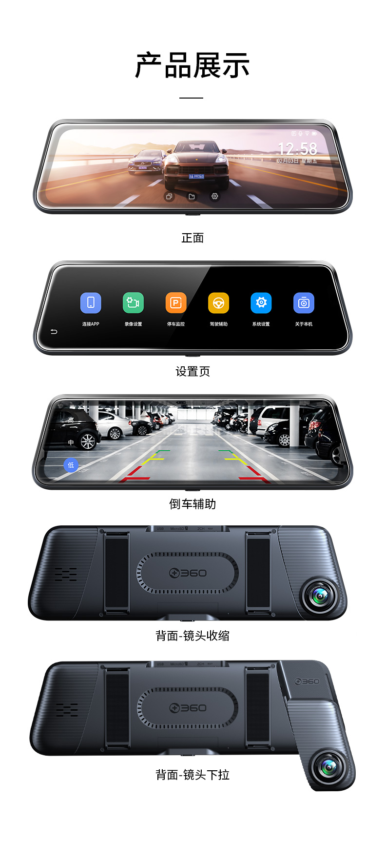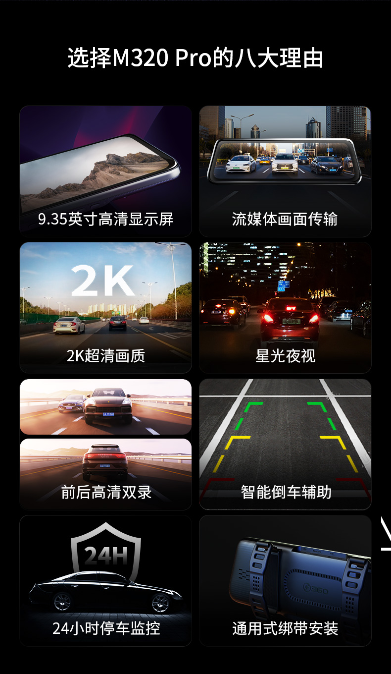 【采购】360行车记录仪M320 Pro 全屏流媒体后视镜记录仪 9.35英寸高清显示屏 前后高清双录 智能倒车辅助