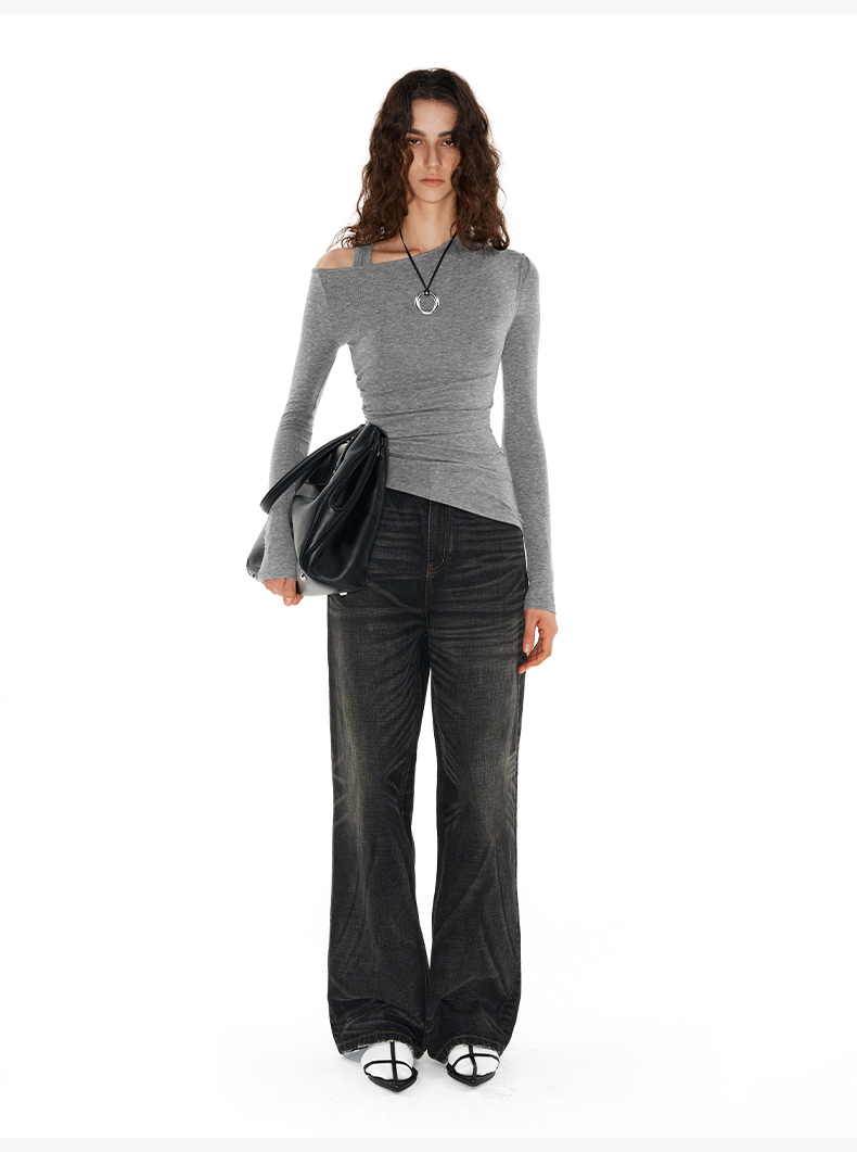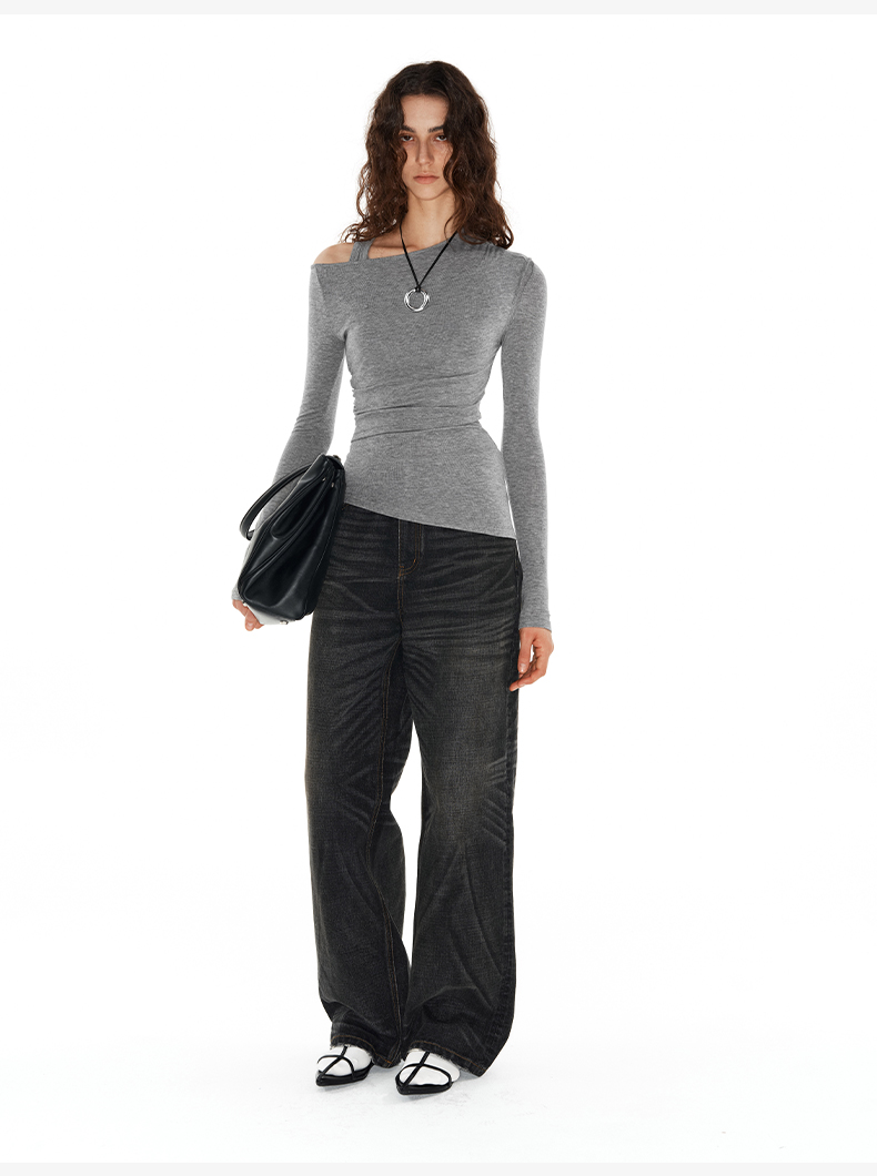 1.15上午10点8.8折!NUTH圆领褶皱不对称修身收腰短袖t恤女 白色/灰色