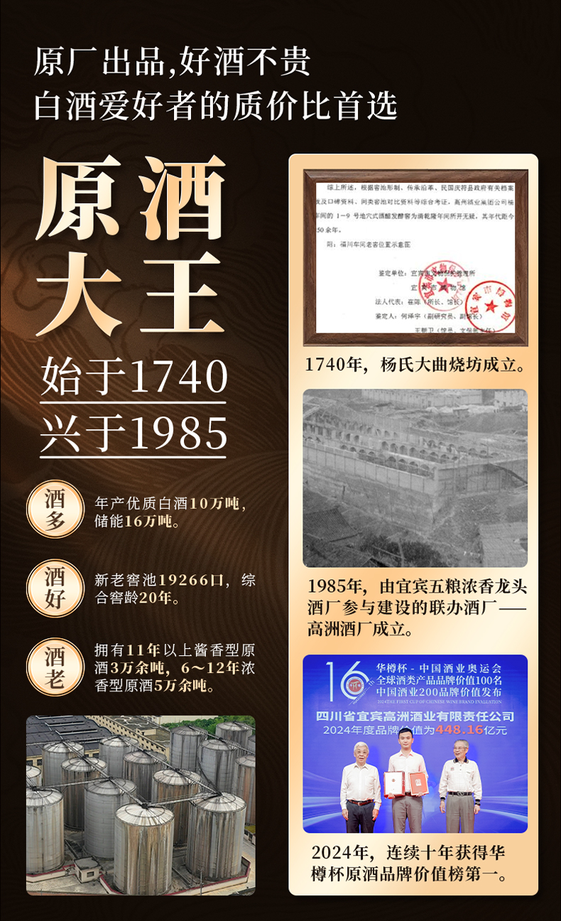- 高洲酿造 自然好酒 源自270余年前清代杨氏大曲烧坊技艺 占地3000余亩,年产能10万吨,储能16.3万吨,成品酒包装能力12万吨 37年专注酿酒,为100多家名优酒企提供优质原酒