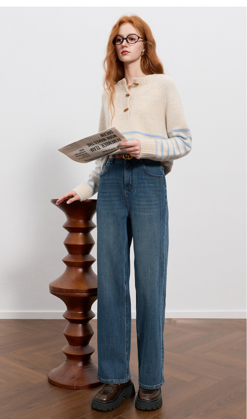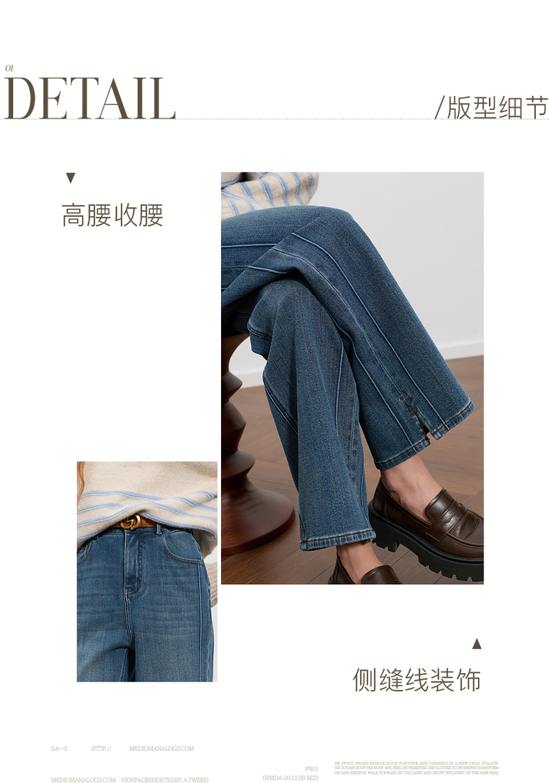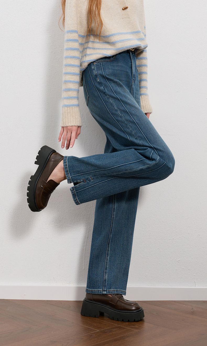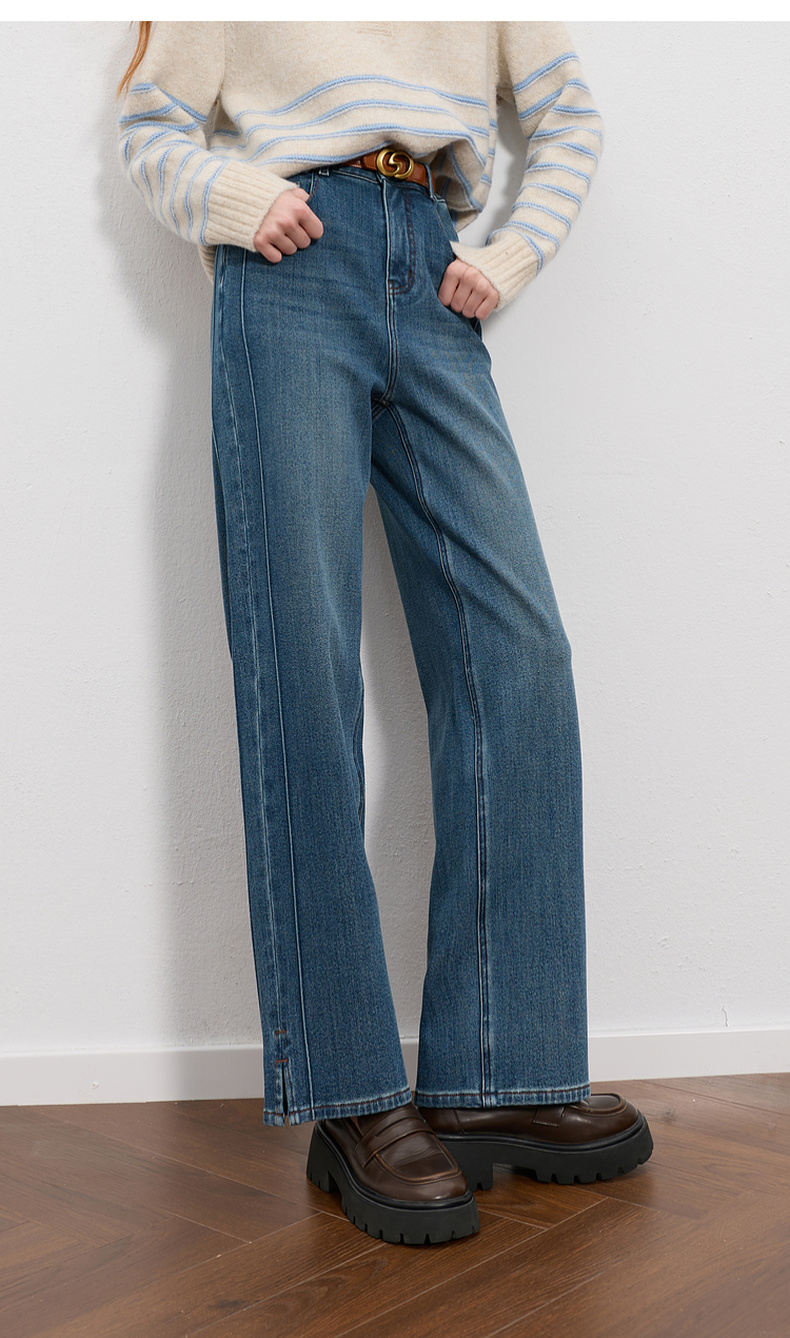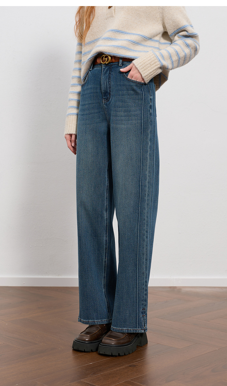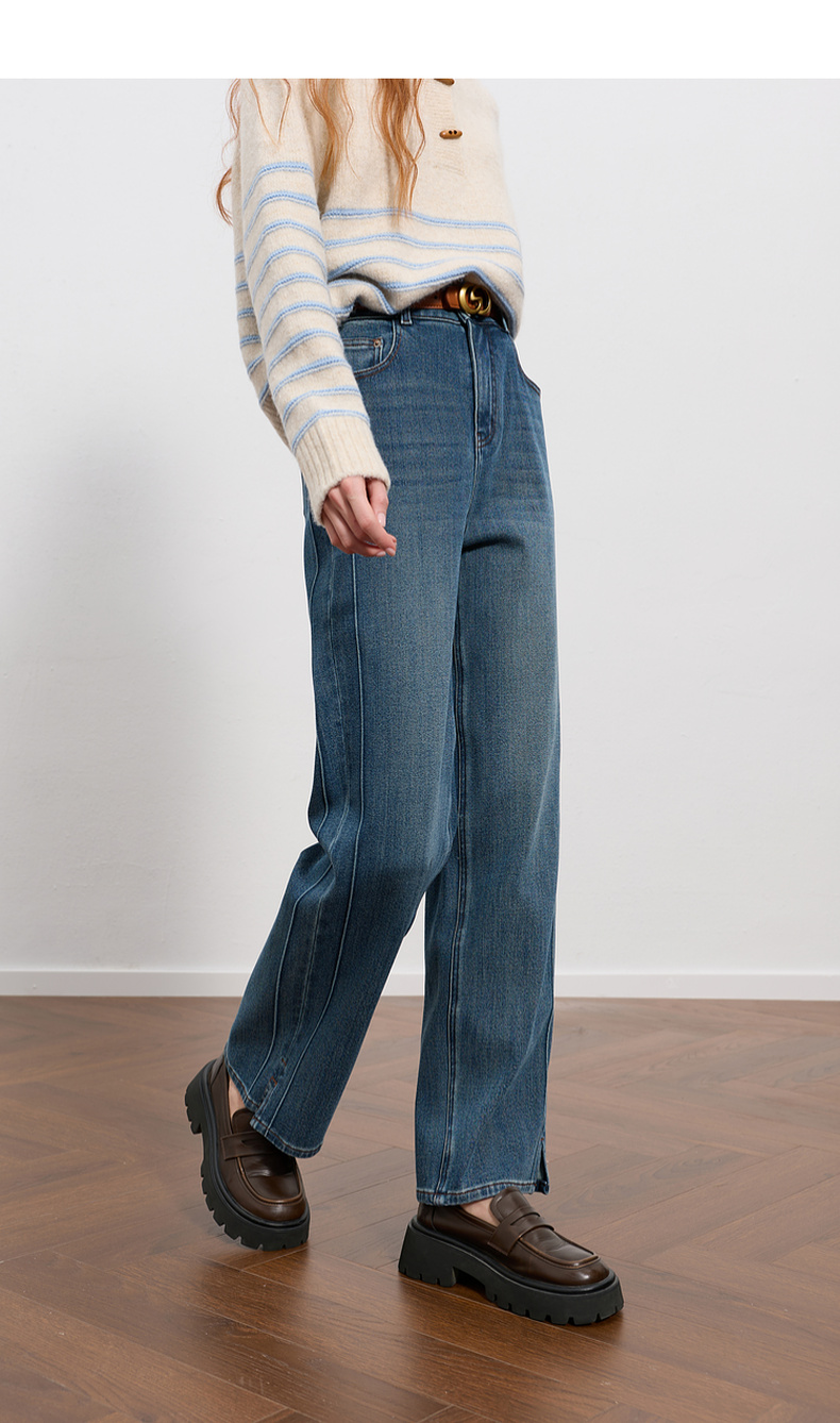 三彩2025冬季新款高腰牛仔裤休闲裤一体绒磨毛直筒裤九分裤M