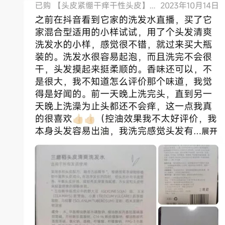 你的头发是不是这样?👇🏻 ❌头屑纷飞 ❌头痒难耐 ❌油腻异味 其他牌子用猛💊,过度清洁去屑 导致头皮功能失调😣 但用了一次【三磨稻轻爽净屑洗发乳】真的有被惊讶到~ 它添加成分都是天然的五谷+ 有机植物成分🌿 🌿内含丹若皮和鸡蛋果精华提取物 妥妥的把头发当成脸皮护理 香型是特调复刻雨后赤脚踩在田园泥泞里,混合东方谷物清淡不的香气🌼 👌帮你清洁的同时还养护头皮 洗一次至少三天不痒~