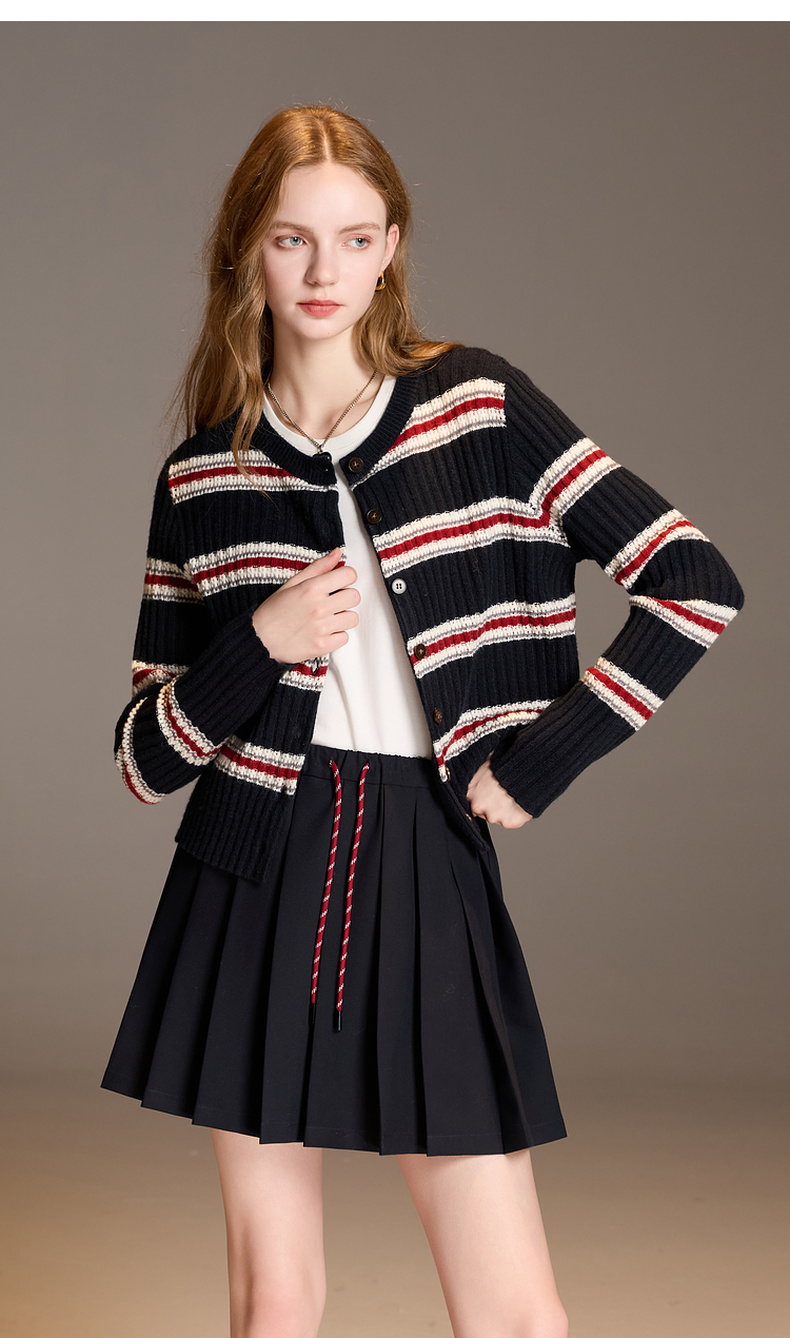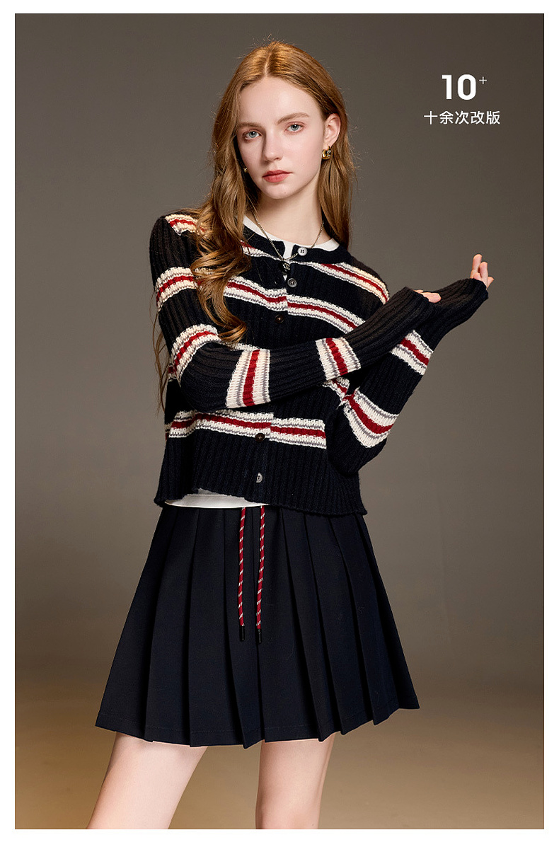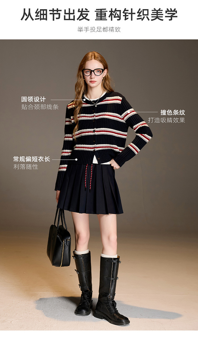 三彩2025冬季新款宽松慵懒条纹针织衫长袖单排扣开衫复古外套M