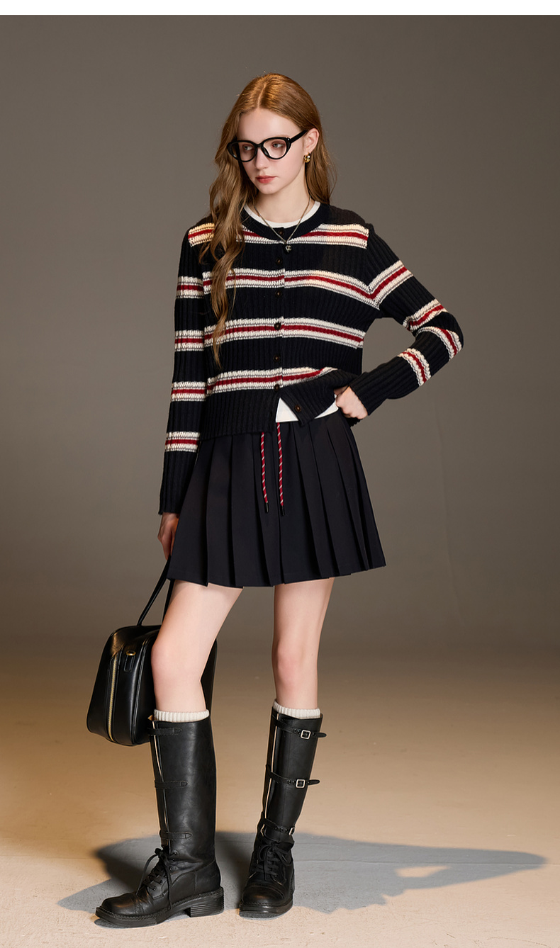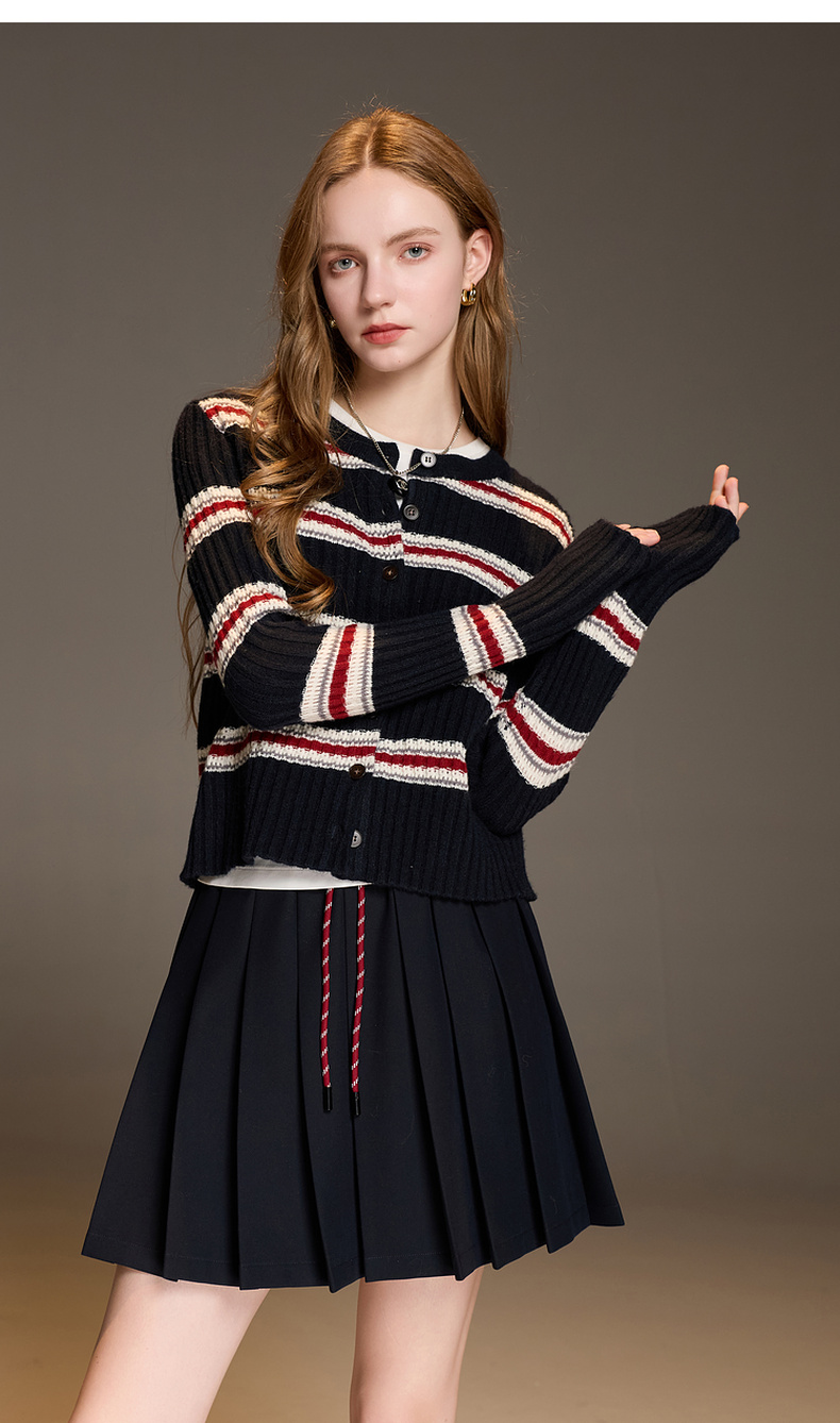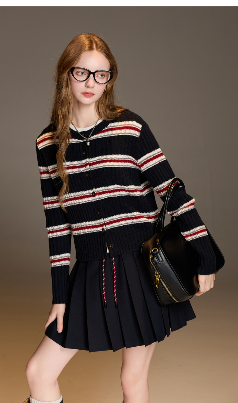 三彩2025冬季新款宽松慵懒条纹针织衫长袖单排扣开衫复古外套M