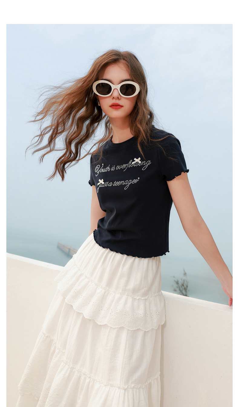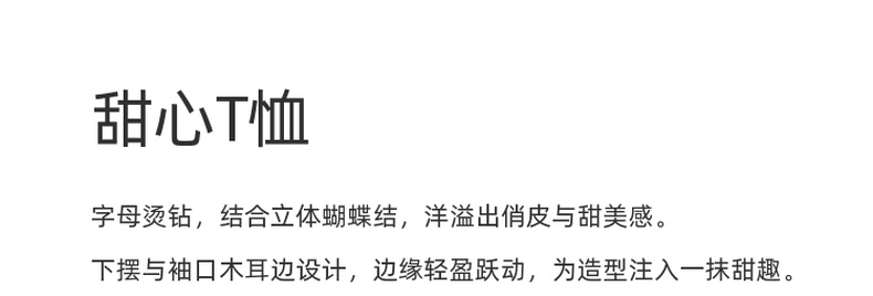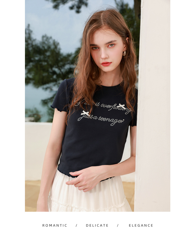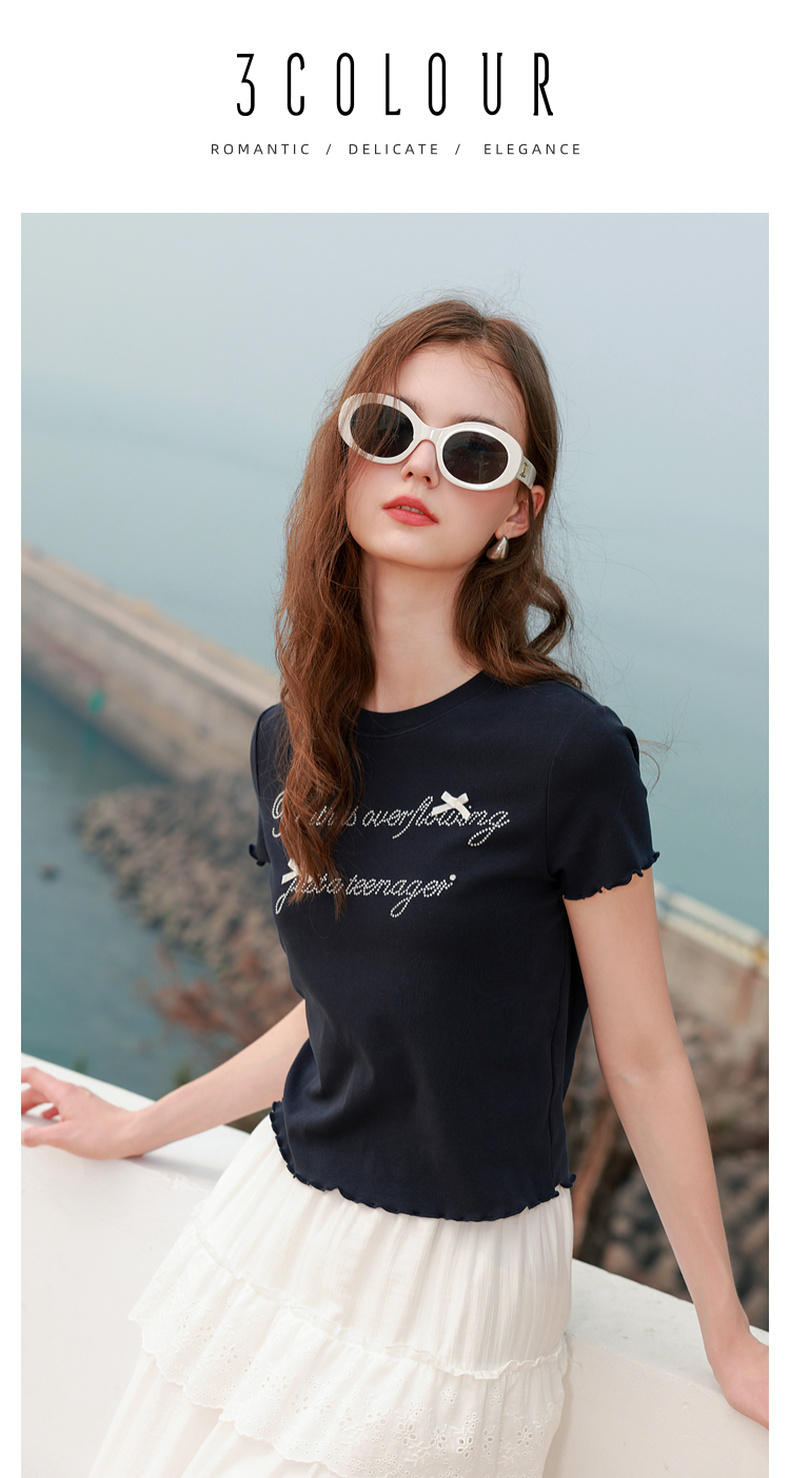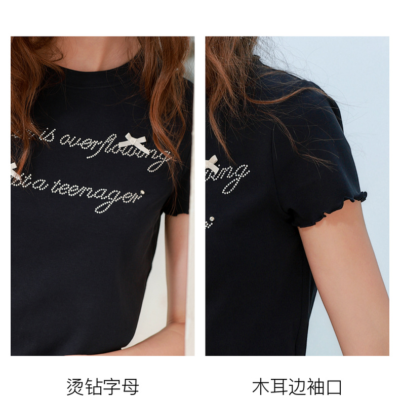 三彩2025夏季新款字母烫钻T恤蝴蝶结圆领正肩短袖木耳边短款M