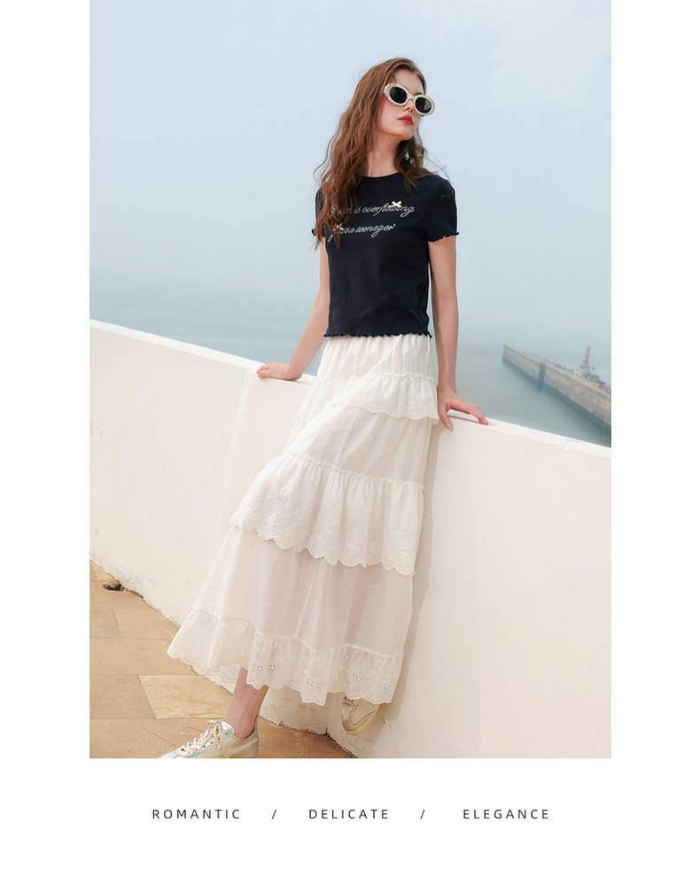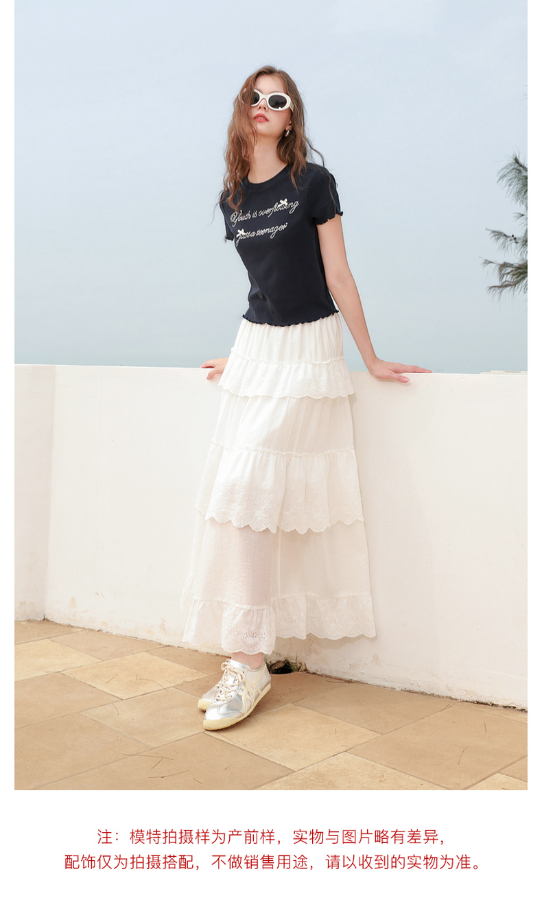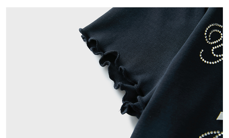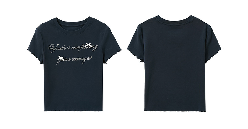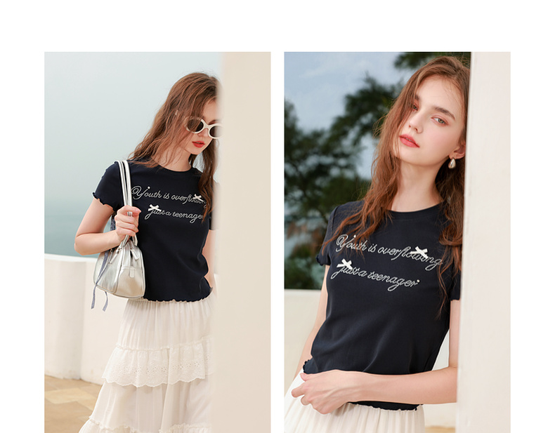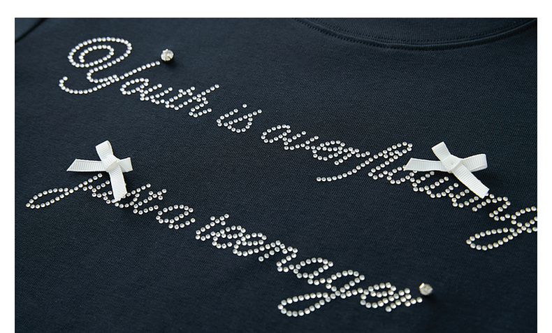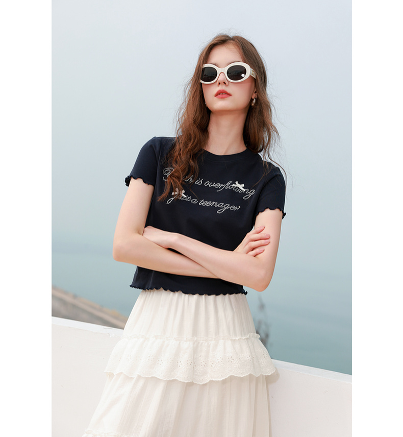 三彩2025夏季新款字母烫钻T恤蝴蝶结圆领正肩短袖木耳边短款M