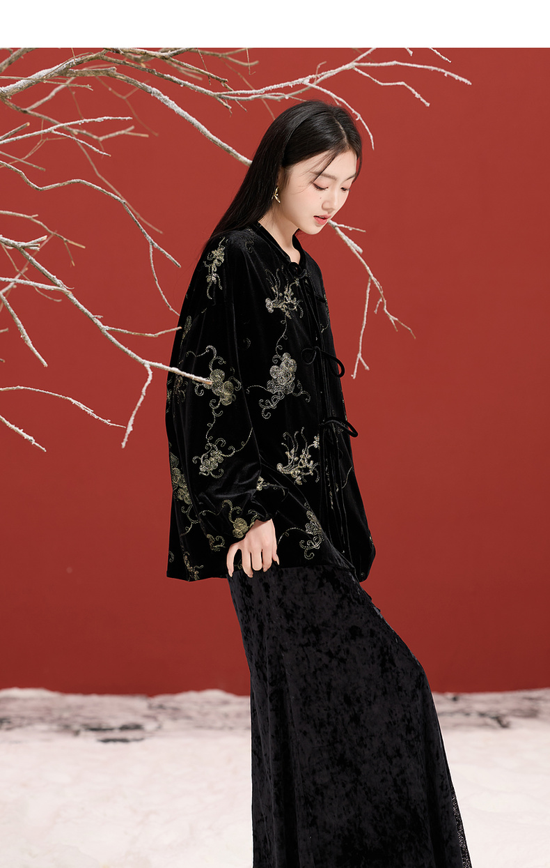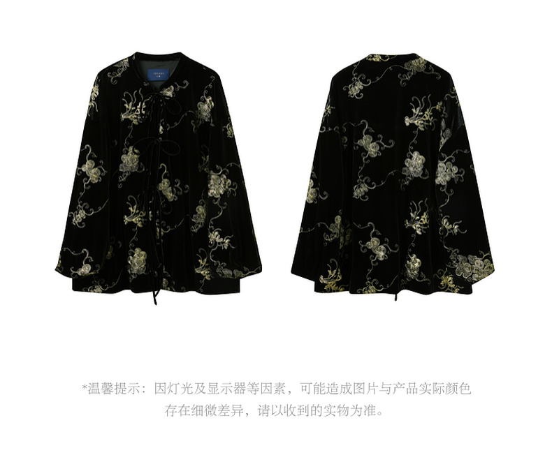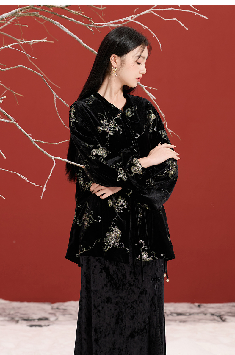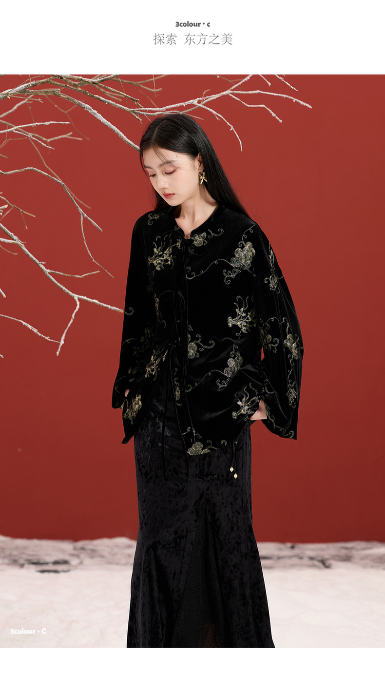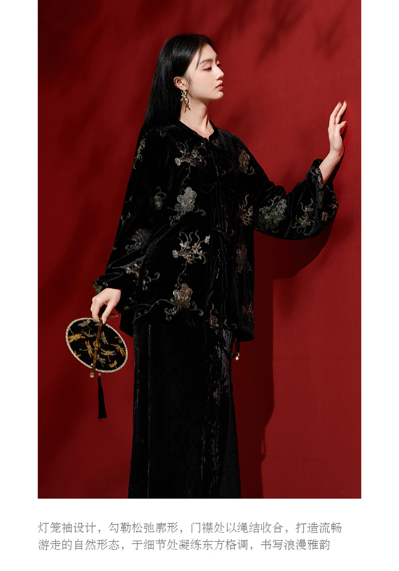 三彩【落日熔金】2025冬季新款绣花丝绒外套灯笼袖上衣C