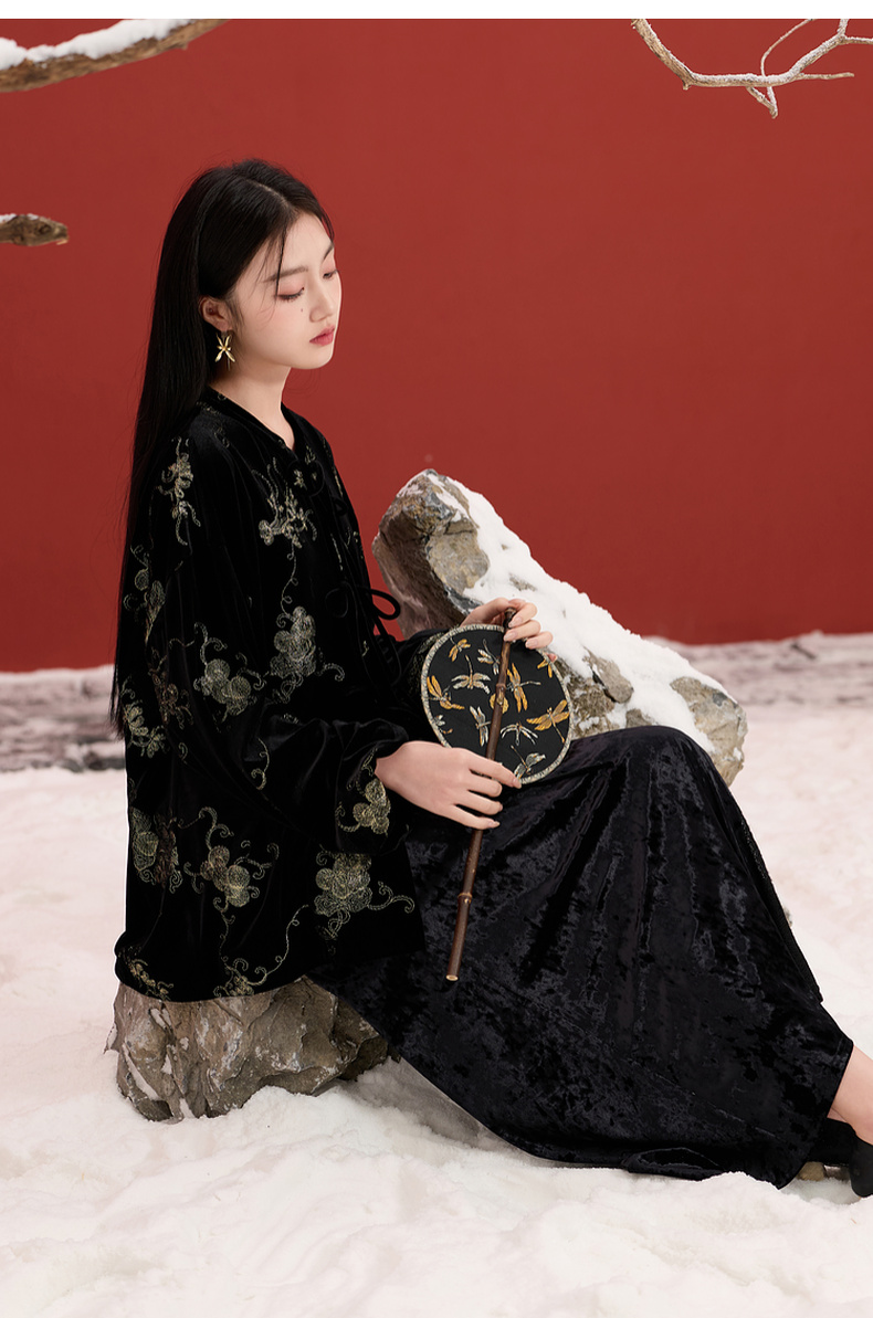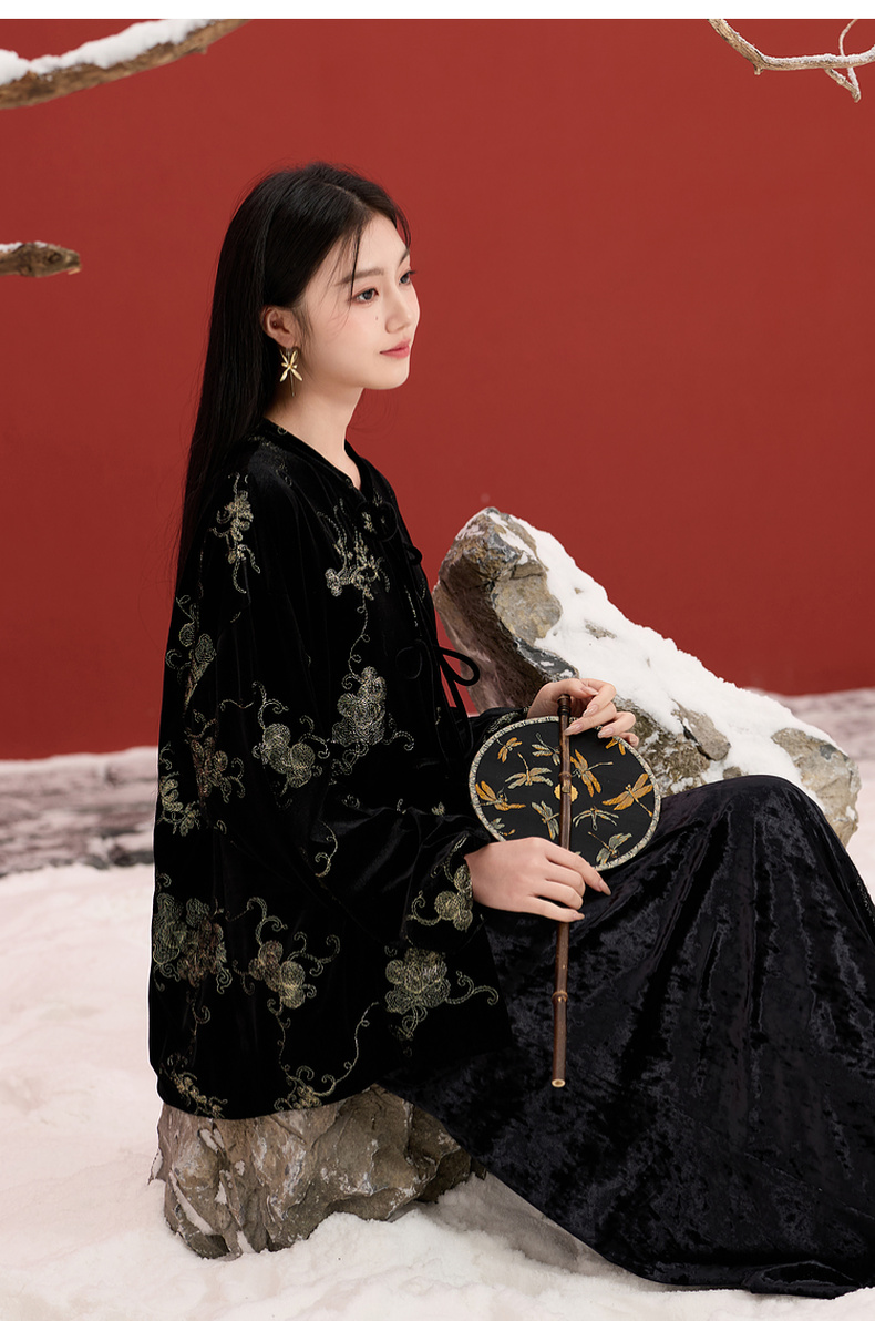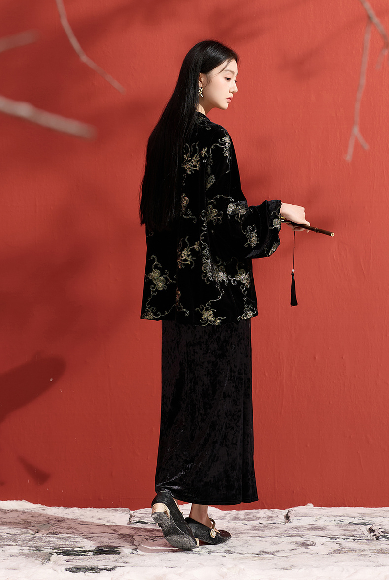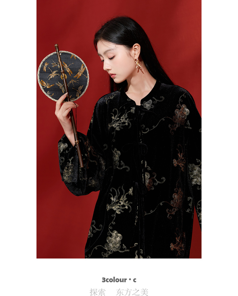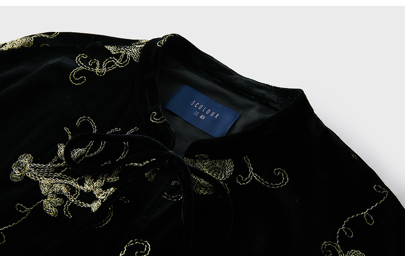 三彩【落日熔金】2025冬季新款绣花丝绒外套灯笼袖上衣C