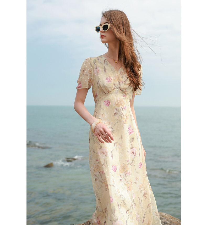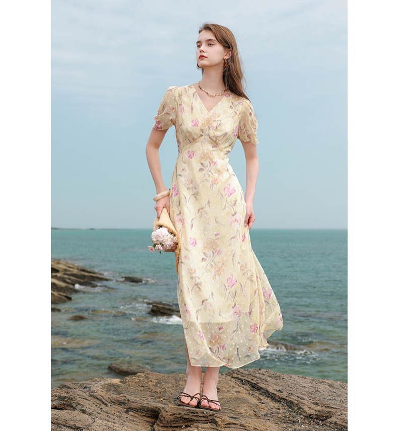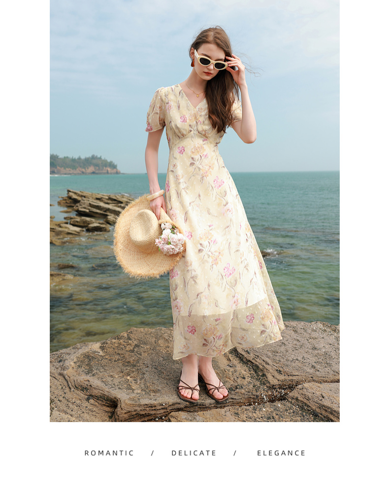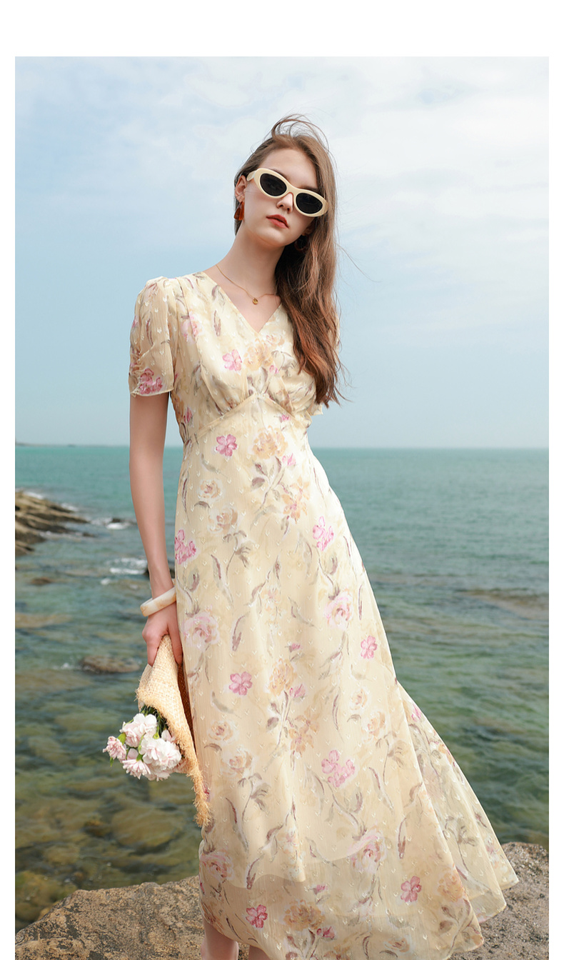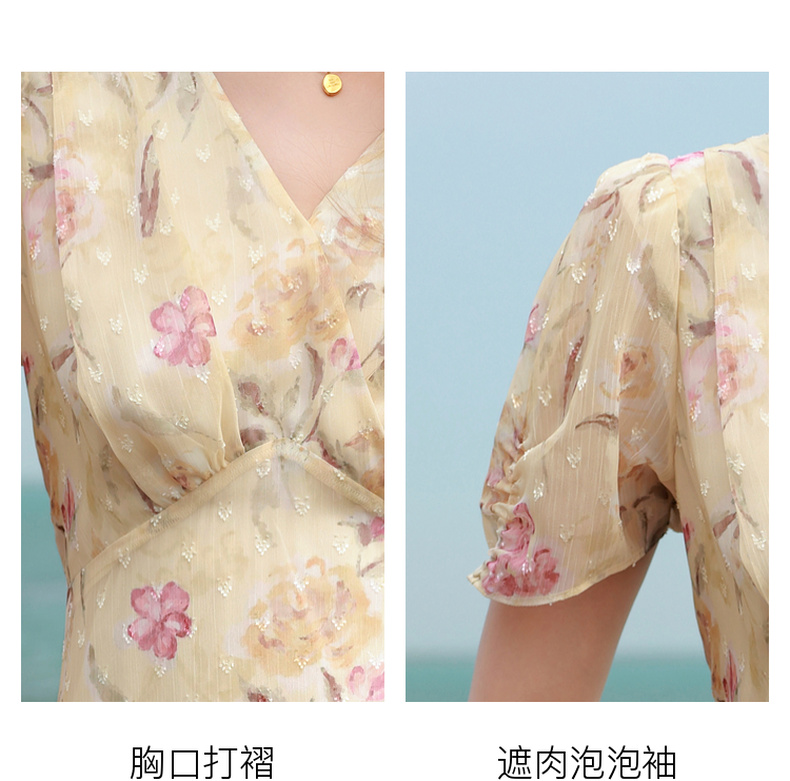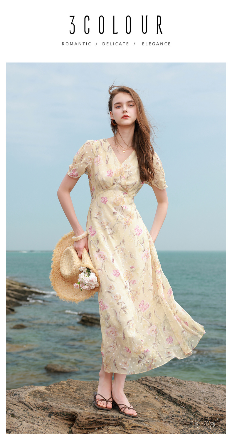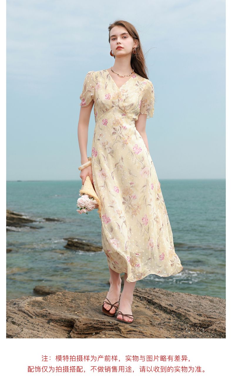 三彩2025夏季新款法式碎花裙剪花V领收腰A字裙泡泡袖长裙浪漫M