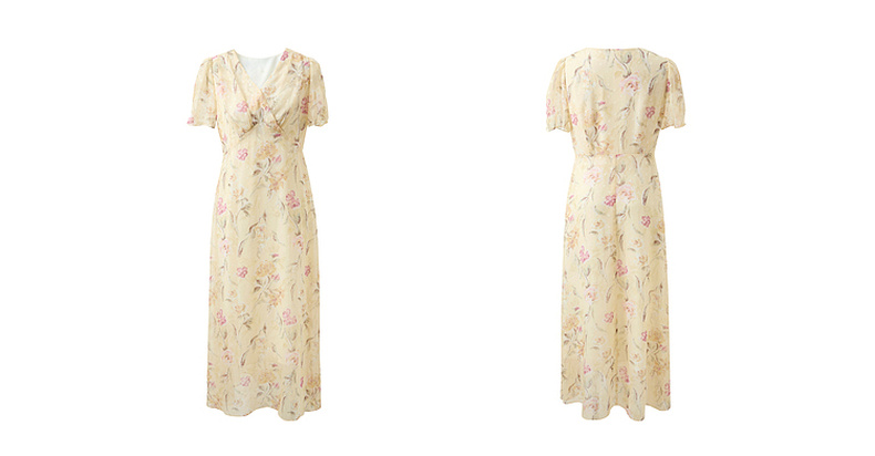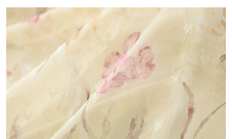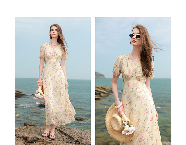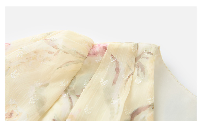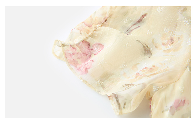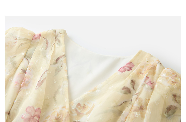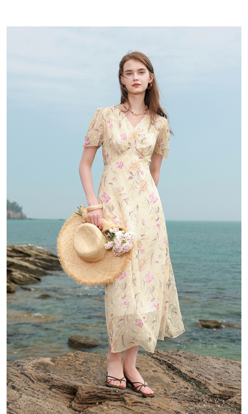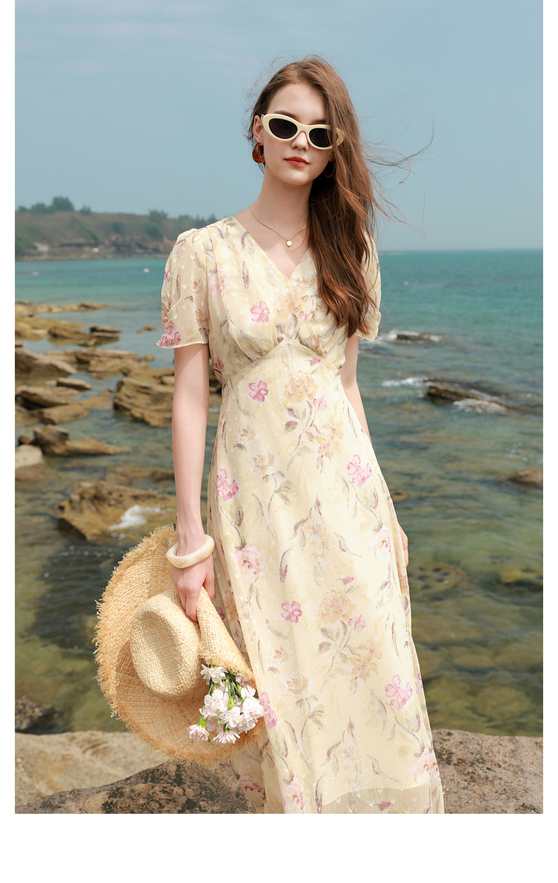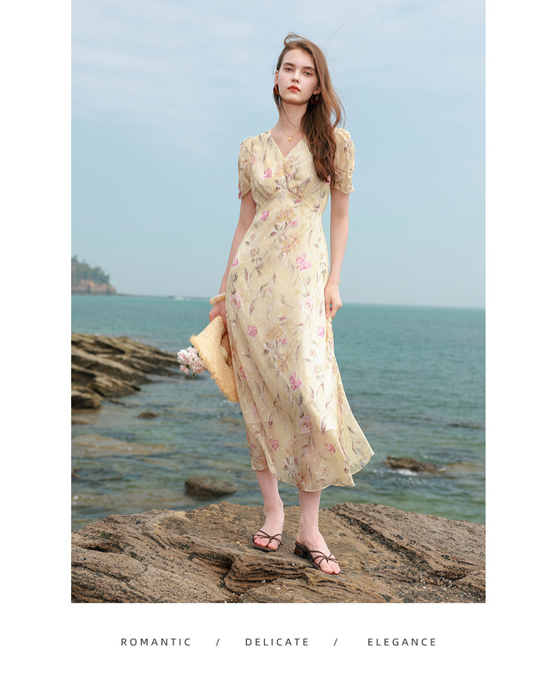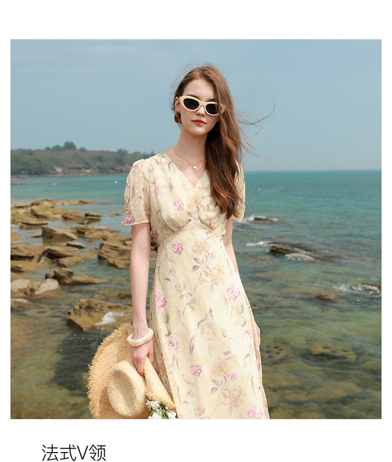 三彩2025夏季新款法式碎花裙剪花V领收腰A字裙泡泡袖长裙浪漫M