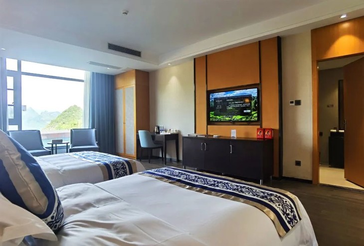 观景房位于 3 - 5 楼(无电梯,平层为三楼 ),面积 32 - 40 平左右,配备 2 张 1.35 米双人床,推窗即可直面万峰林壮丽景致,将山水画卷融入旅居日常 。