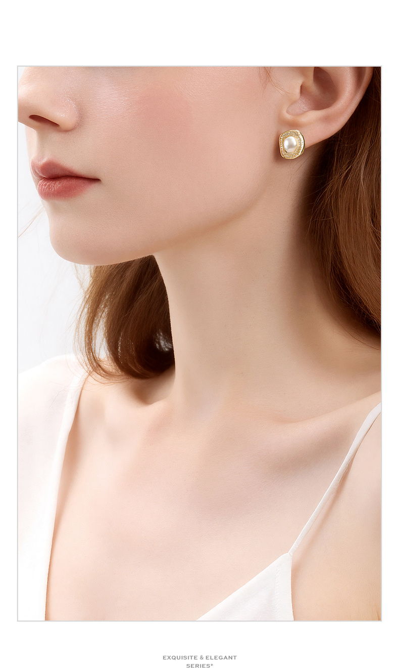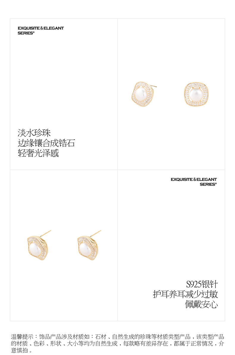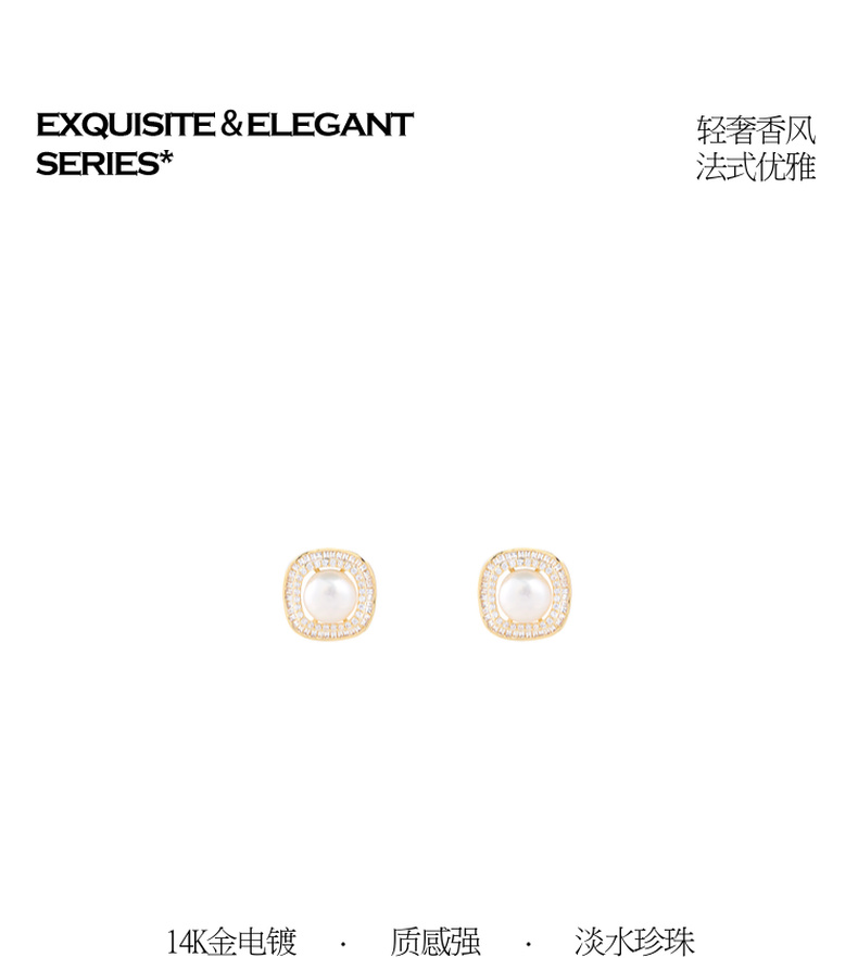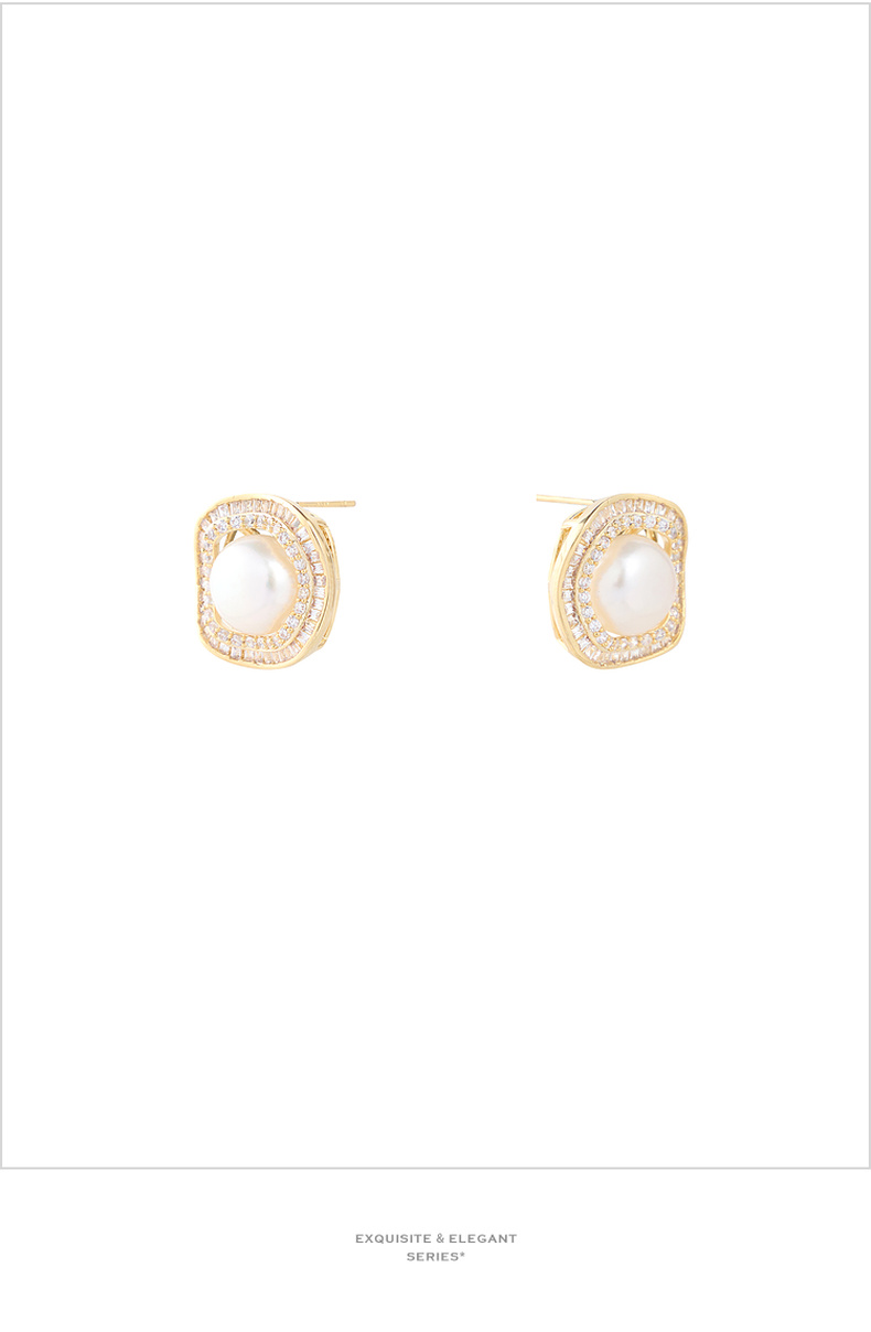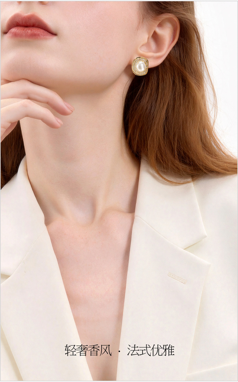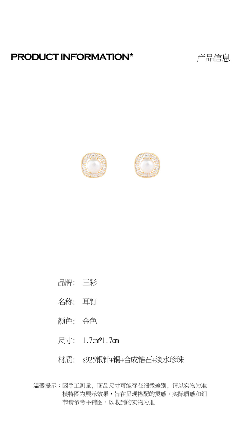三彩2026新款淡水珍珠镶锆石方形耳钉S925银针轻奢优雅复古贵气