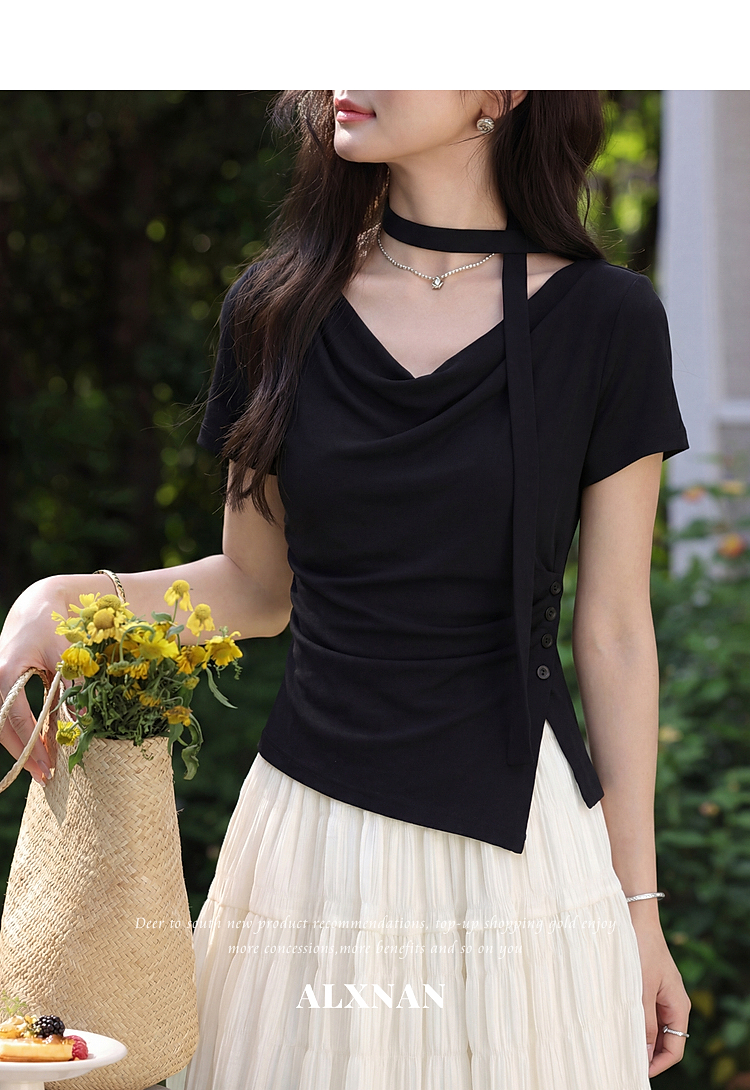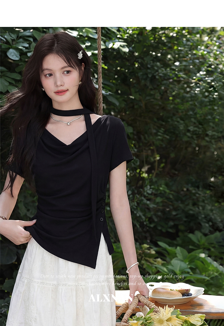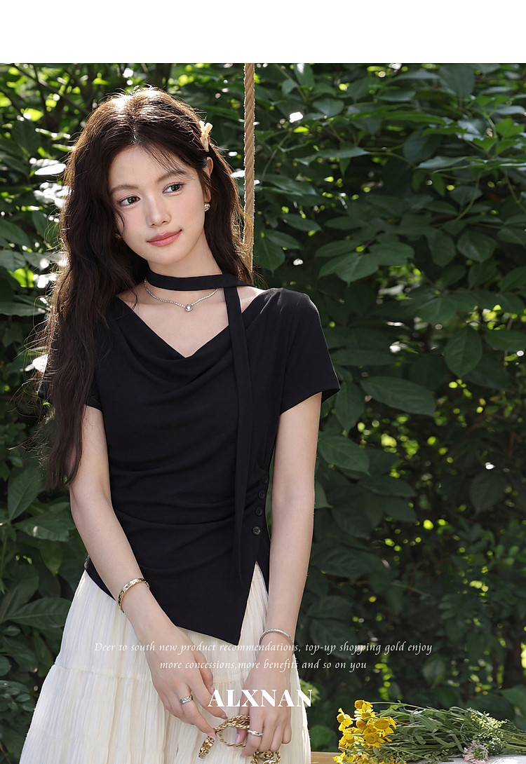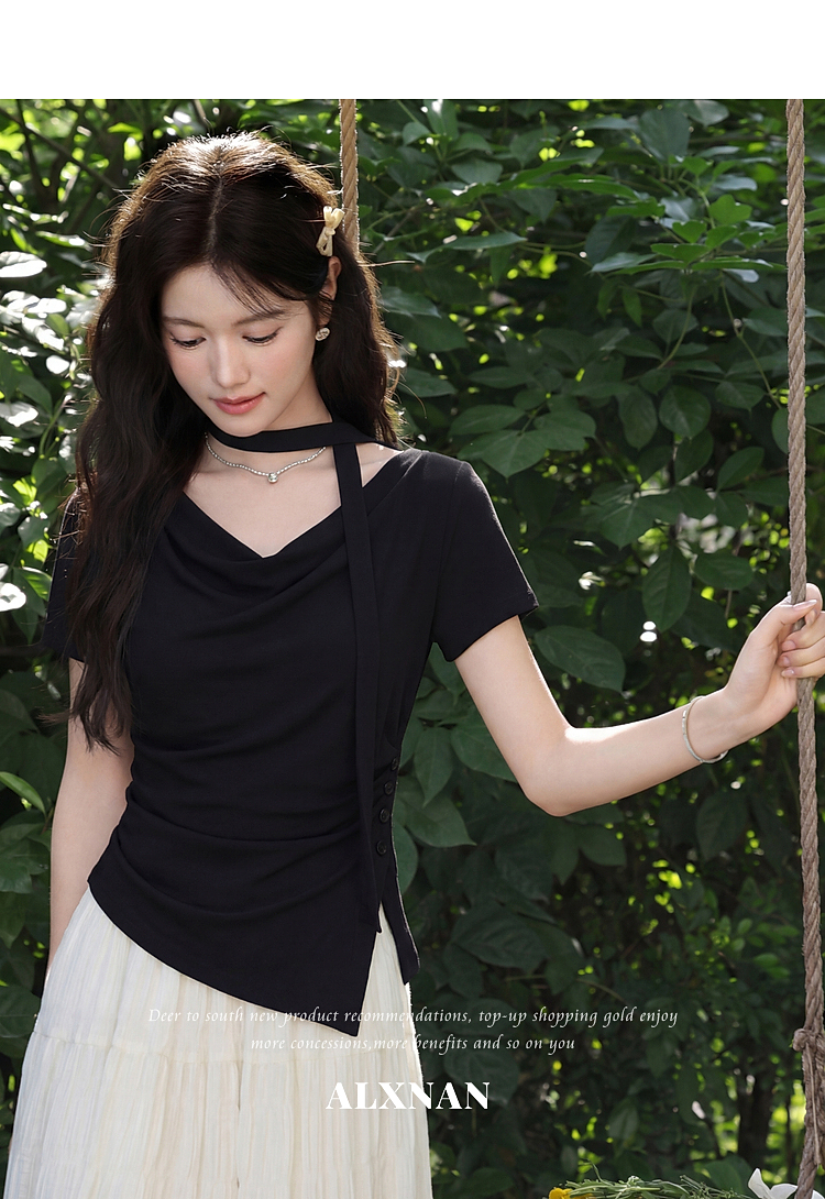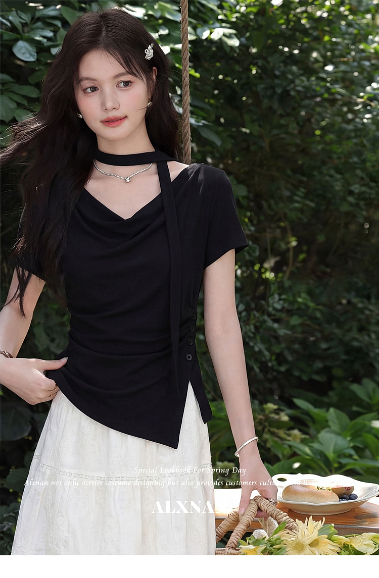 鹿向南「漫光叙夏」黑色短袖T恤女夏季高端小资不规则修身小上衣