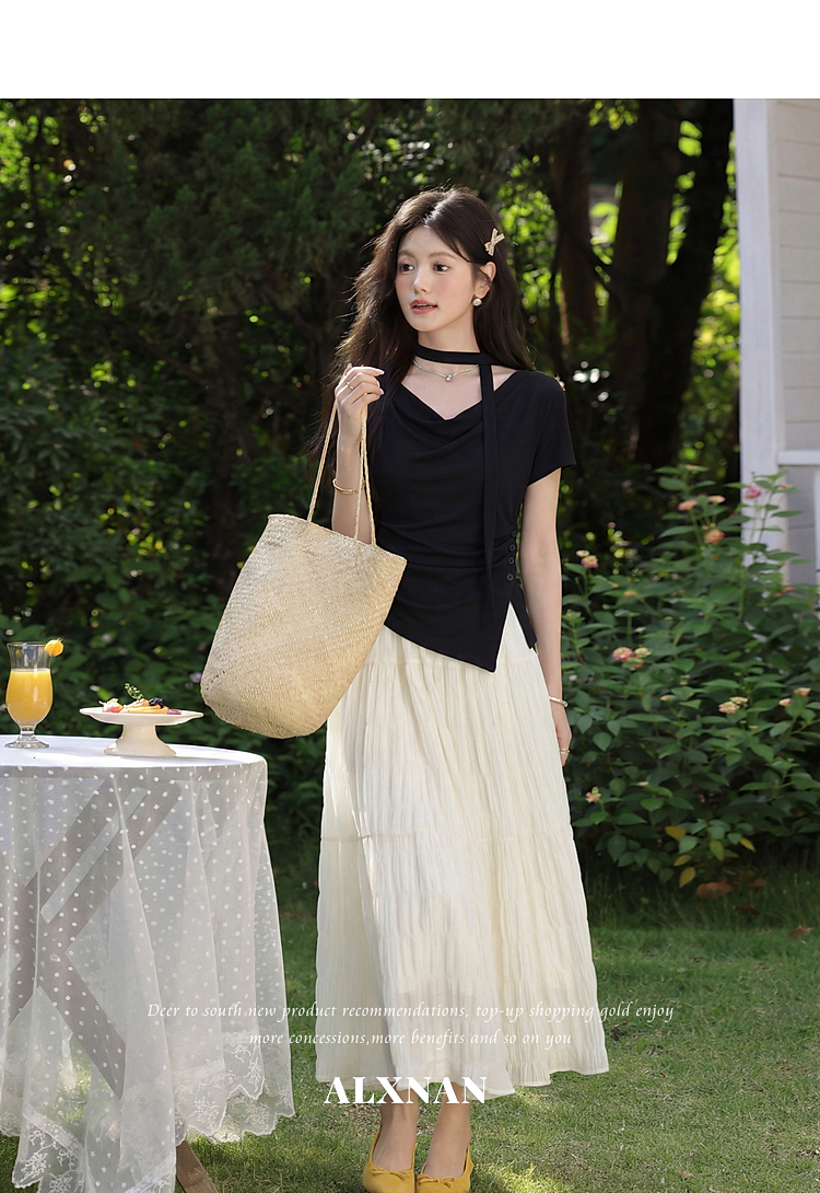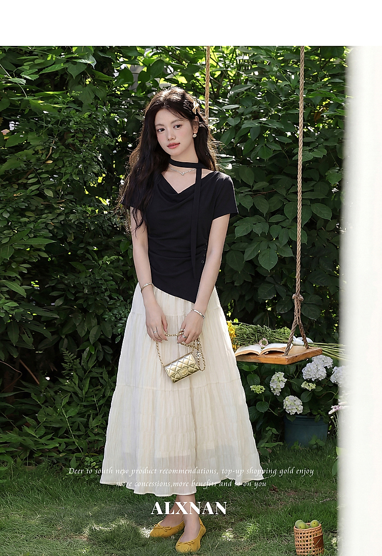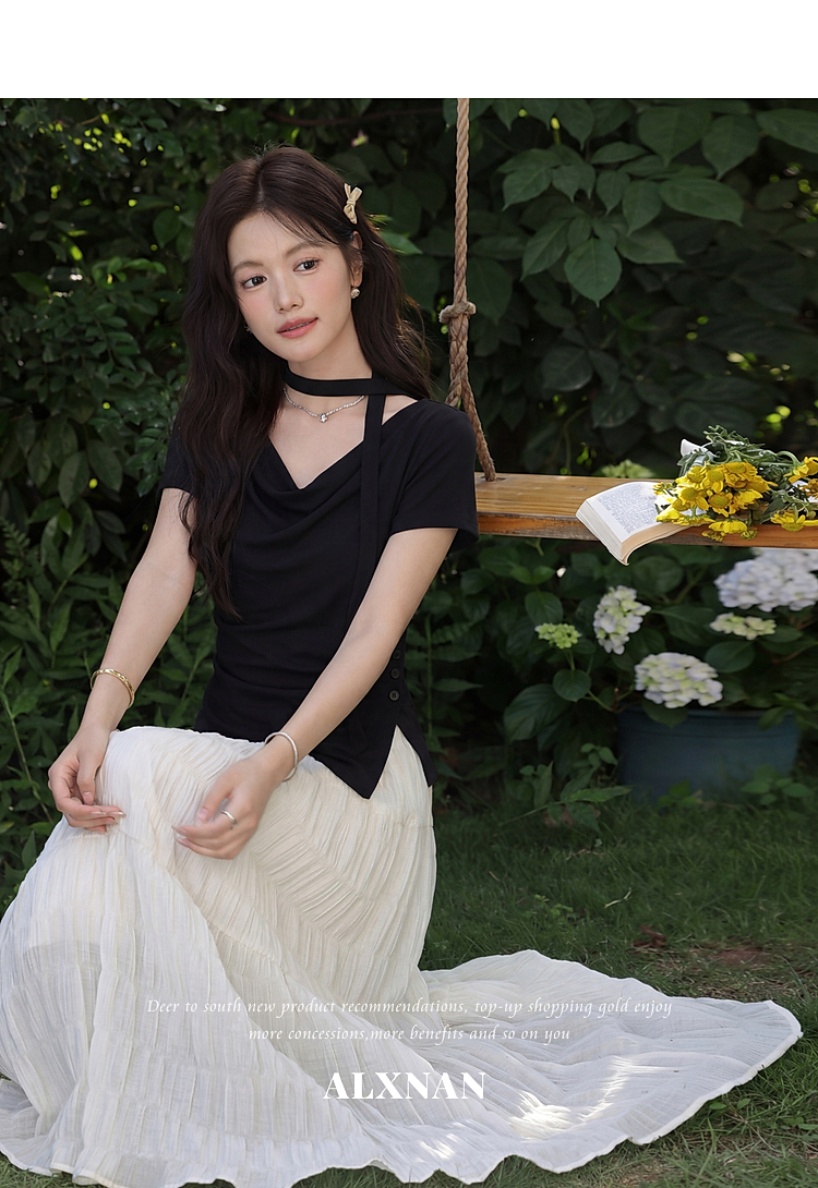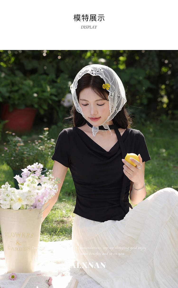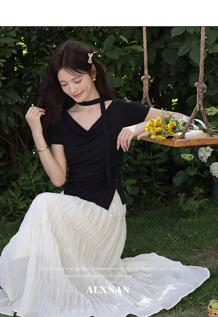 鹿向南「漫光叙夏」黑色短袖T恤女夏季高端小资不规则修身小上衣