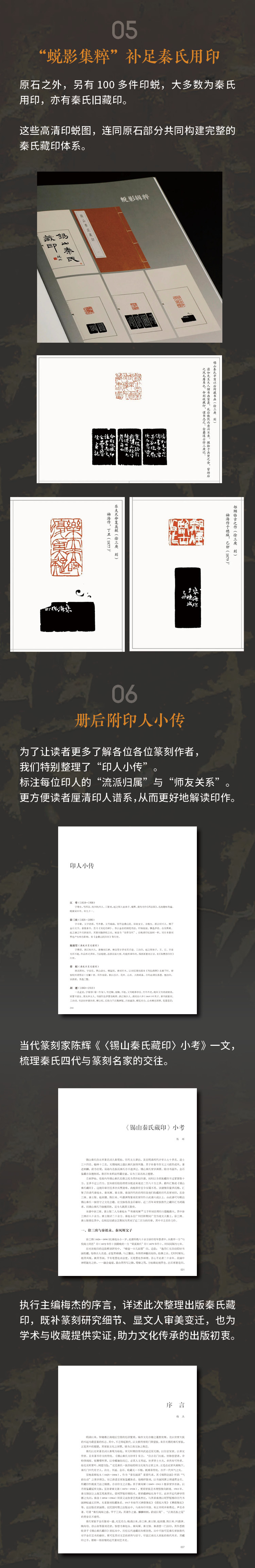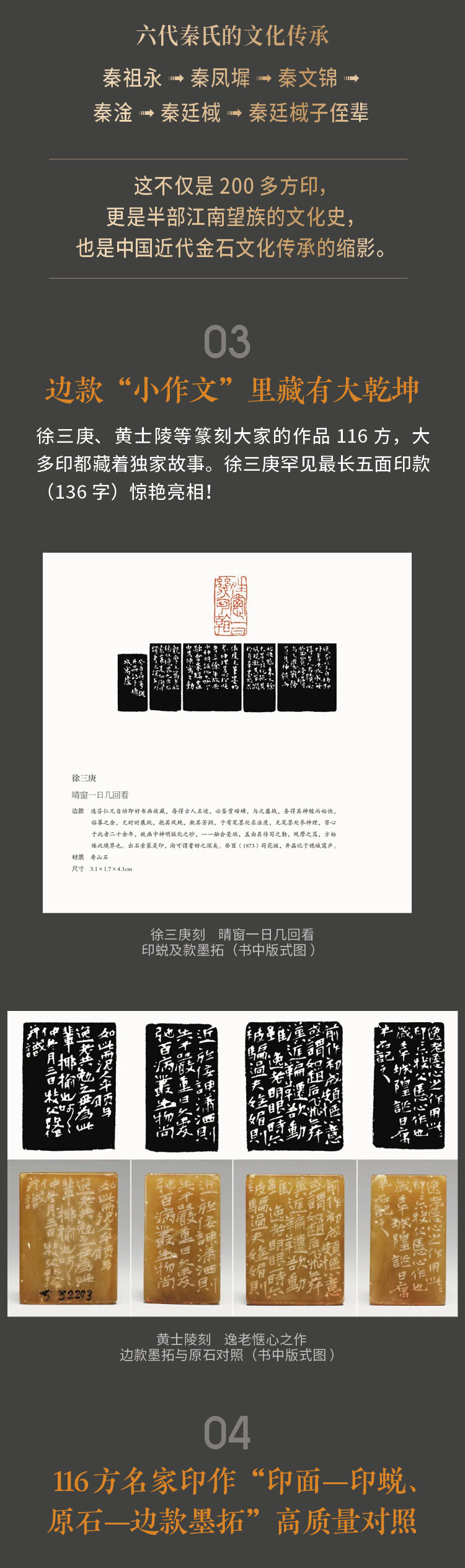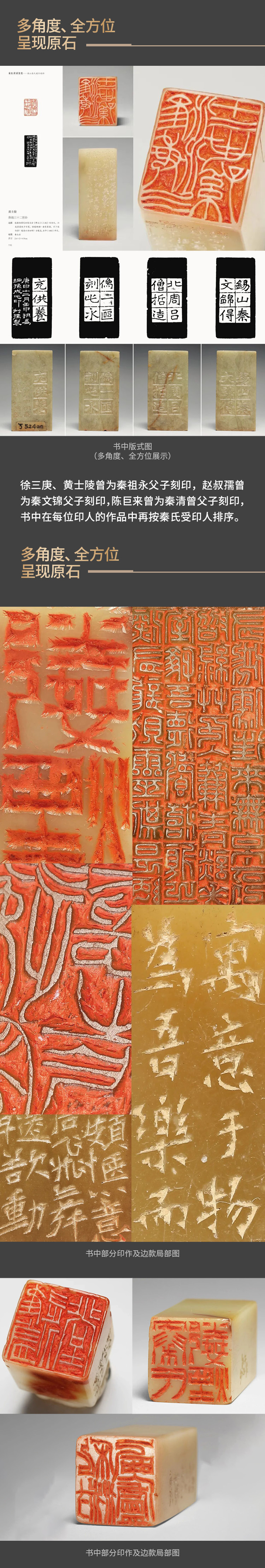 这些印章不仅石料上乘,篆刻精良,更承载着秦氏家族的文化记忆与精神追求,尽显江南大族的非凡底蕴。本书以高清图版的形式,全方位呈现印面、原石、印蜕、边款墨拓的全貌。从印文的精妙布局、刀锋的细微转折,到石料的天然纹理、边款的独特韵味,精准还原高清细节。另有精彩印面及边款部分放大呈现,纤毫毕现。一册在手,畅览方寸乾坤。