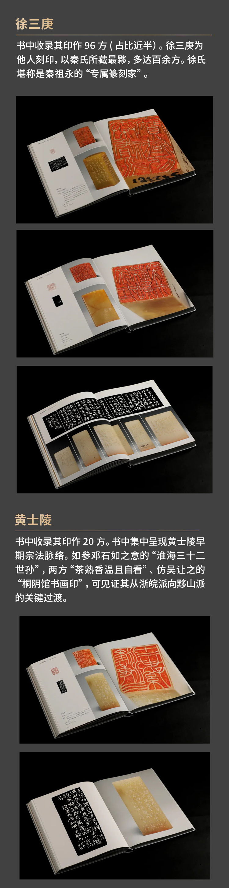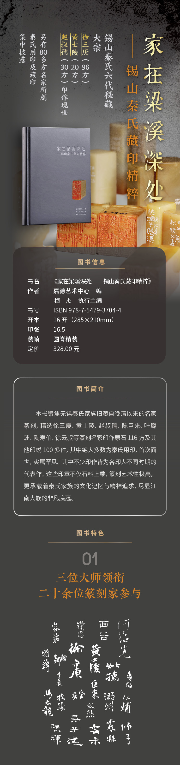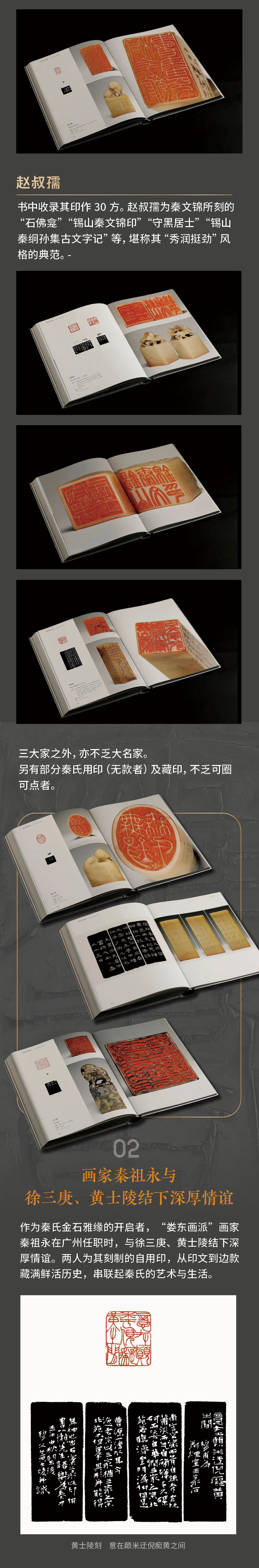 这些印章不仅石料上乘,篆刻精良,更承载着秦氏家族的文化记忆与精神追求,尽显江南大族的非凡底蕴。本书以高清图版的形式,全方位呈现印面、原石、印蜕、边款墨拓的全貌。从印文的精妙布局、刀锋的细微转折,到石料的天然纹理、边款的独特韵味,精准还原高清细节。另有精彩印面及边款部分放大呈现,纤毫毕现。一册在手,畅览方寸乾坤。